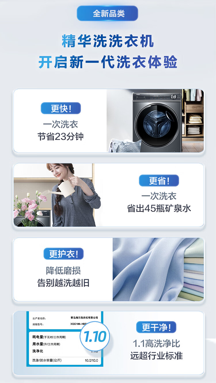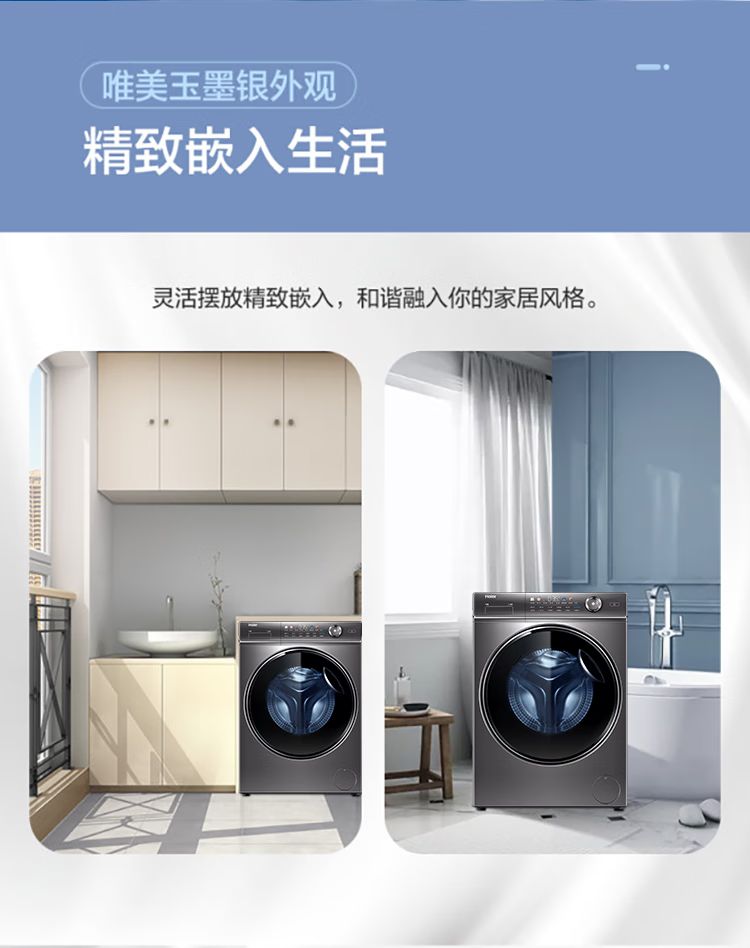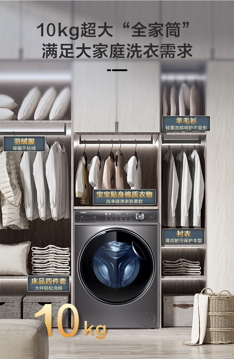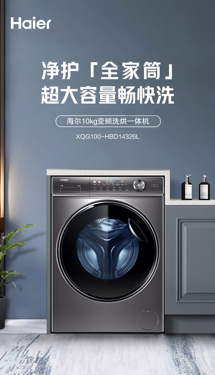 【精华洗】海尔10KG全自动变频滚筒洗衣机家用大容量525mm筒径精华洗智能投放除菌空气洗烘一体XQG100-HBD14326L