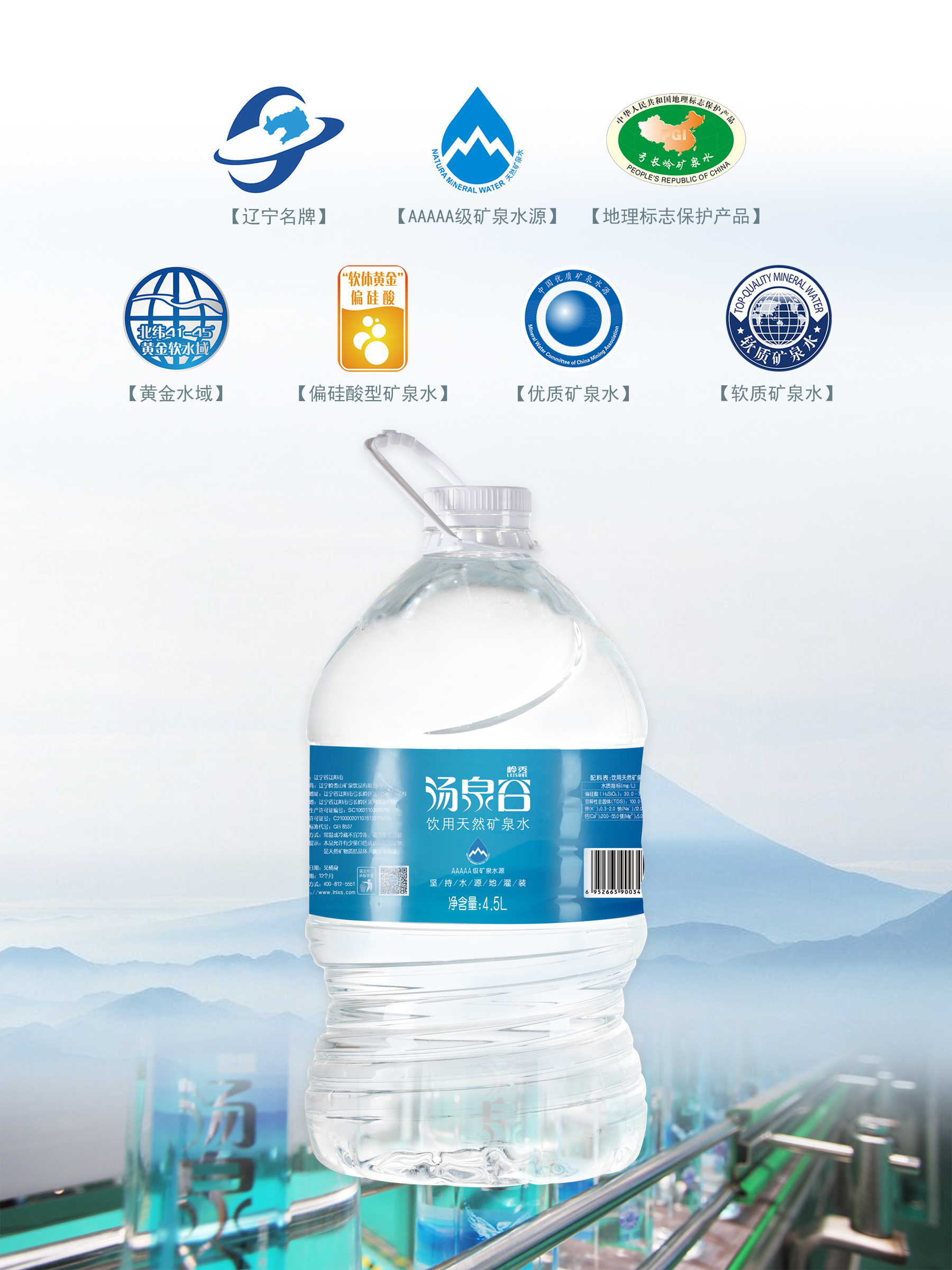 汤泉谷饮用天然矿泉水,汲取自北纬41°至45°黄金软水域水源,处在可与阿尔卑斯山天然矿泉比肩媲美的地球黄金纬度水资源区间,长白山西麓新太古代,花岗岩断裂破碎带,经长期地下循环过滤形成,是低钠、低矿化度、重碳酸钙的偏硅酸型矿泉水,尤其富含“偏硅酸”,其含量高出国家标准近一倍,具有优于普通矿泉的柔韧特质,维系身体血管通道的畅通活力,让全身及时获得养分,多种人体所需的天然珍稀矿物质及微量元素,适宜长期饮用。