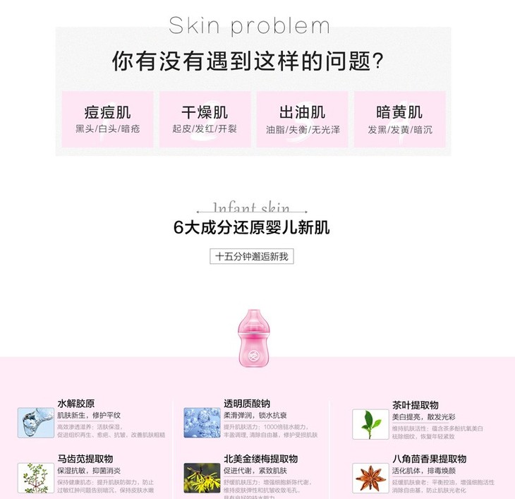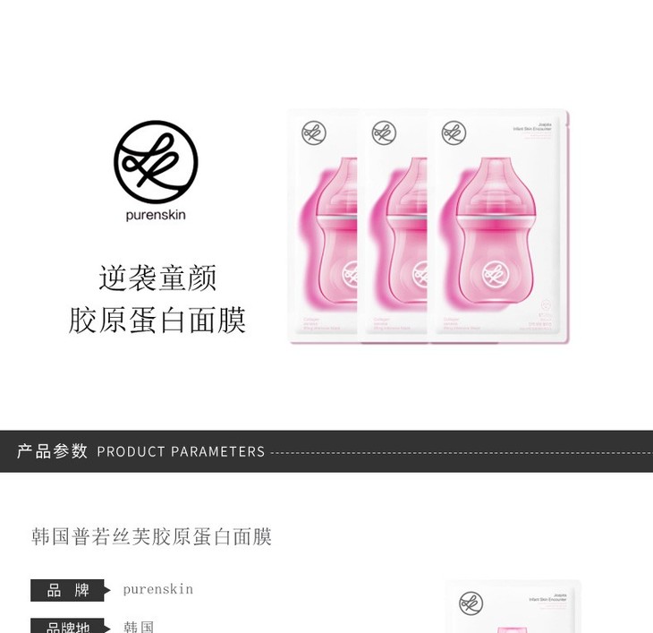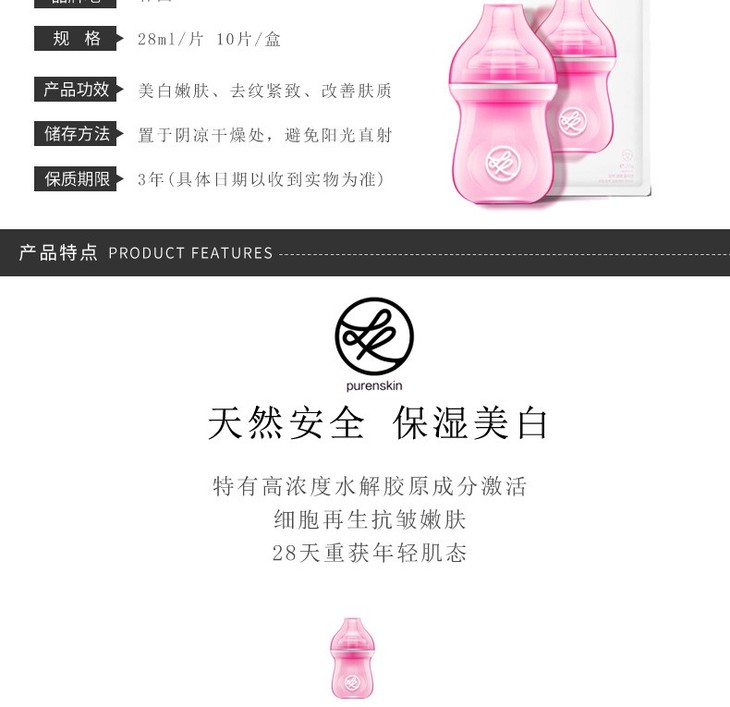 PURENSKIN/普若丝芙 胶原蛋白奶瓶面膜面膜 10片 1.奶瓶影响暗示面膜修复功能,28天回到婴儿肌肤状态。 2.6大成分助力肌肤28天重塑,逆袭婴儿肌。 3.超高浓度水解胶原