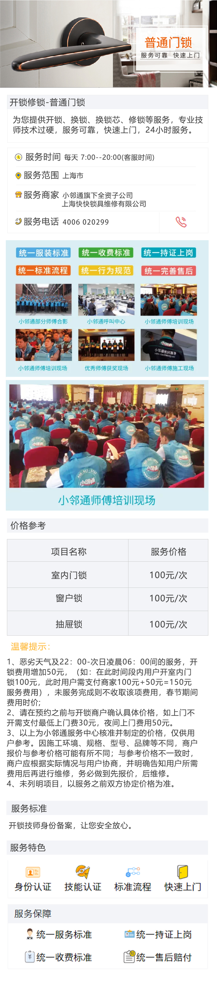 开锁上门服务时间为7:00-20:00。范围限上海区域。交通不方便地方及个别离公交站距离远的地方不保证能安排;