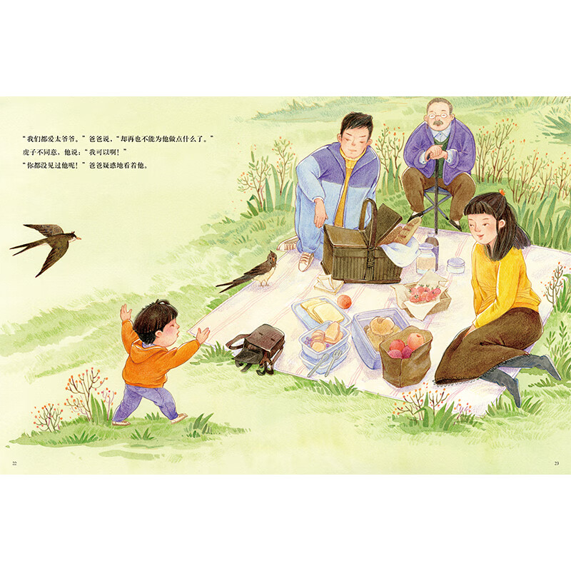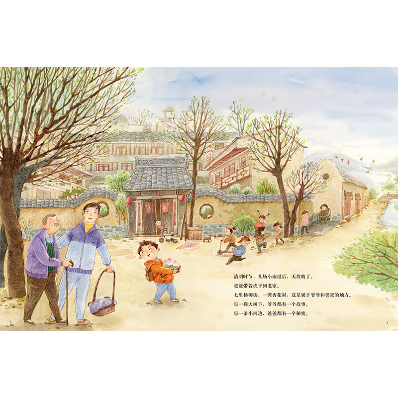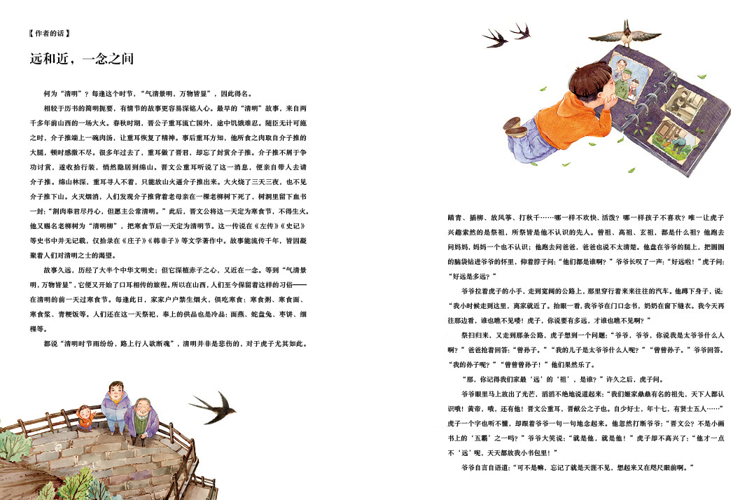 踏青、插柳、放风筝、打秋千……哪一样不欢快、活泼?哪一样孩子不喜欢?唯一让虎子兴趣索然的是祭祖,所祭皆是他不认识的先人。曾祖、高祖、玄祖,都是什么祖?他跑去问妈妈,妈妈一个也不认识;他跑去问爸爸,爸爸也说不太清楚。他盘在爷爷的腿上,把圆圆的脑袋钻进爷爷的怀里,仰着脖子问:“他们都是谁啊?”爷爷长叹了一声:“好远啦!”虎子问:“好远是多远?”