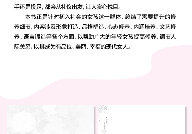 《内心强大 淡定优雅》正是针对初入社会的女孩这一群体,总结了需要提升的修养细节,内容涉及形象打造、品格塑造、心态修养、内涵培养、文艺修养、语言锻造等各个方面,以帮助广大的年轻女孩提高修养,调节人际关系,以其成为有品位、美丽、幸福的现代女人。