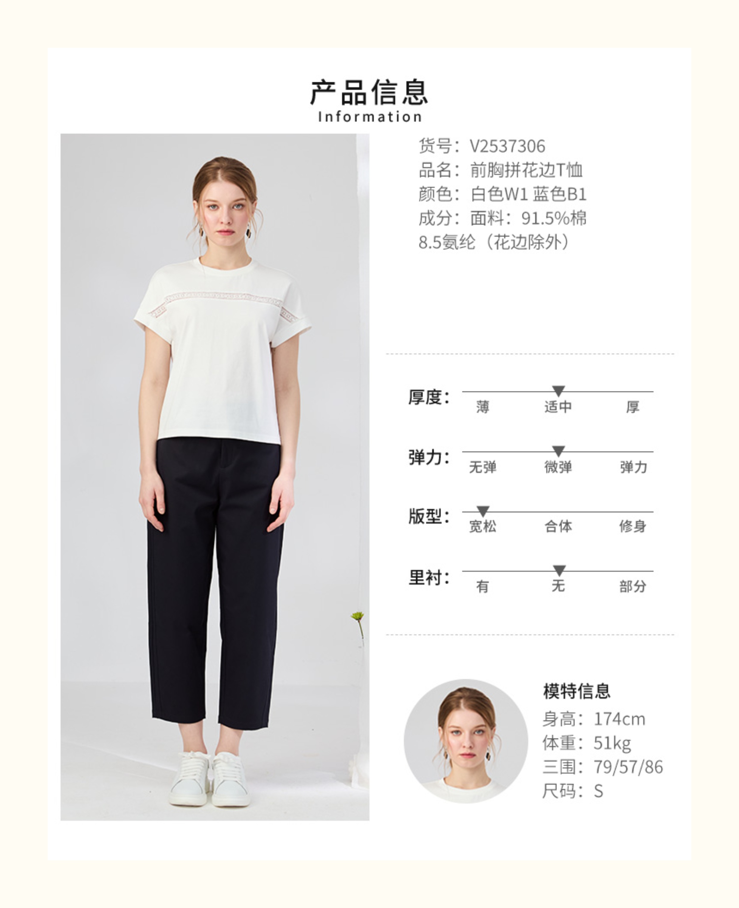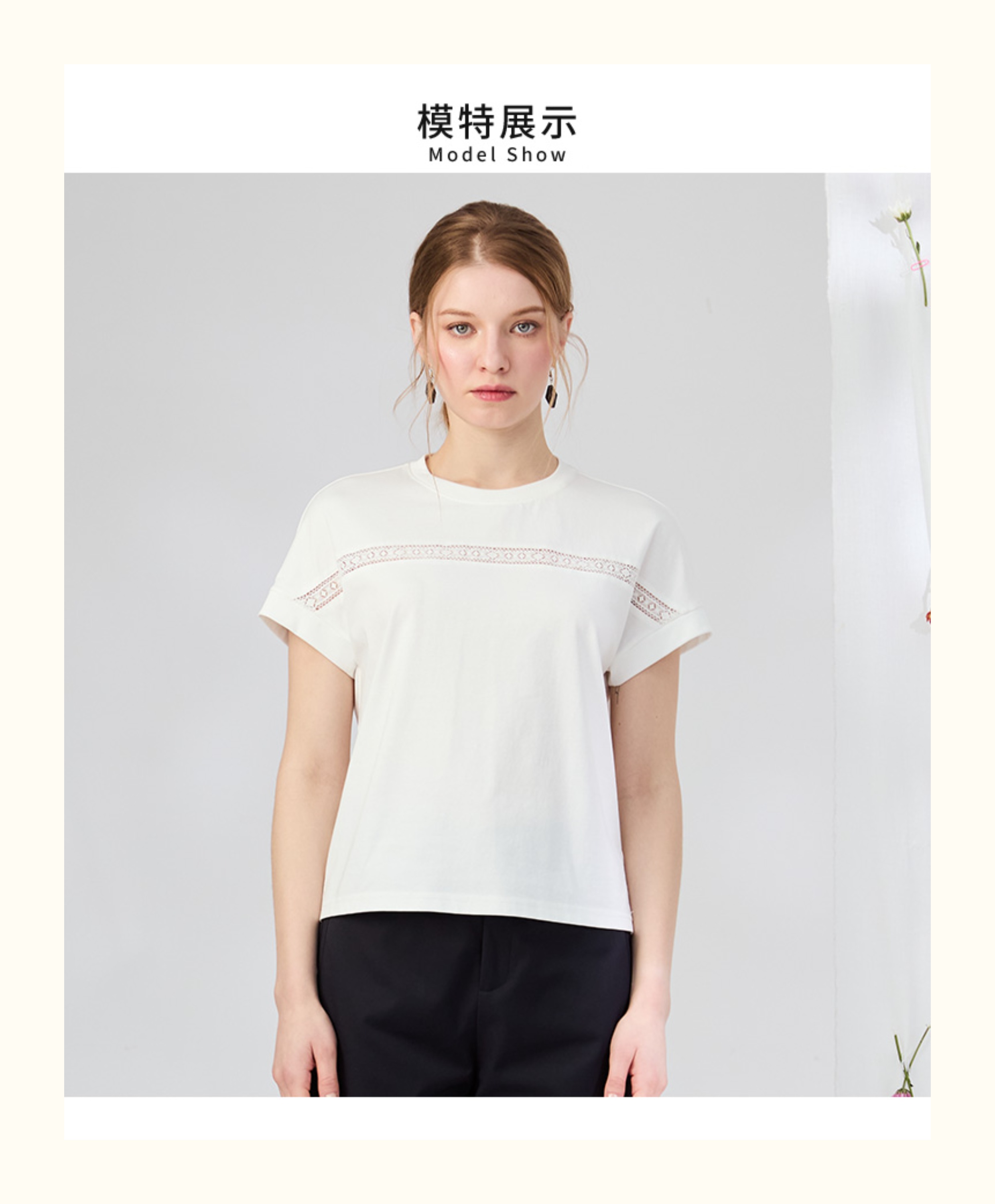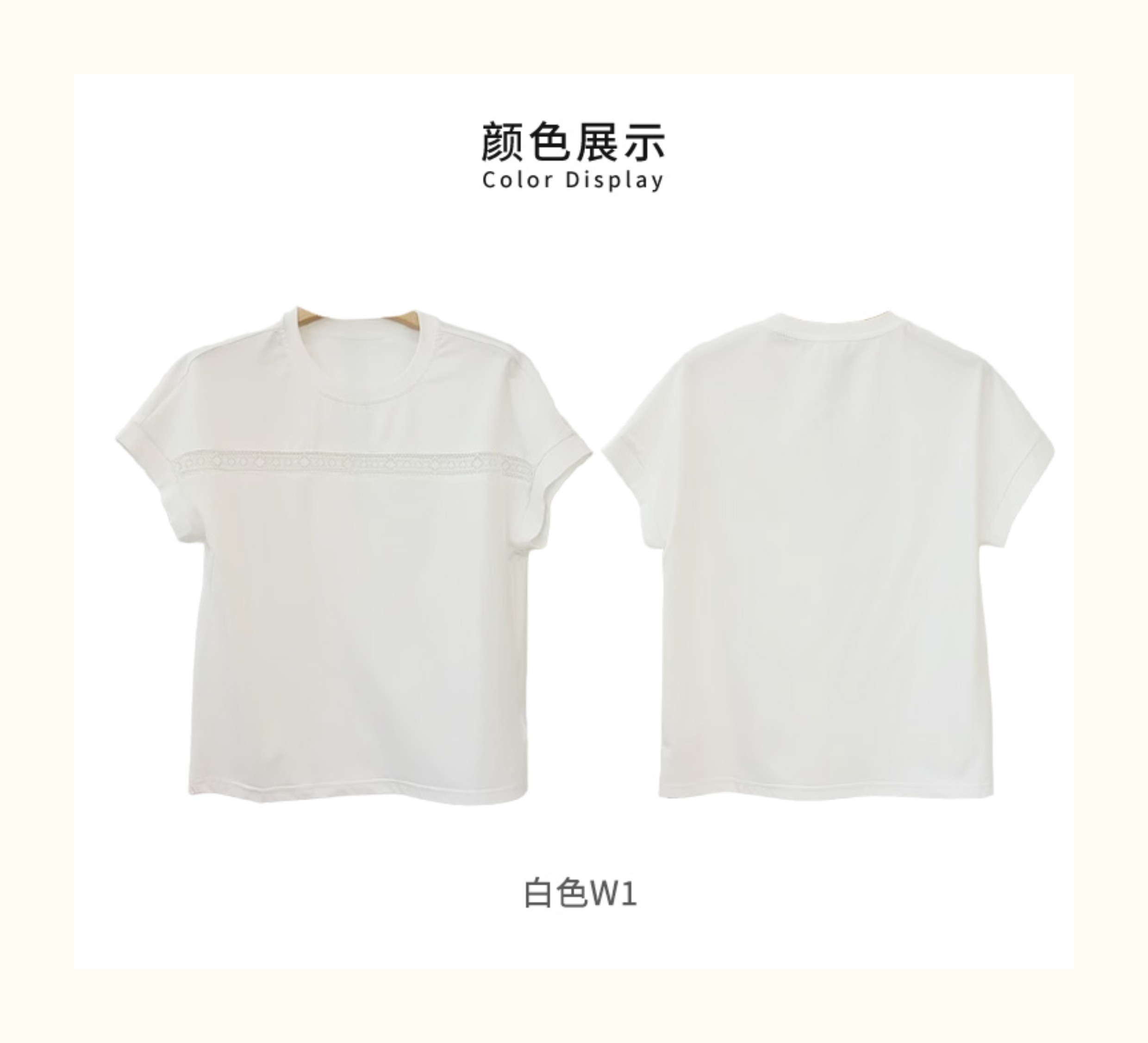 VIVIAN LIU V2537306 夏季新款圆领前胸拼花边宽松休闲短袖T恤
