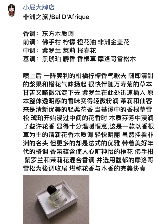 功力尚浅 我形容不出来 有点类似荒漠玫瑰的中调 压制不住的甜腻