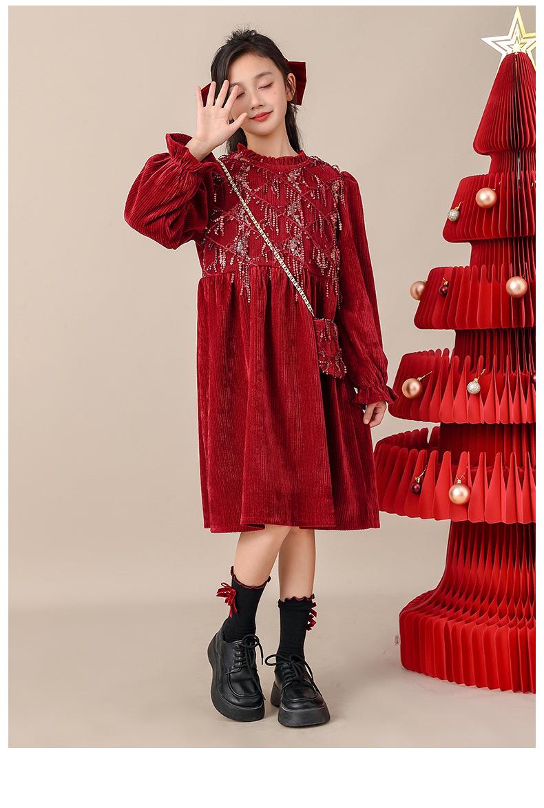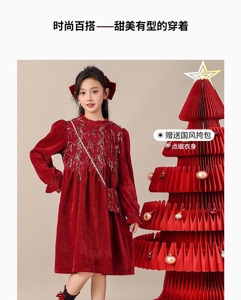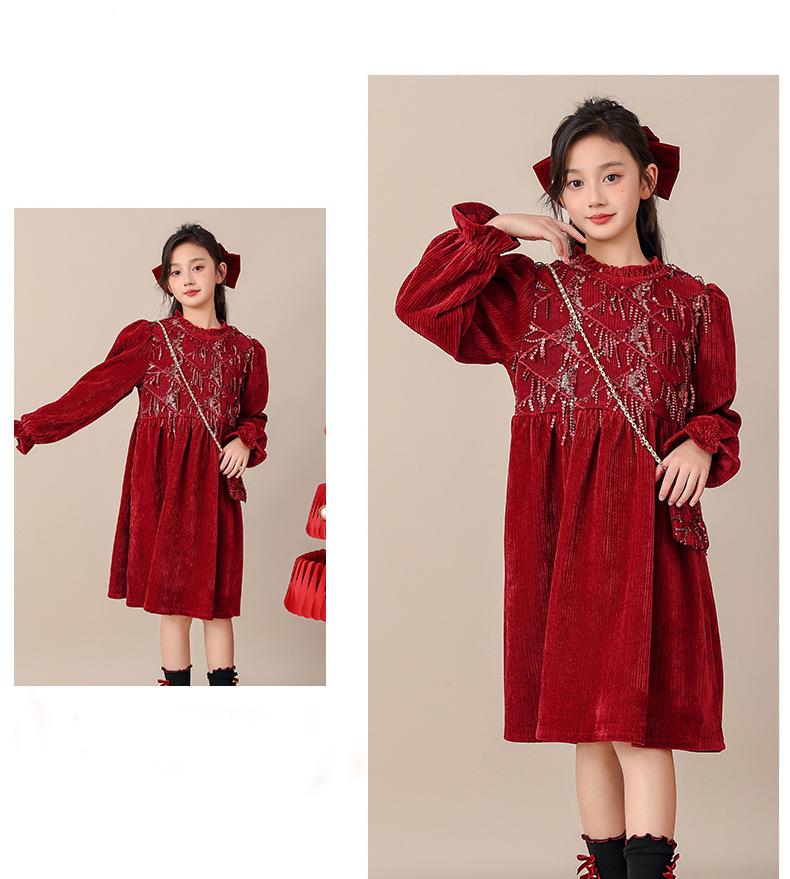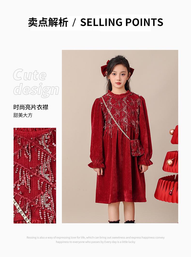 2025新款女童连衣裙流苏亮片冬装红色中大童拜年服公主裙儿童裙子
