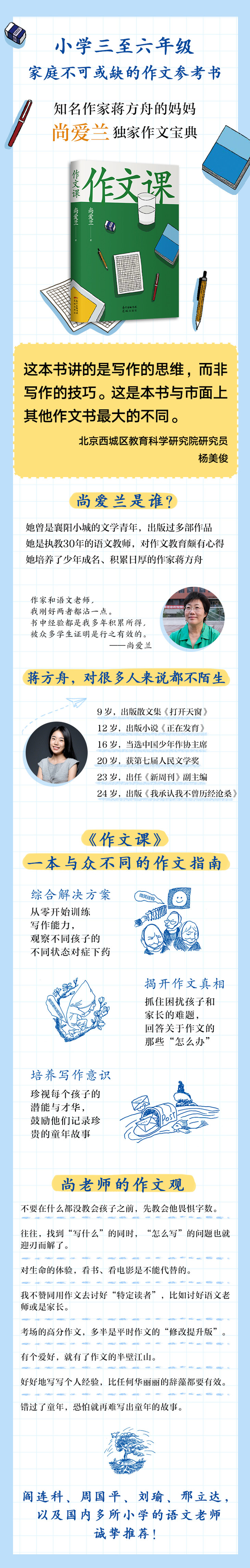 《作文课》是知名作家蒋方舟的妈妈尚爱兰,总结30年教学经验,专为7—12岁孩子精心撰写的作文指导书。