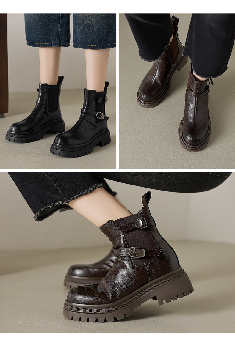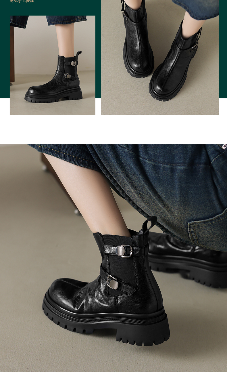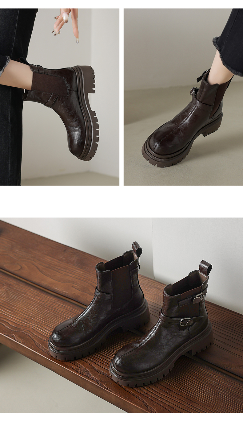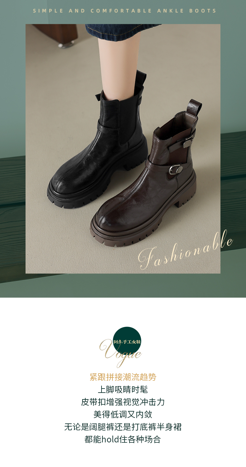 阿么手工女鞋厚底机能风秋冬短靴百搭皮带扣复古真皮切尔西靴5CM
