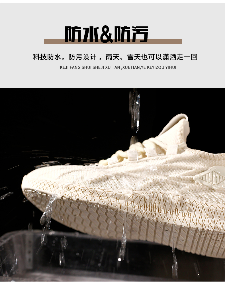 这是因为鞋面采用了市面领先的防水黑科技-仿荷叶防水防污技术,污渍和水碰到鞋面会迅速弹开,像给鞋子穿了一层防护服一样,不会脏了鞋子,下雨天也可以安心穿,打理起来也轻松