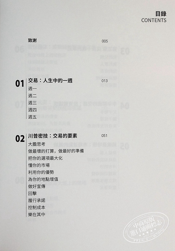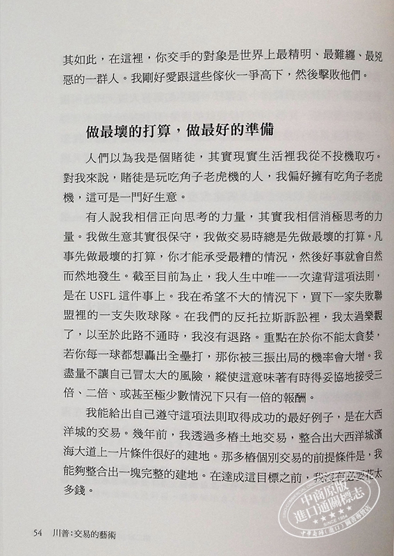 本書毫無保留地展示他如何挑戰傳統思維、利用媒體,以及如何建立自己的「品牌」,他說:「凡事先做*壞打算,這樣你才能承受*糟的情況,然後好事就會自然而然地發生。」本書讓讀者得以一窺川普做每一樁交易背後的談判藝術。