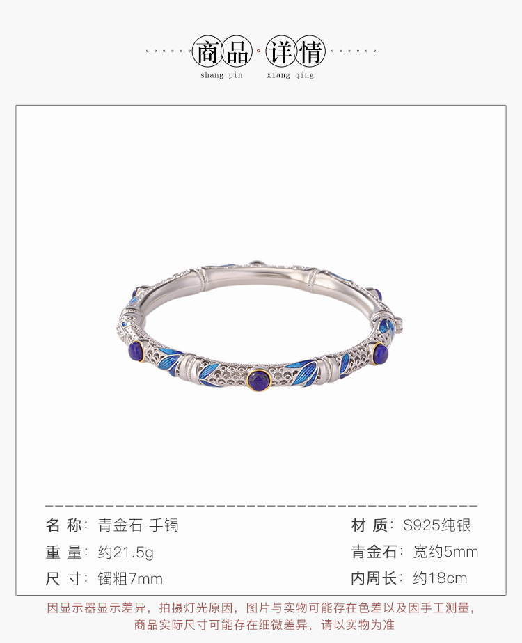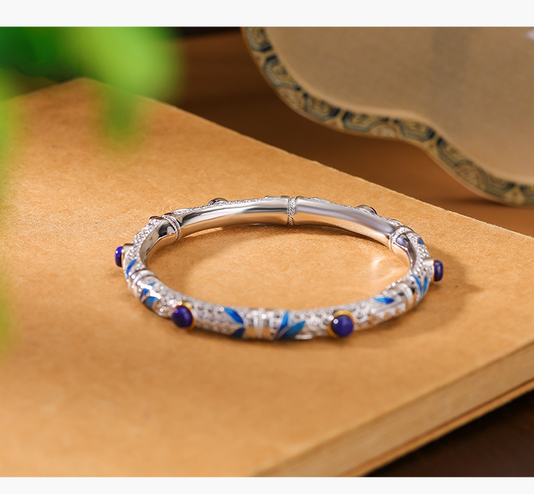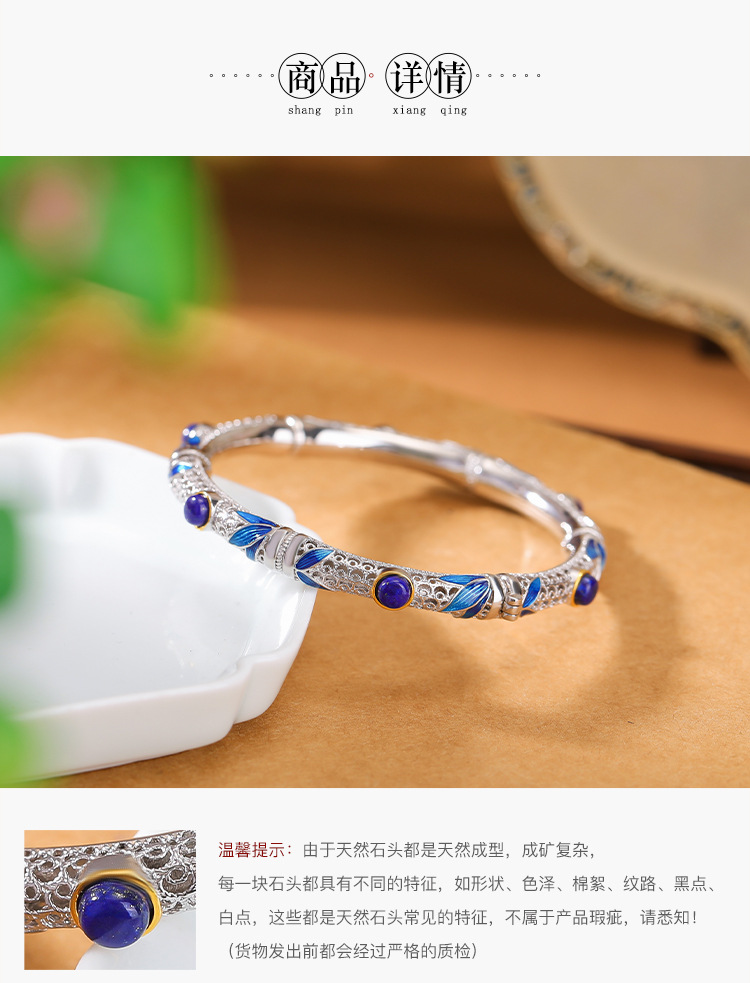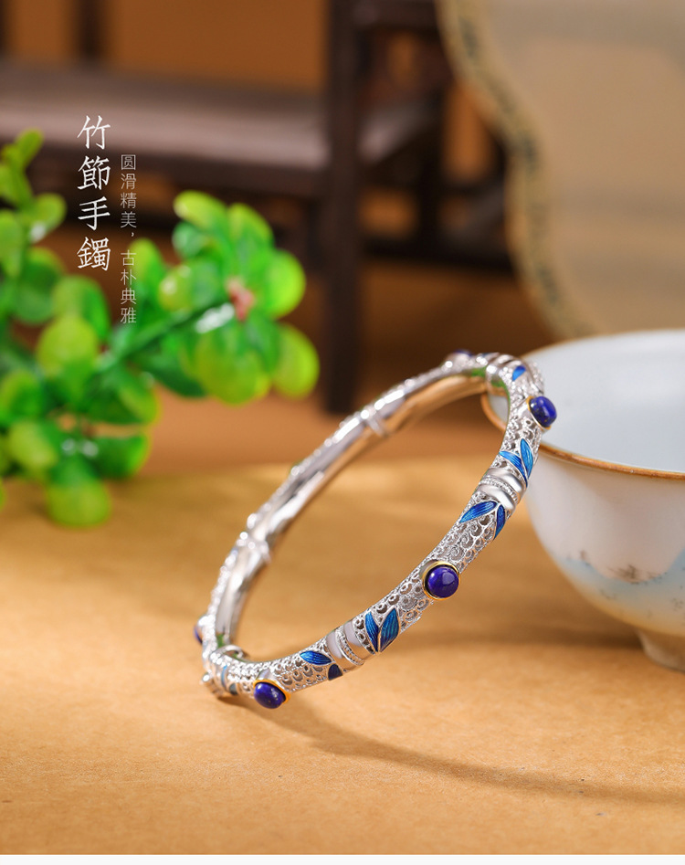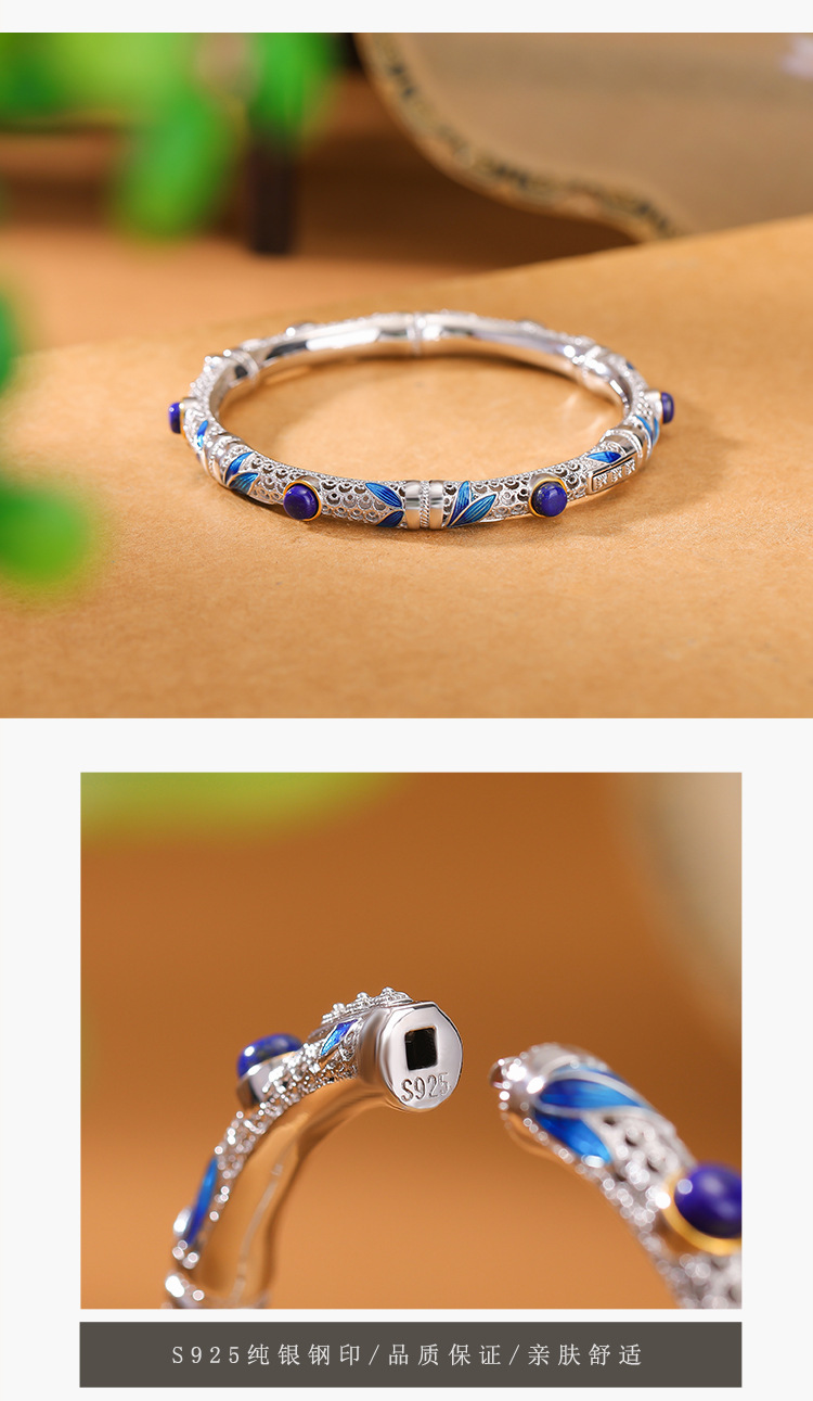 S925纯银镀金青金石珐琅竹节竹叶镂空圆珠手镯手环CW
