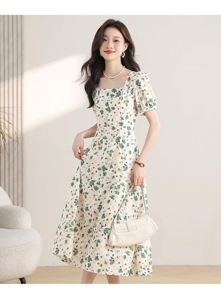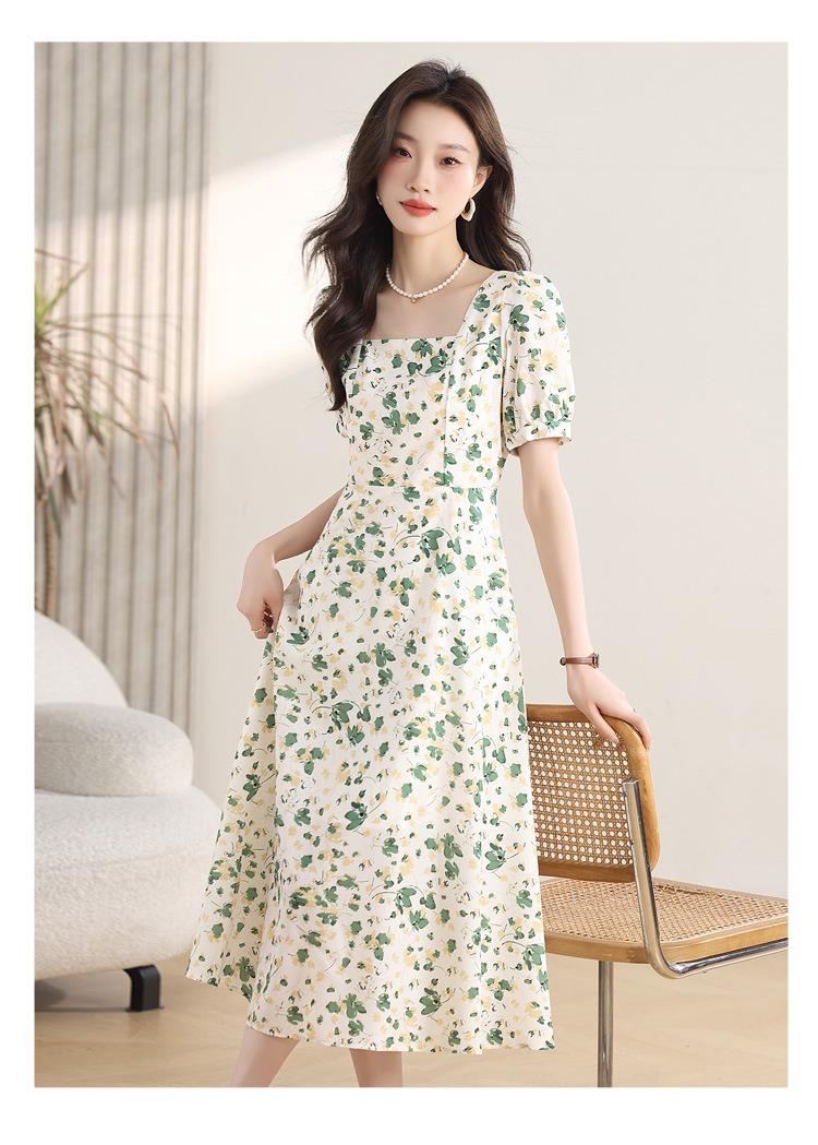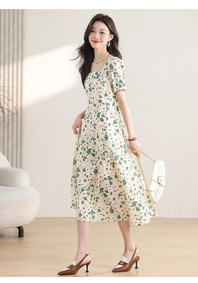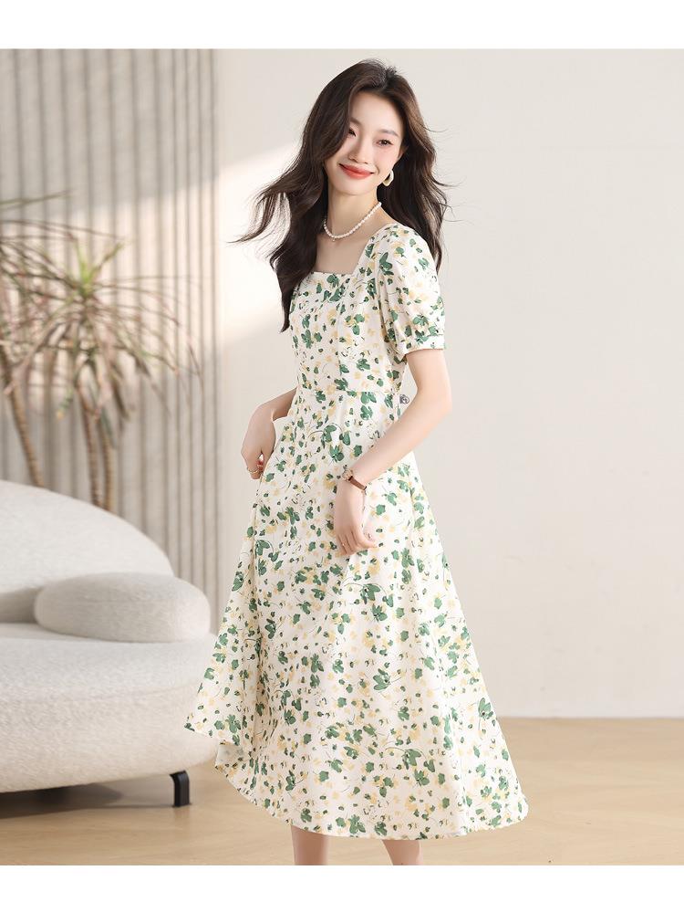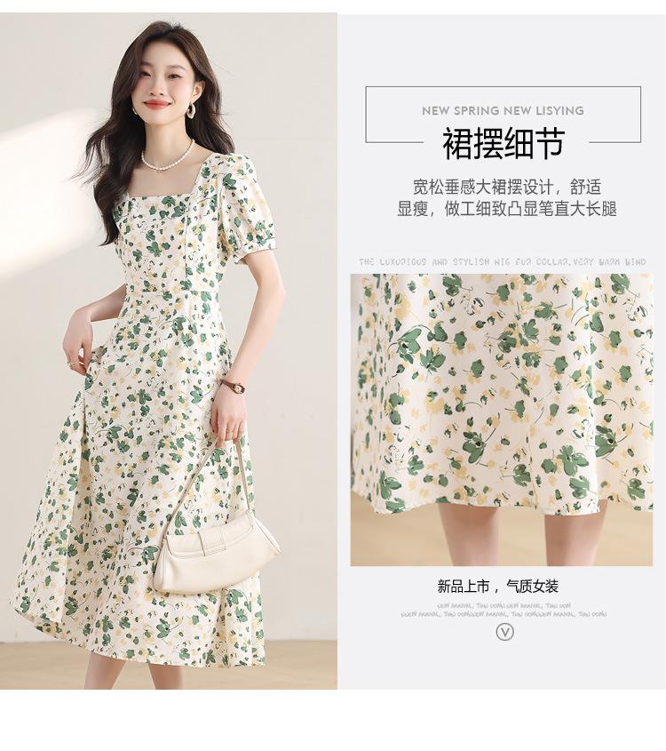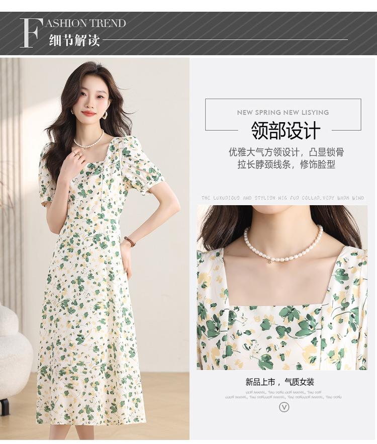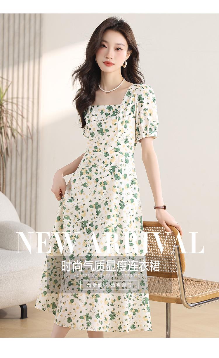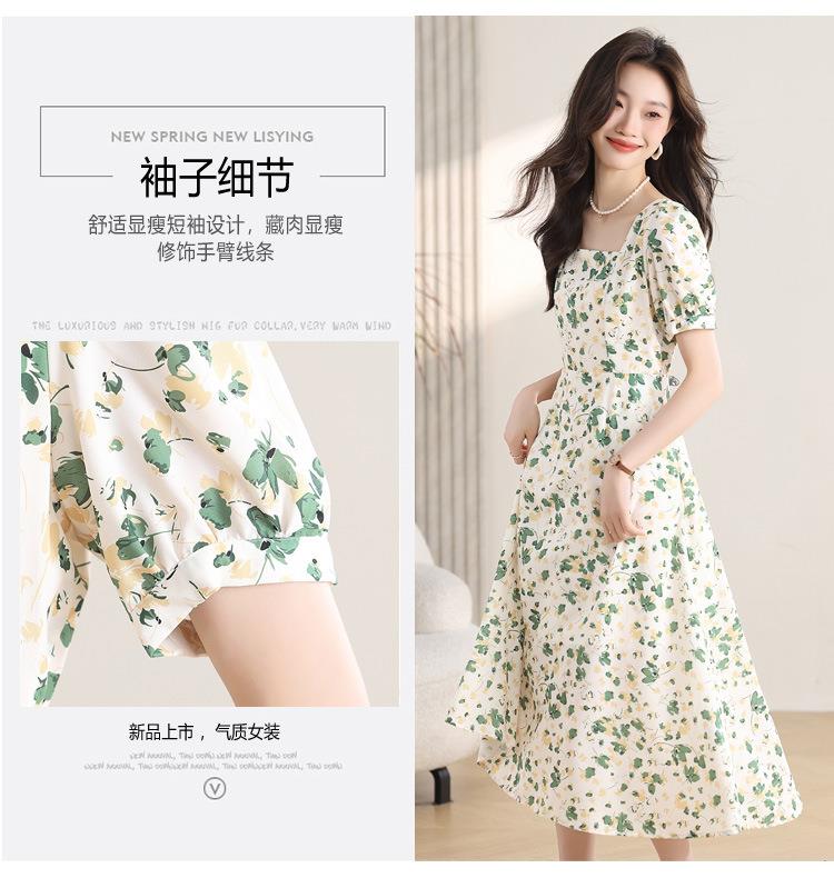 绿色碎花连衣裙女夏2024新款小个子显瘦气质方领a字雪纺仙女裙子
