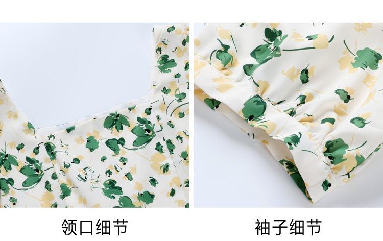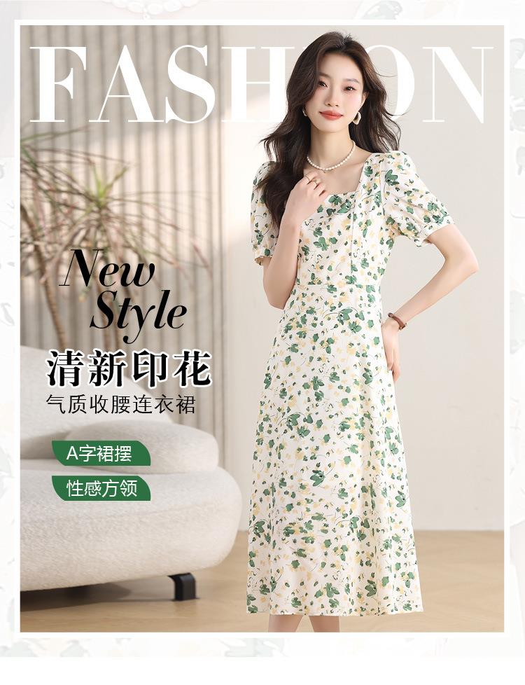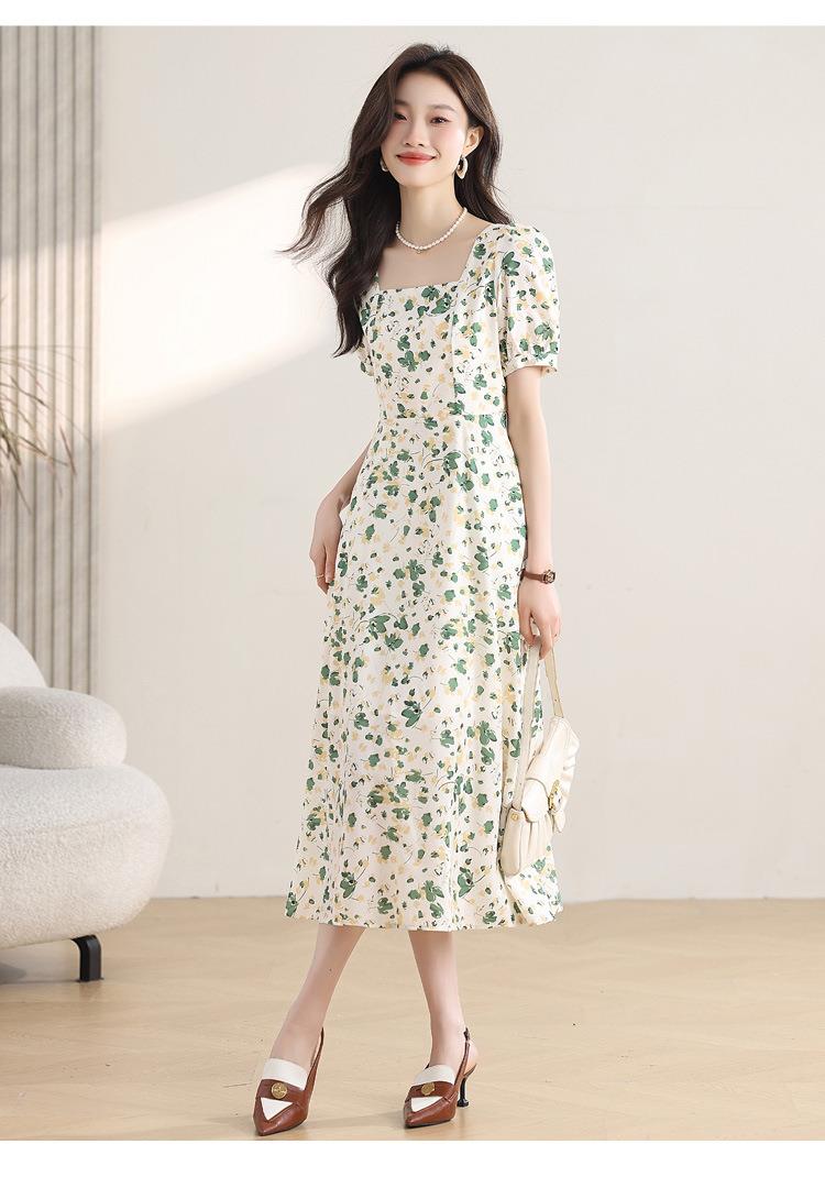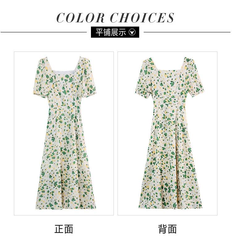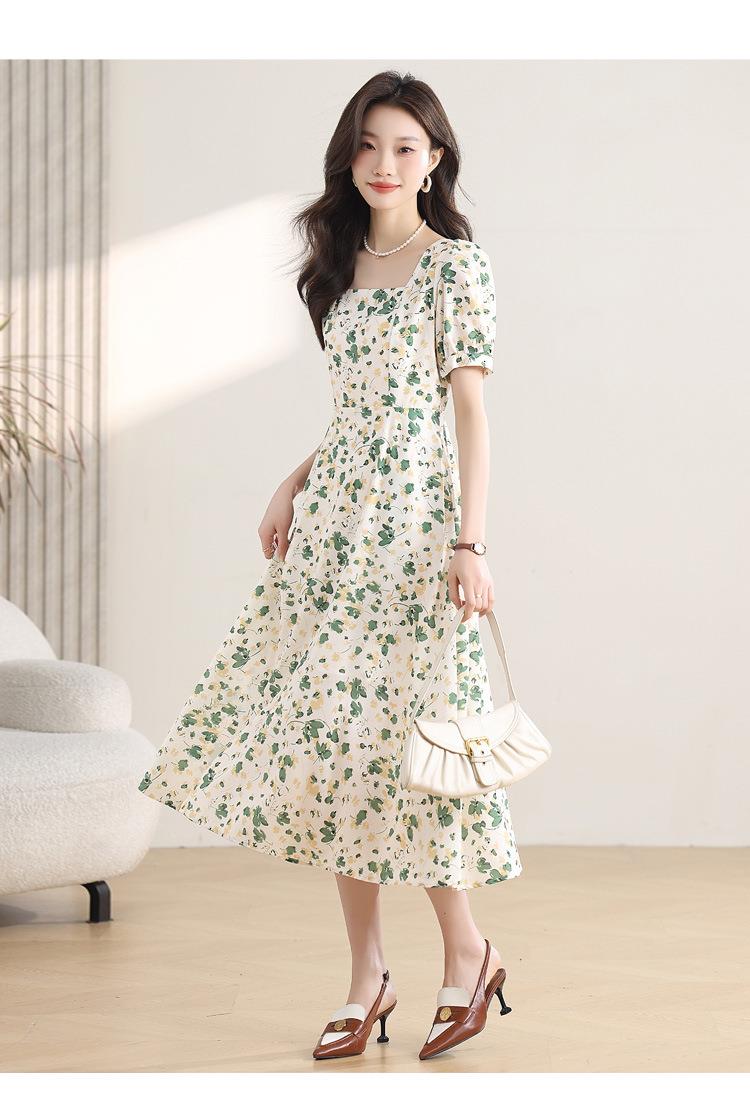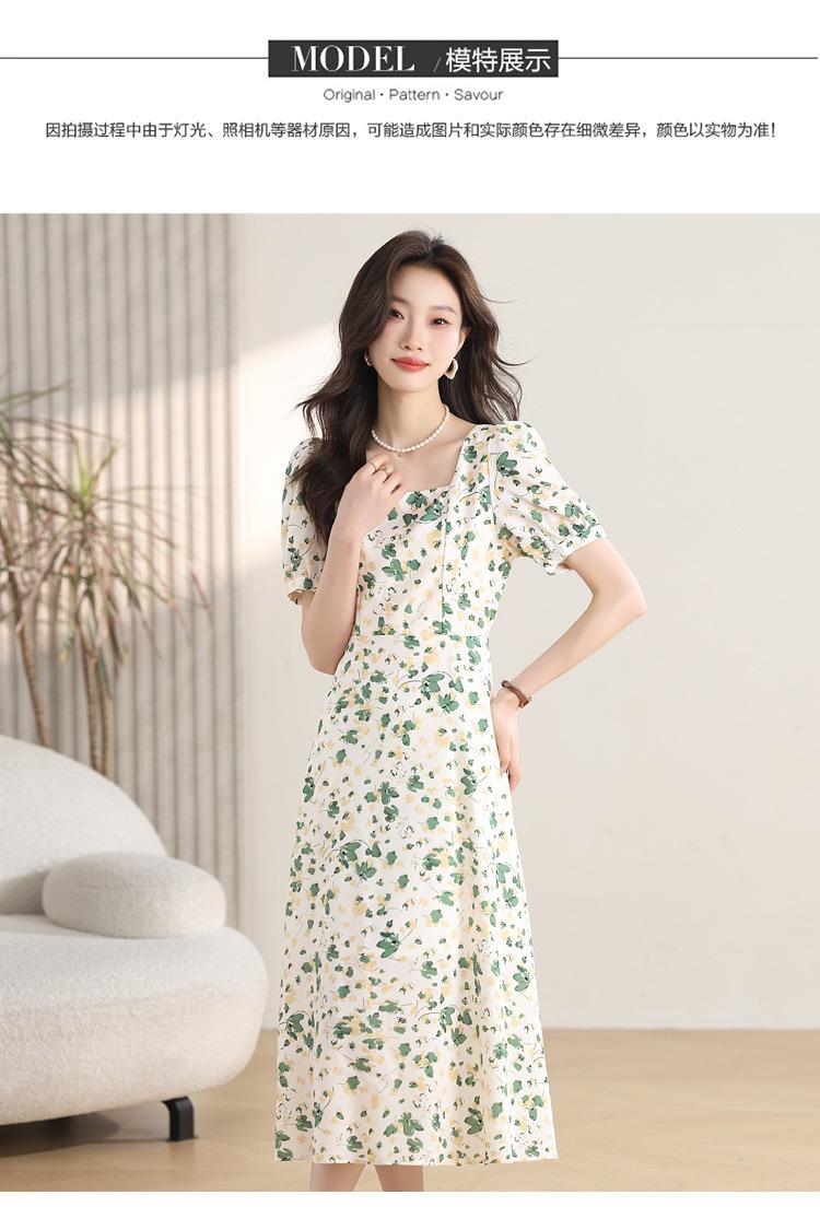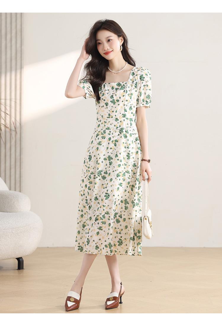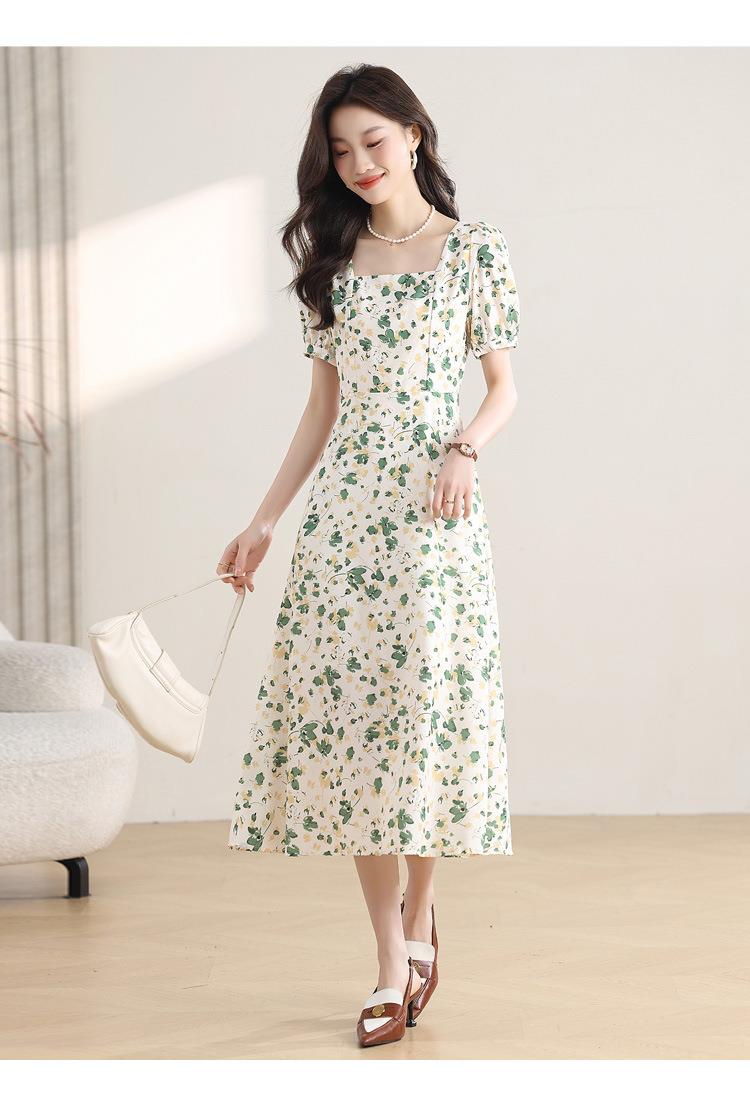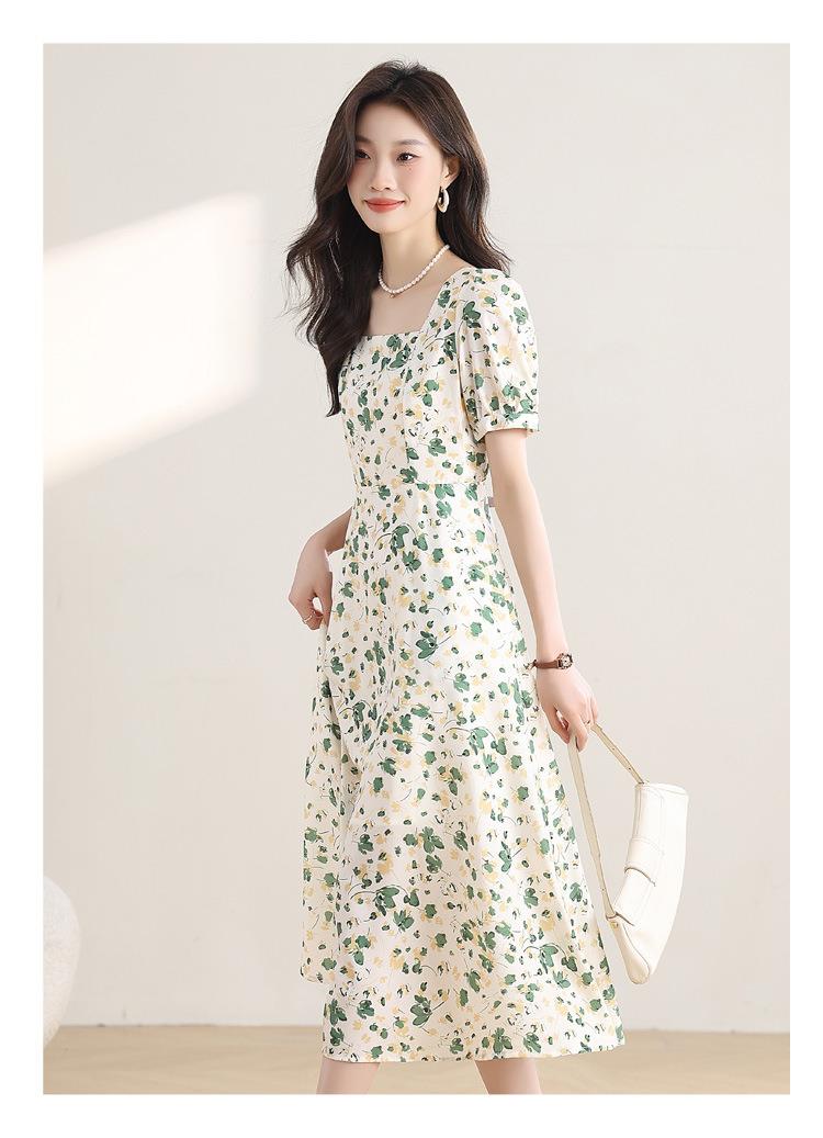 绿色碎花连衣裙女夏2024新款小个子显瘦气质方领a字雪纺仙女裙子