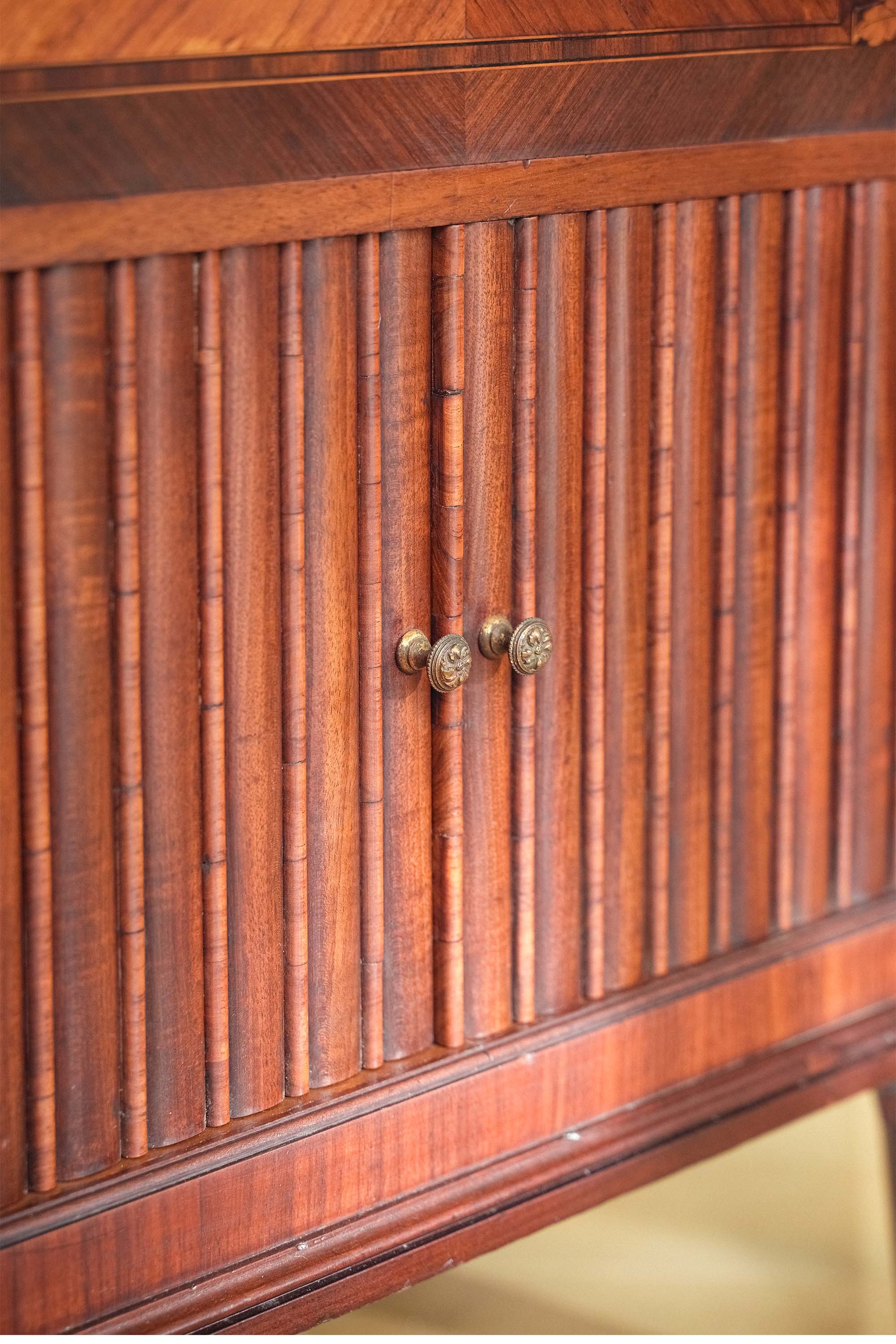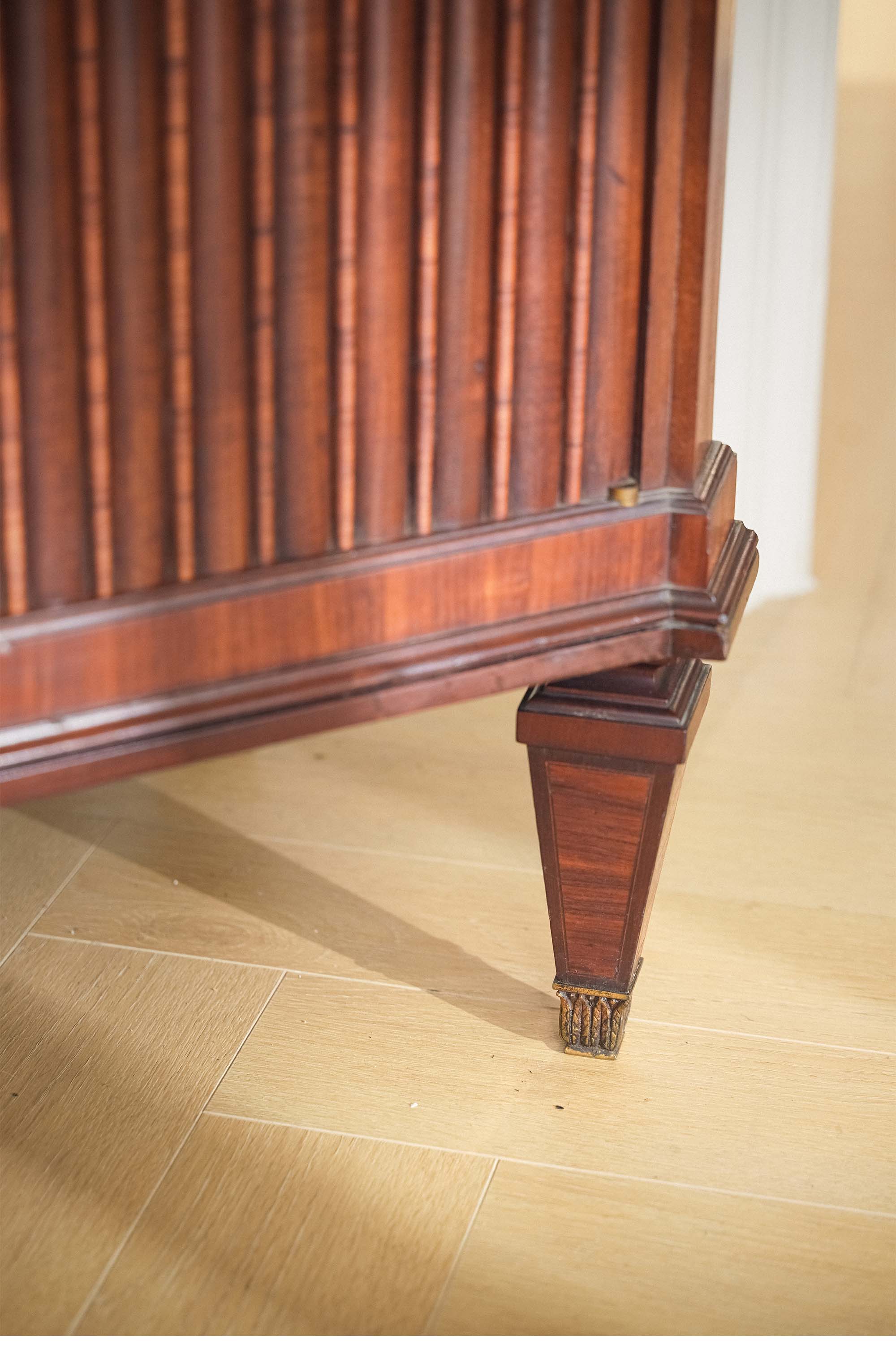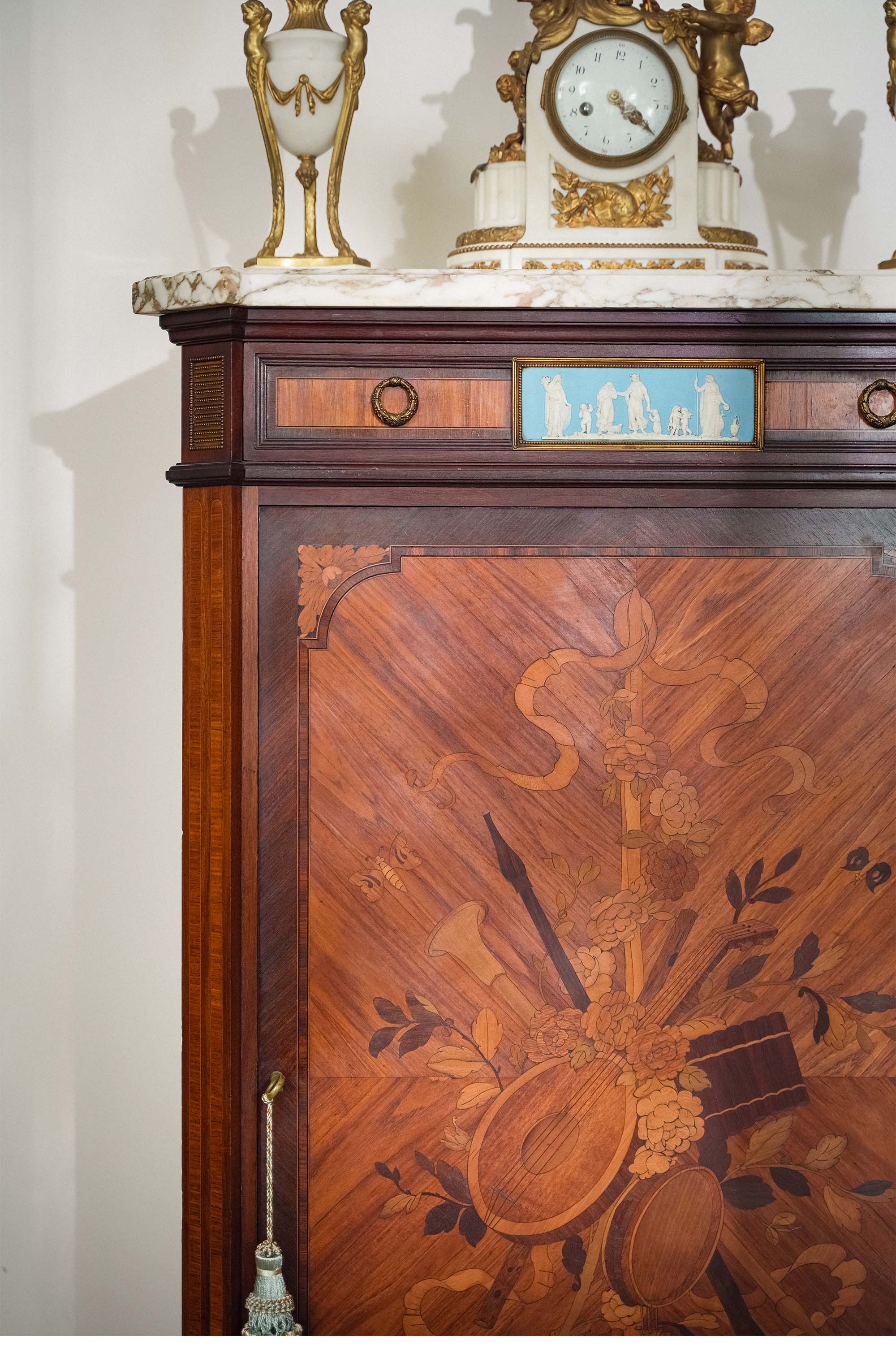 1890年代法国出品路易十六风格大理石台面镶嵌韦奇伍德风瓷片装饰繁花奏乐主题细木镶嵌展示柜玄关柜