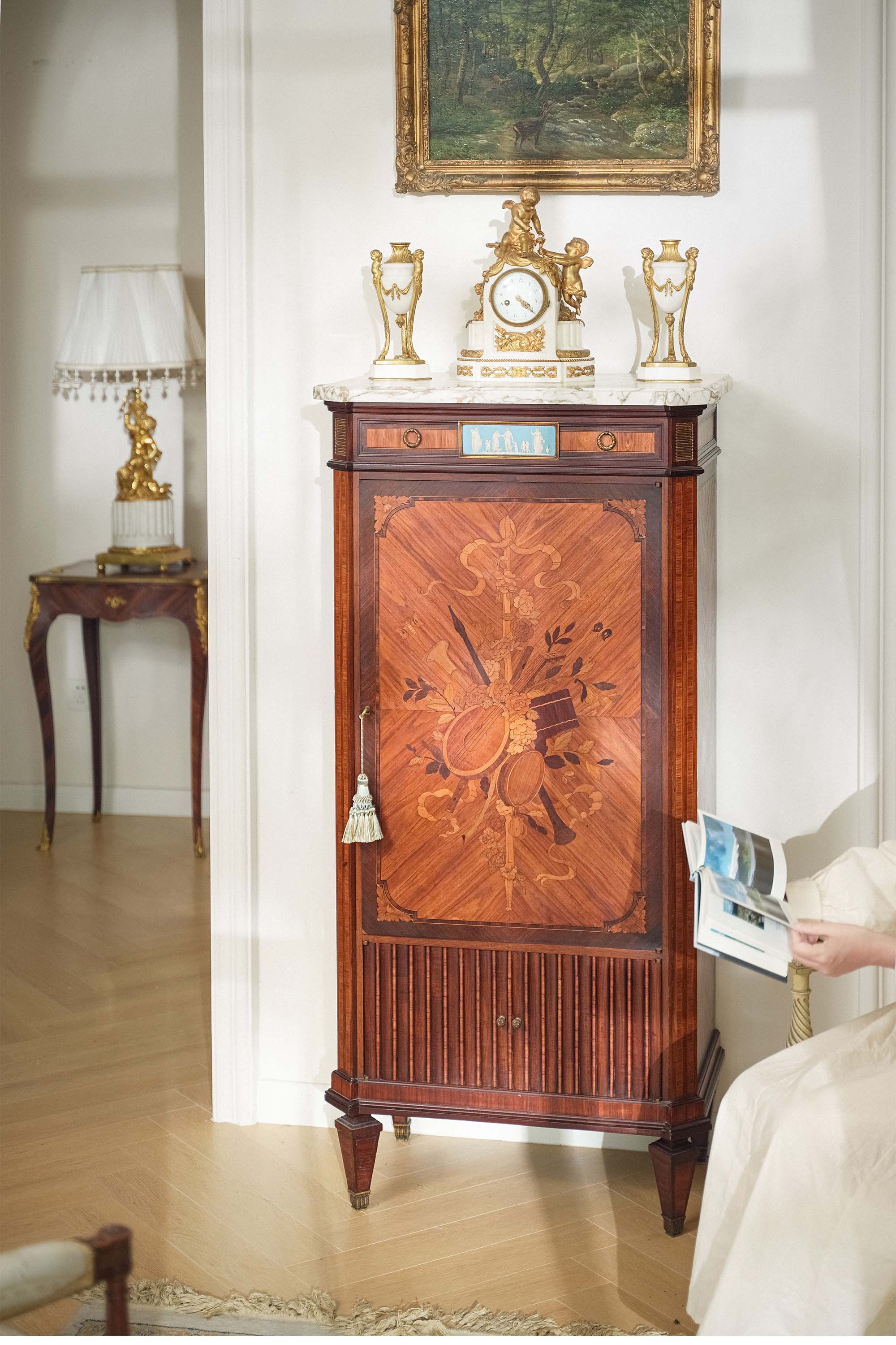 独角鹿西洋古董 古董家具 路易十六风格大理石台面镶嵌韦奇伍德风瓷片装饰繁花奏乐主题细木镶嵌展示柜玄关柜