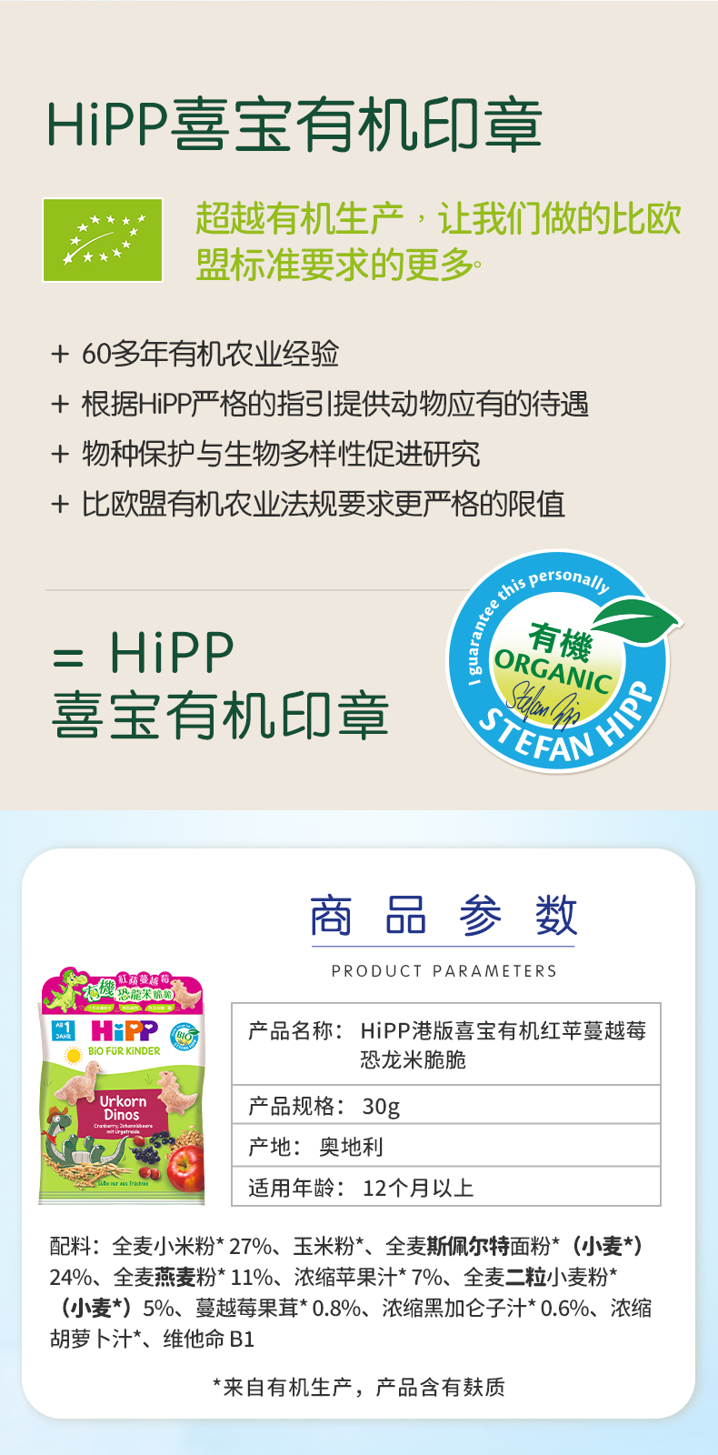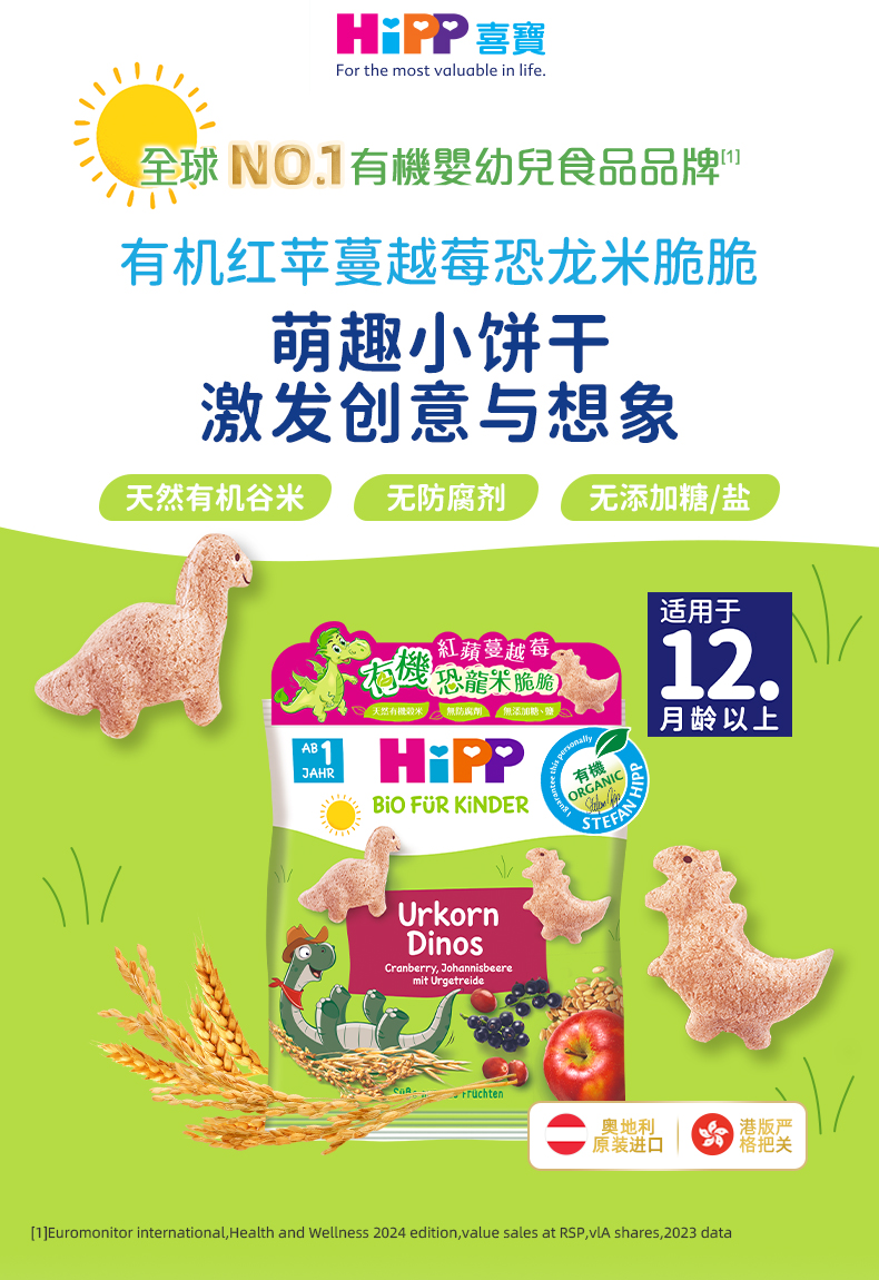 (新品 香港直郵)HiPP喜實有機紅蘋蔓越莓恐龍米脆脆/紅蘋黑加侖子星星脆餅