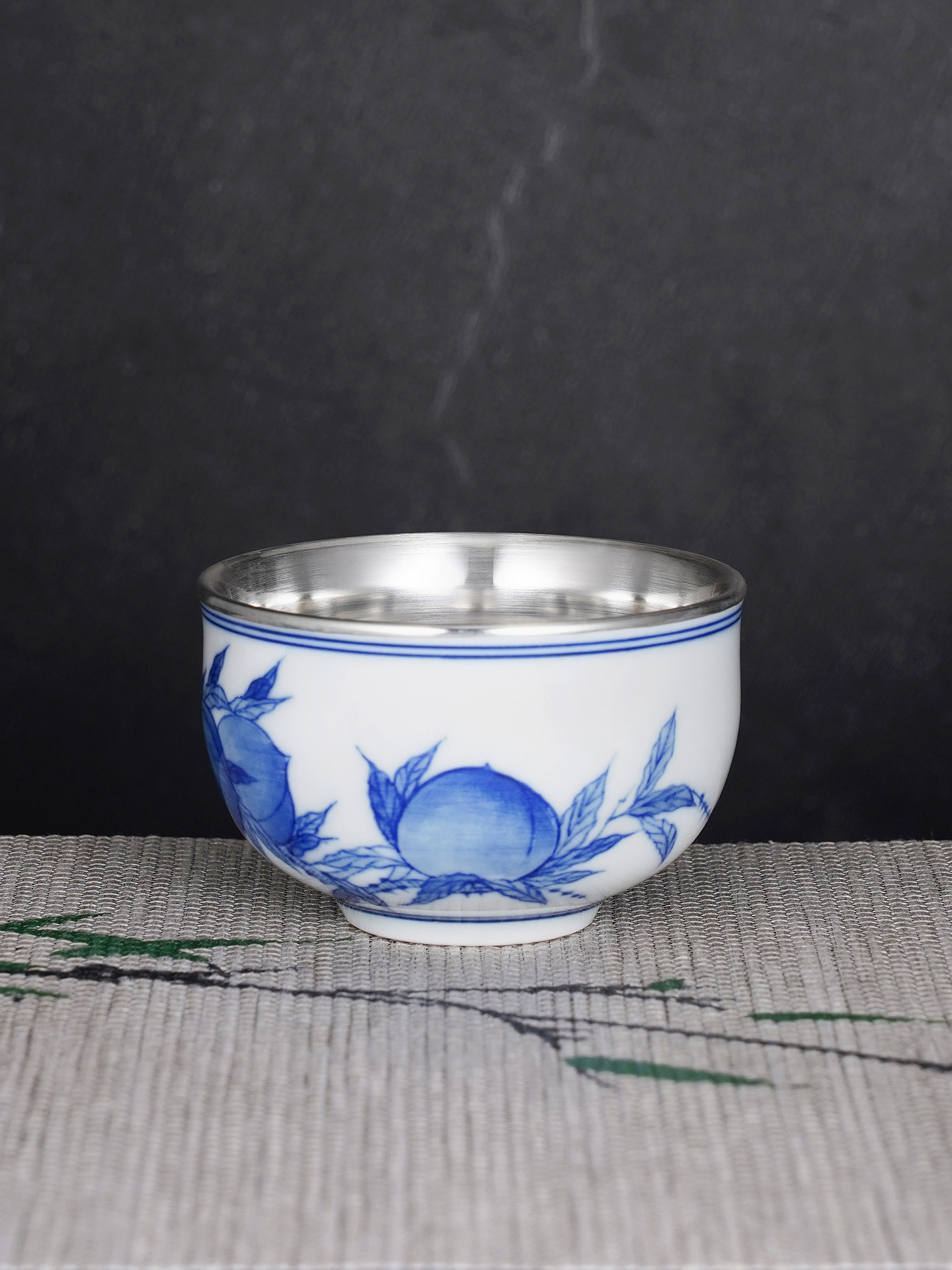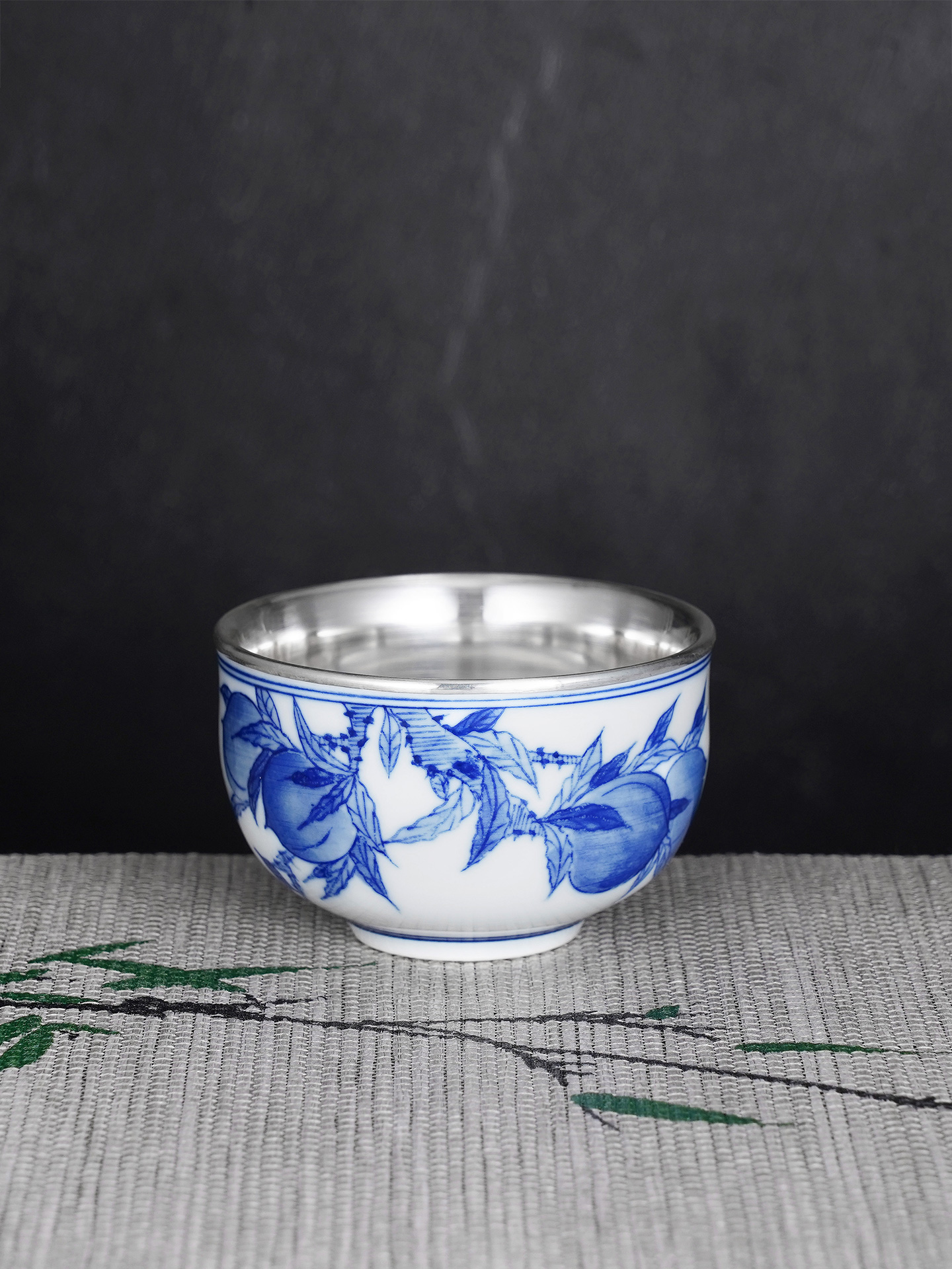子佩集S990【桃之夭夭】摆件【QF003】纯银茶具青花桃枝茶杯纯银内胆景德镇手绘2508