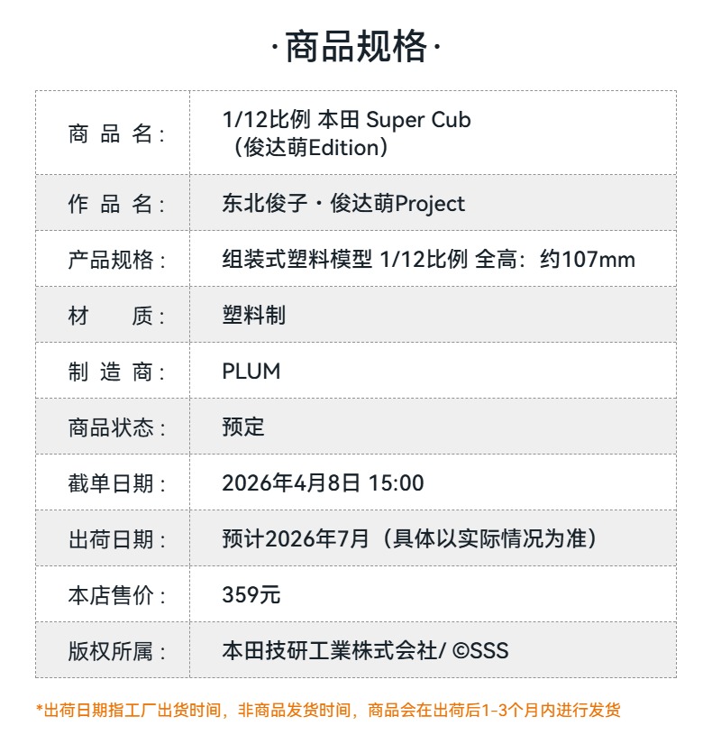 【GSC预售定金】1/12比例 本田 Super Cub (俊达萌Edition)东北俊子・俊达萌Project