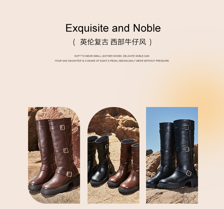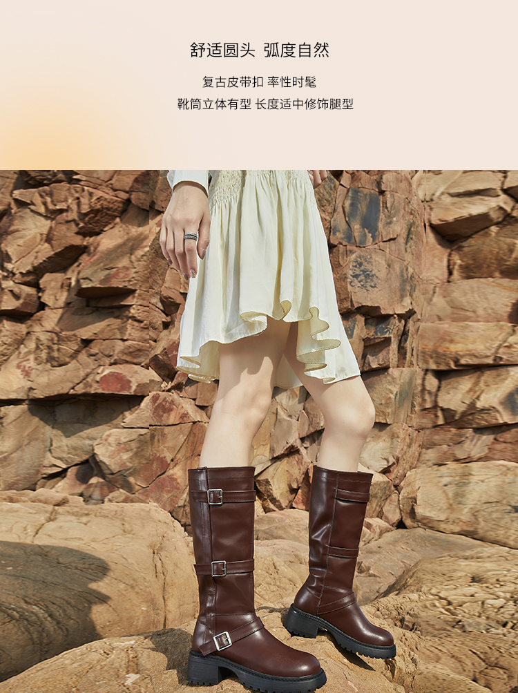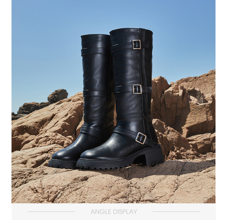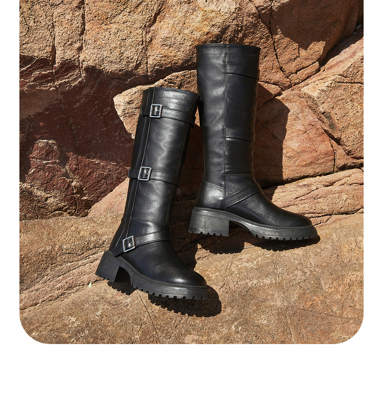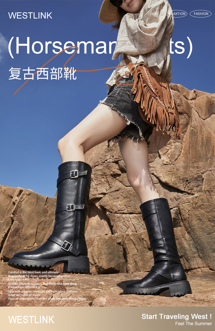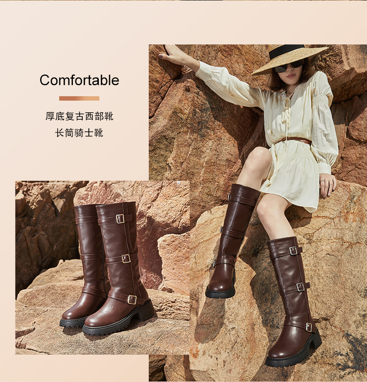 西遇牛仔骑士靴女新款秋冬复古长筒西部靴黑色圆头厚底长靴子D0034217