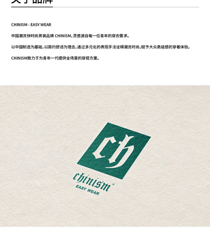 - 中国潮流快时尚男装品牌 CHINISM ,始创于2012年,正式成立于2014年。灵感源自每一位青年的穿衣需求。CHINISM - EASY WEAR