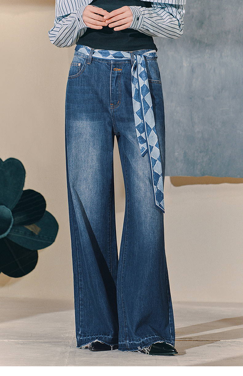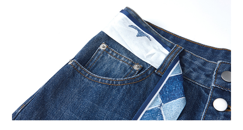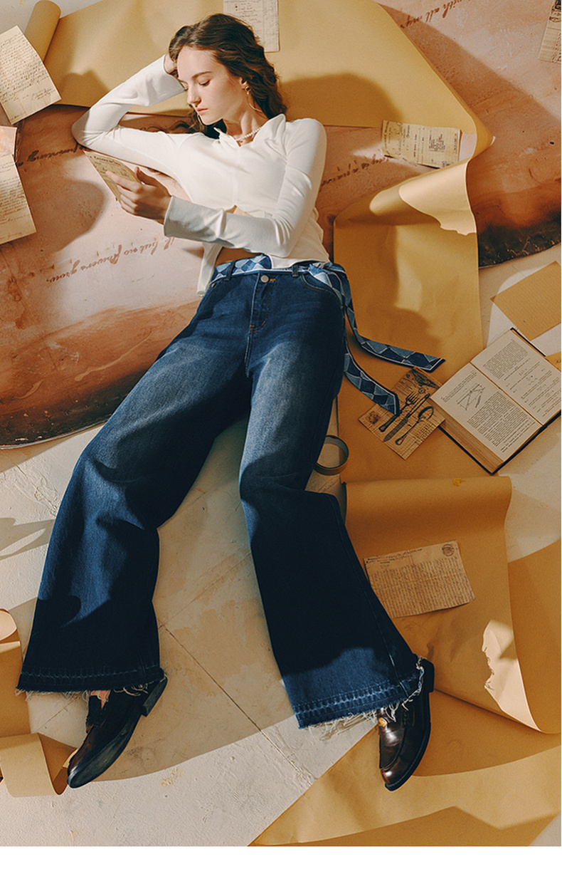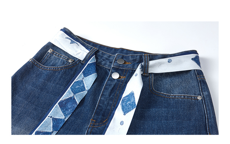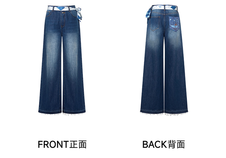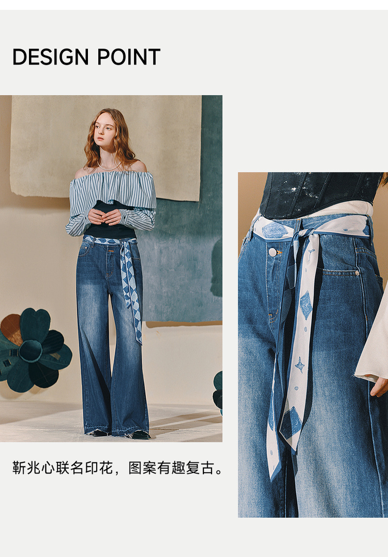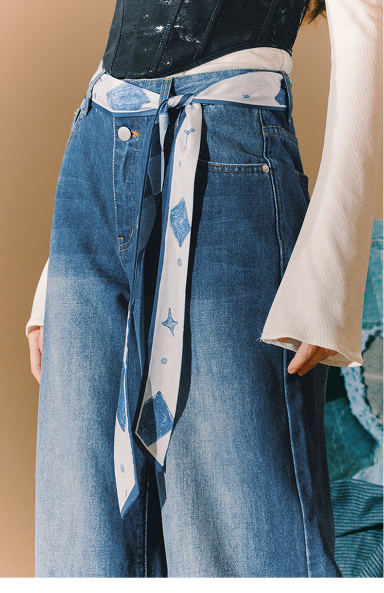 两三事北斗引航2025秋季新款丝巾装饰印花口袋毛边裤脚直筒牛仔裤