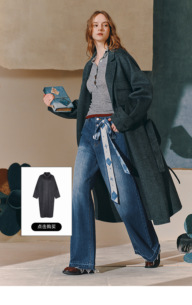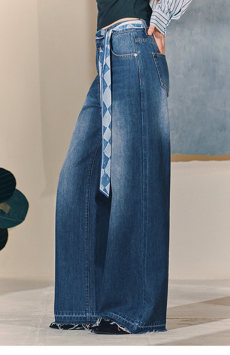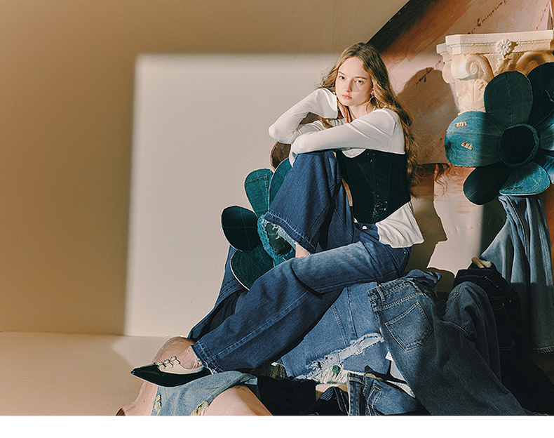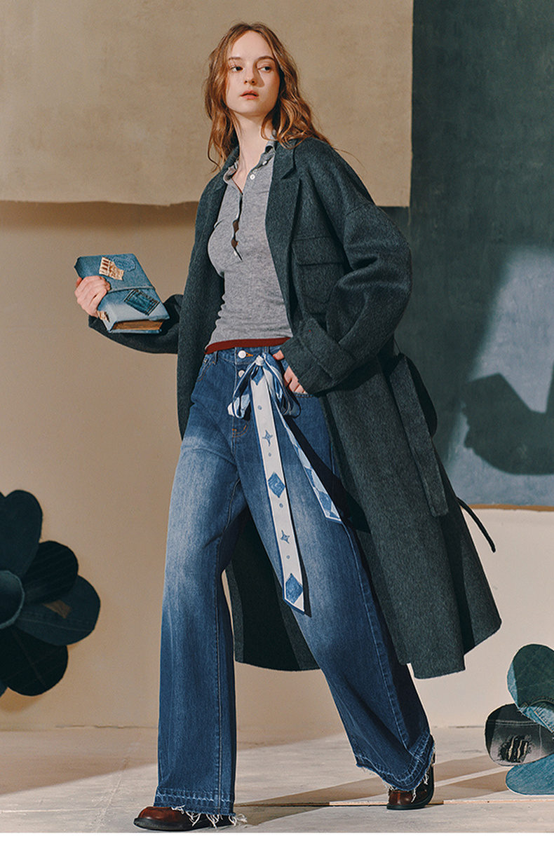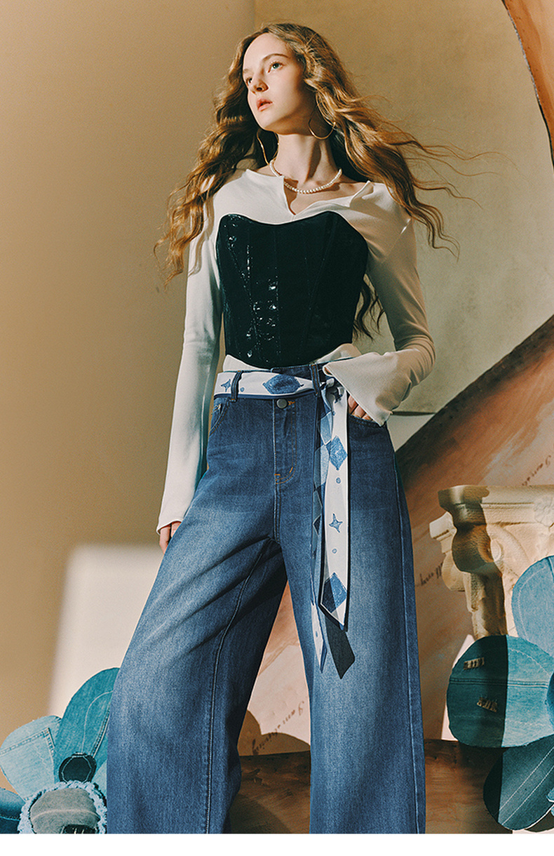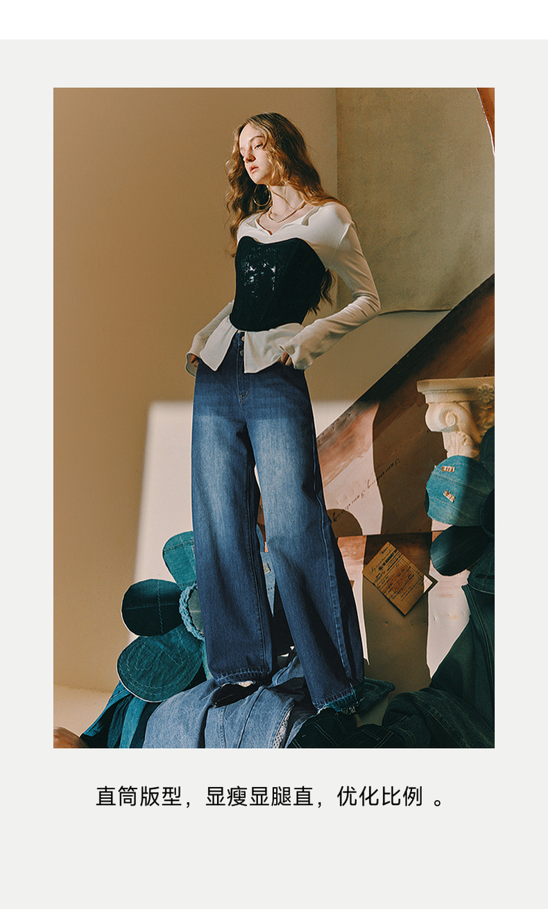 两三事北斗引航2025秋季新款丝巾装饰印花口袋毛边裤脚直筒牛仔裤