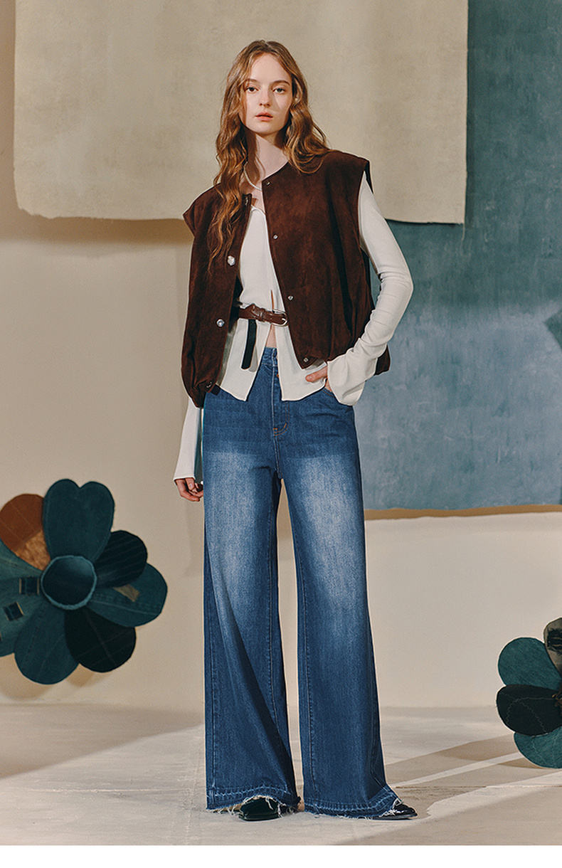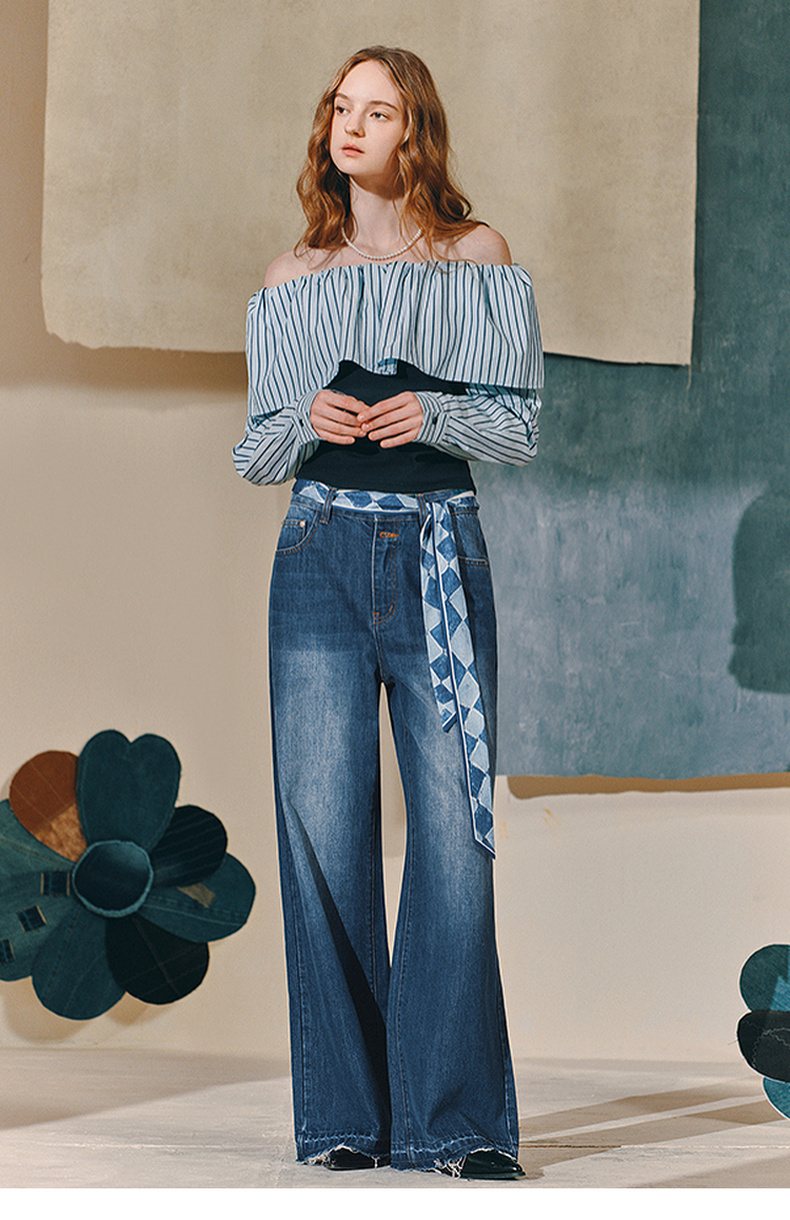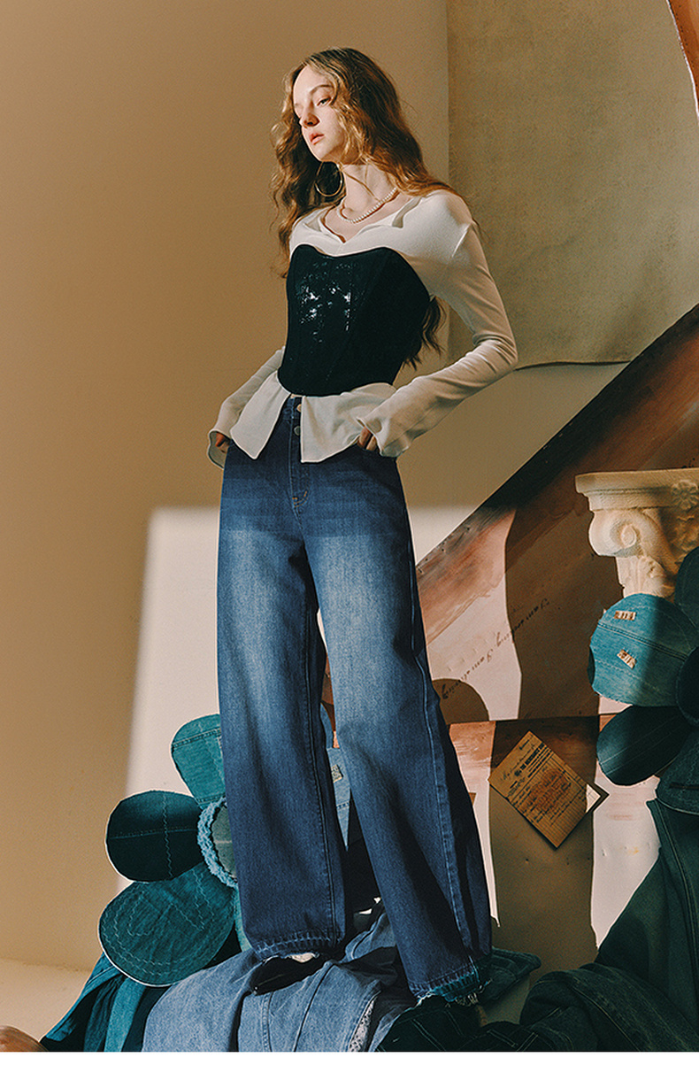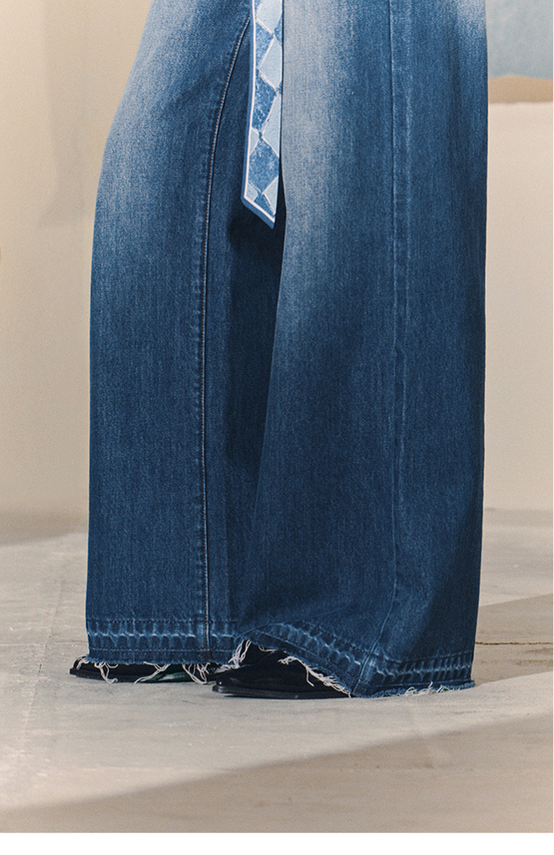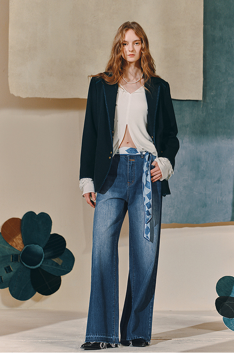两三事北斗引航2025秋季新款丝巾装饰印花口袋毛边裤脚直筒牛仔裤