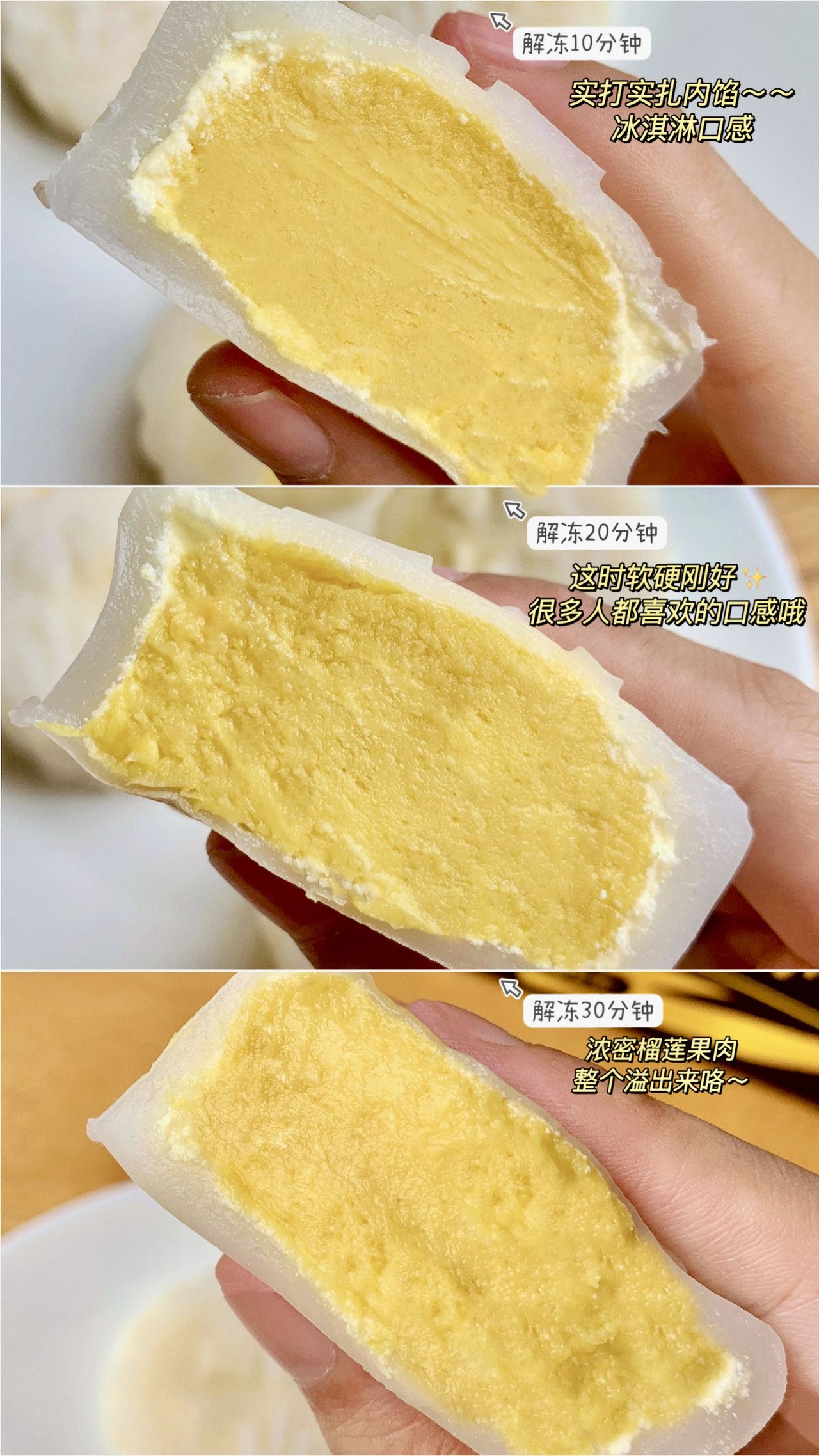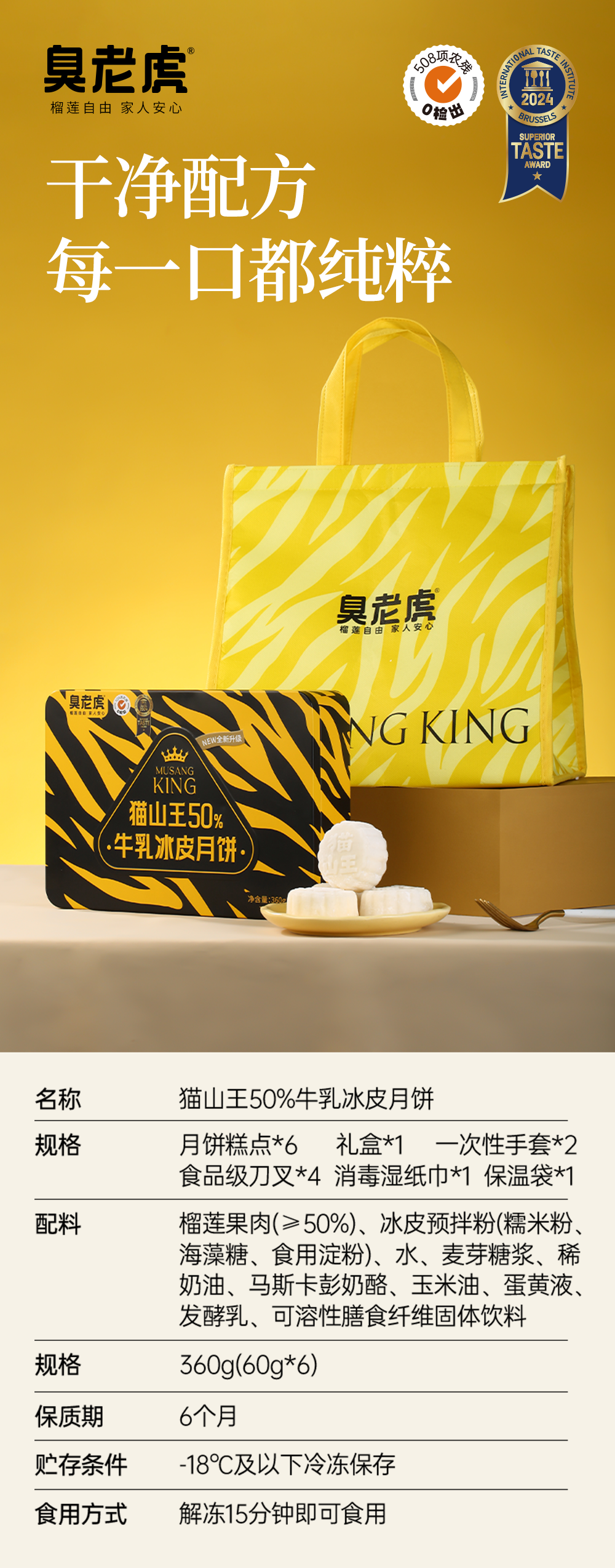 ①口感软糯,不甜腻,尾调很香②低糖低油,健康的配比更适合孩子和长辈③柔韧糯米皮,不粘牙,要知道很多冰皮要么粘牙要不会开裂④使用A级进口猫山王榴莲肉,权威508项SGS农残检测0检出⑤零香精、零防腐剂,月饼也可以是健康好吃的 月饼的内陷,选用的是一直被誉为榴莲贵族的马来西亚猫山王。品牌方自营600亩果园直供,一果一线,吸收母树一年养分后才自然落地,很珍贵,高熟度的榴莲,口感才会绵软香甜,用来做内陷,可想而知的优秀。 除了内馅用量扎实,白fufu冰皮。经过了师傅33次的优化,才有了这糯叽叽又不粘牙的口感。,还获得了2024国际美味奖的冰皮月饼,一定可以成为今年团圆夜里受欢迎的冰皮月饼了。不同时长解锁不同口感✔解冻10min:冰皮未软化,内馅果肉冰淇淋质地✔解冻20min:冰皮稍软,内馅刚解冻,口感恰好✔解冻30min:表皮完全软化,完全解冻,入口绵密