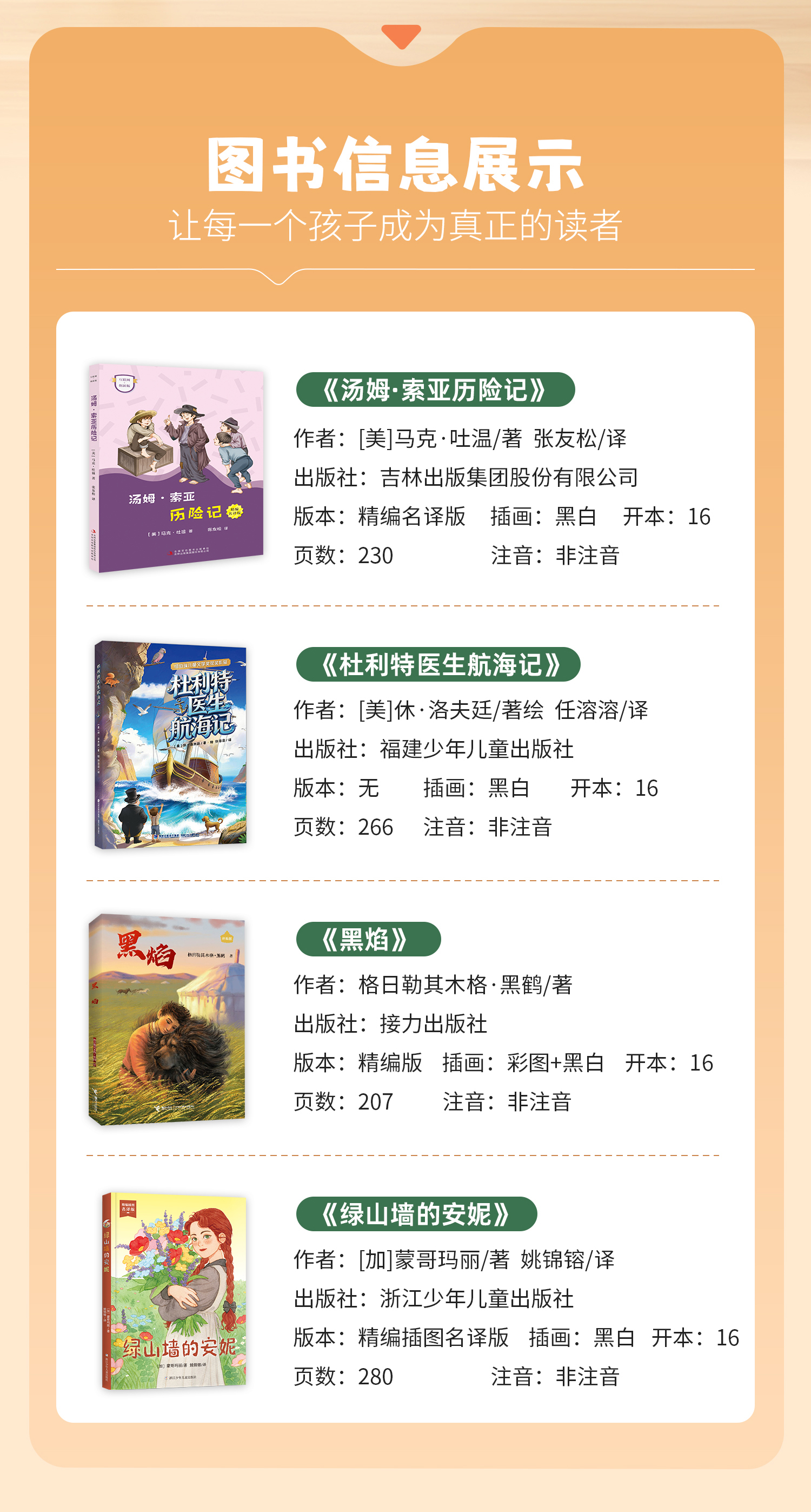 班班26春六年级【书目】《汤姆·索亚历险记》 《杜利特医生航海记》 《黑焰》 《绿山墙的安妮》赠导读单