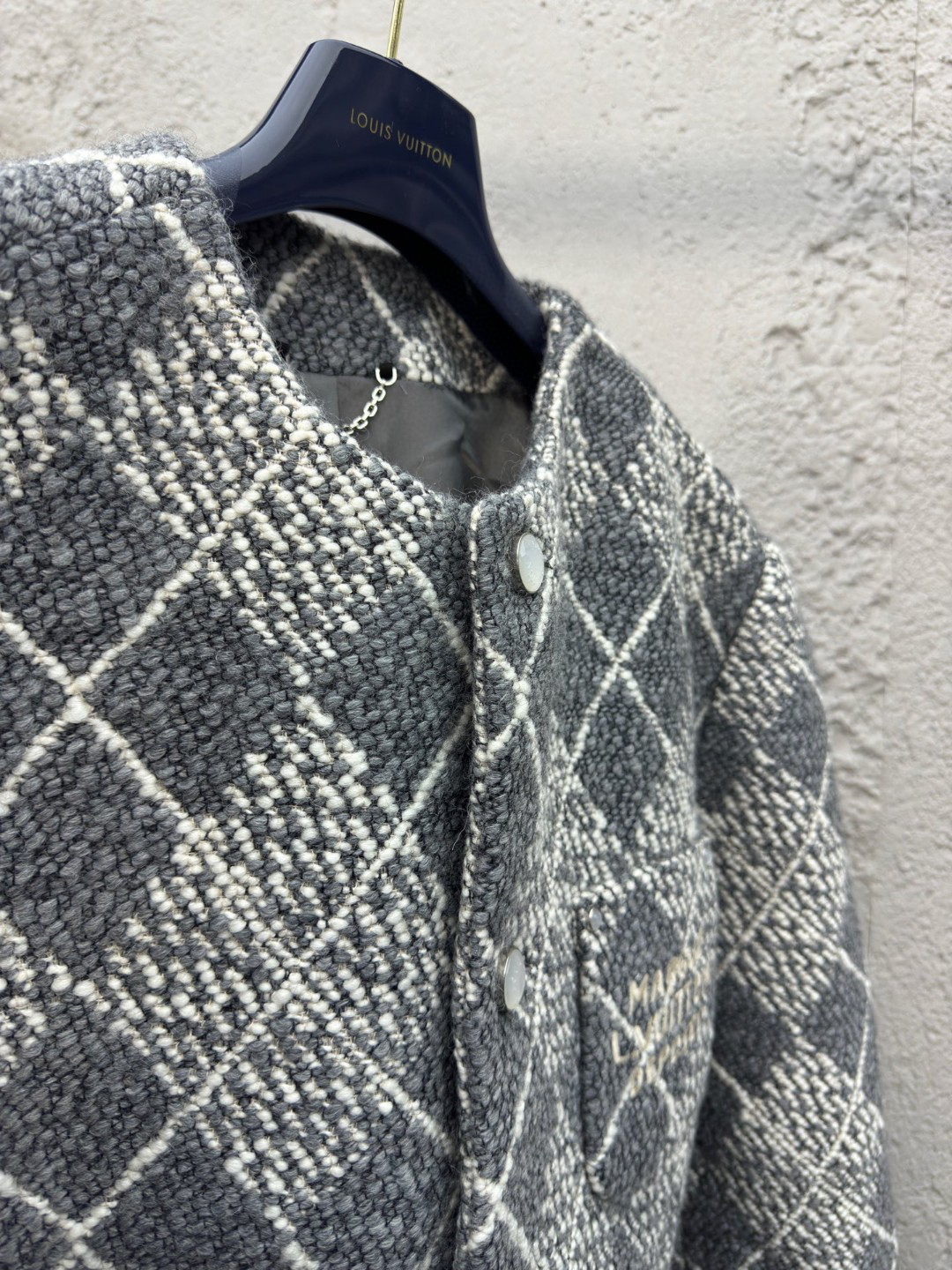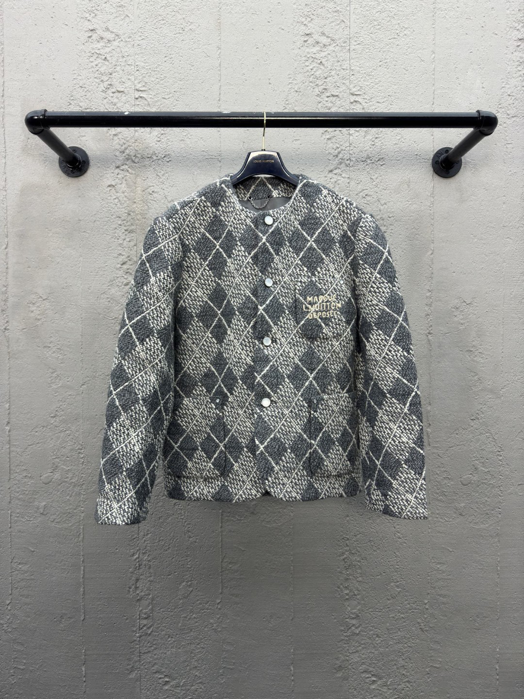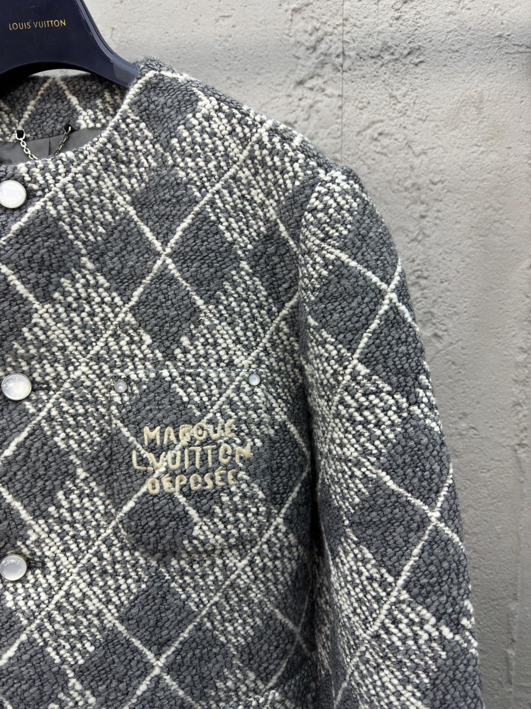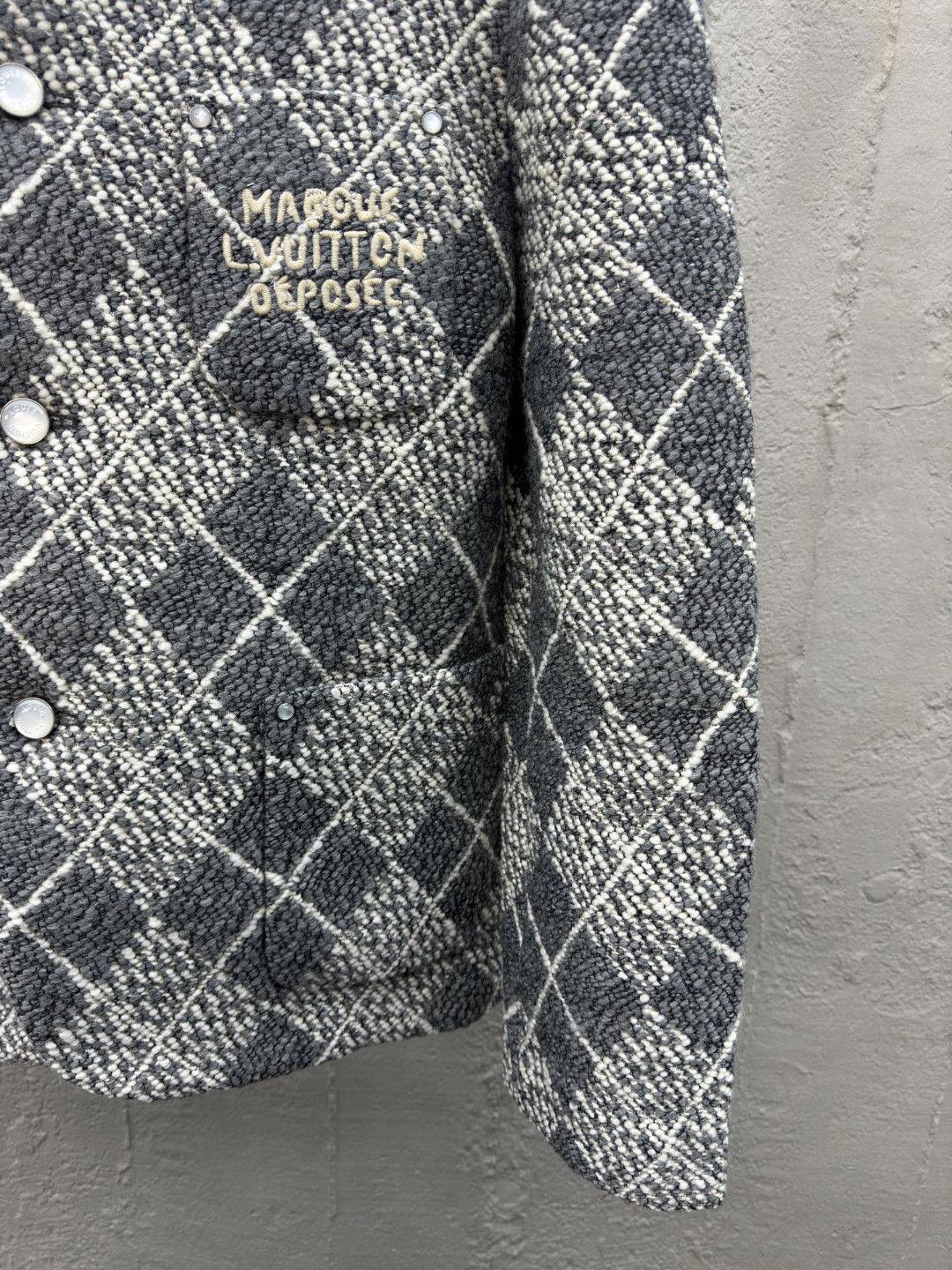 工艺说明:呈现 Argyle 花纹般的视觉效果。珠光纽扣和 Marque L.Vuitton Déposée 标识刺绣完善潮流设计,面料采用羊毛棉粘胶纤维混纺材料 定染对色 面料通过高温定型复合200d使达到原版的立体效果 珠光纽扣和铆钉 贴袋 能与同款搭配营造时尚造型,驾驭各种场合,定制辅料,三标齐全,男女同款!