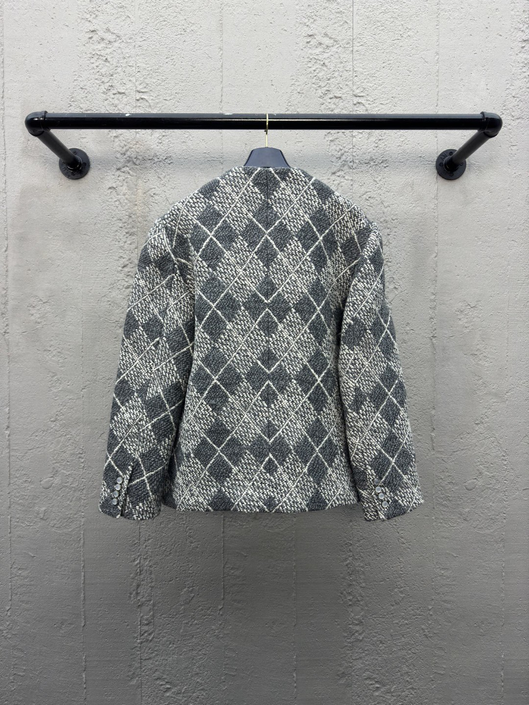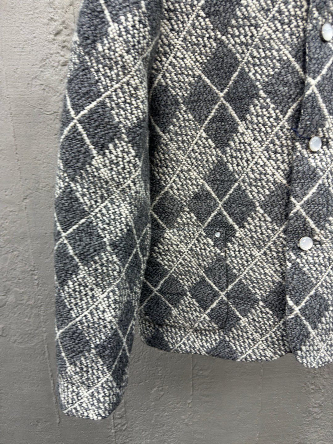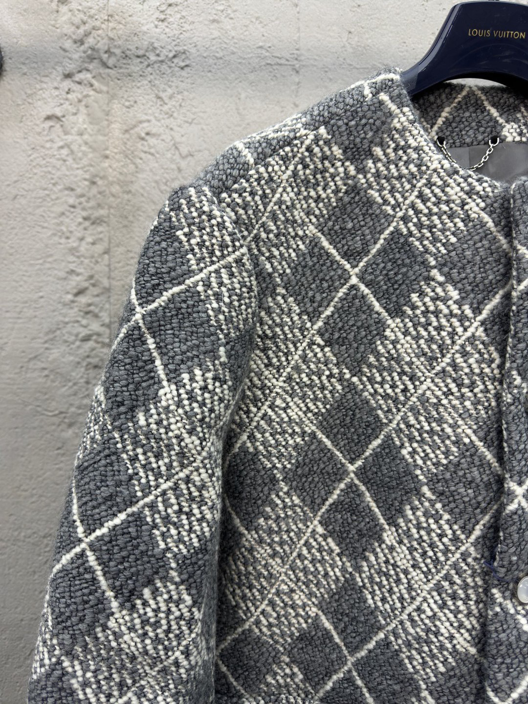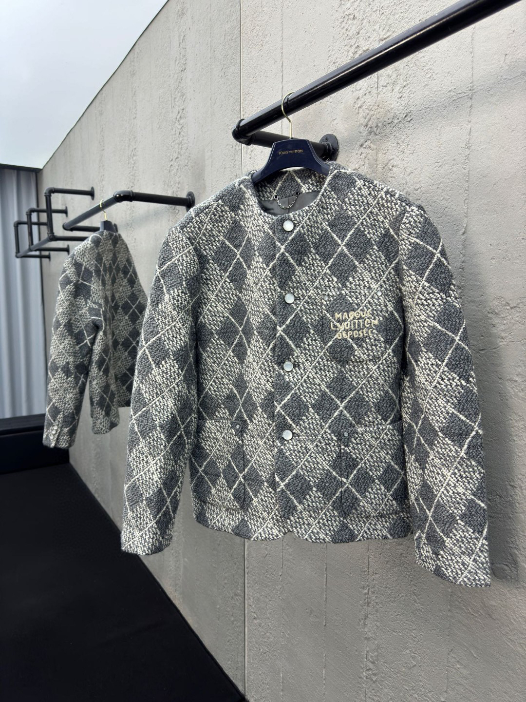 工艺说明:呈现 Argyle 花纹般的视觉效果。珠光纽扣和 Marque L.Vuitton Déposée 标识刺绣完善潮流设计,面料采用羊毛棉粘胶纤维混纺材料 定染对色 面料通过高温定型复合200d使达到原版的立体效果 珠光纽扣和铆钉 贴袋 能与同款搭配营造时尚造型,驾驭各种场合,定制辅料,三标齐全,男女同款!