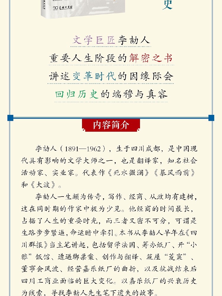 李劼人一生颇为传奇,写作、经商、从政均有建树,这在同时期的作家中极为少见。他经商的时间最长,占据了人生的重要时光,而三者又密不可分,可谓是生路步步紧逼,命运暗中牵引。本书从李劼人早年在《四川群报》当主笔讲起,包括留学法国、筹办纸厂、开“小雅”饭馆、遭遇绑票案,抗战期间工业内迁、“文协”在成都成立分会、乐山遭遇轰炸、嘉乐纸厂谋求发展,以及抗战结束后四川工商业面临的巨大变化,以嘉乐纸厂的兴衰历史为线索,寻找李劼人先生笔下遗失的故事。