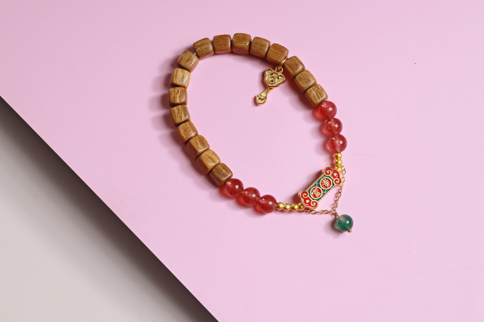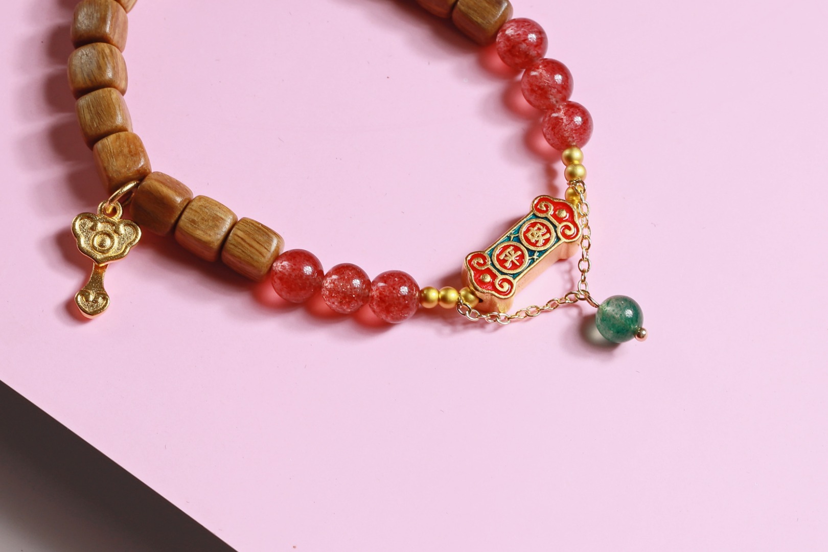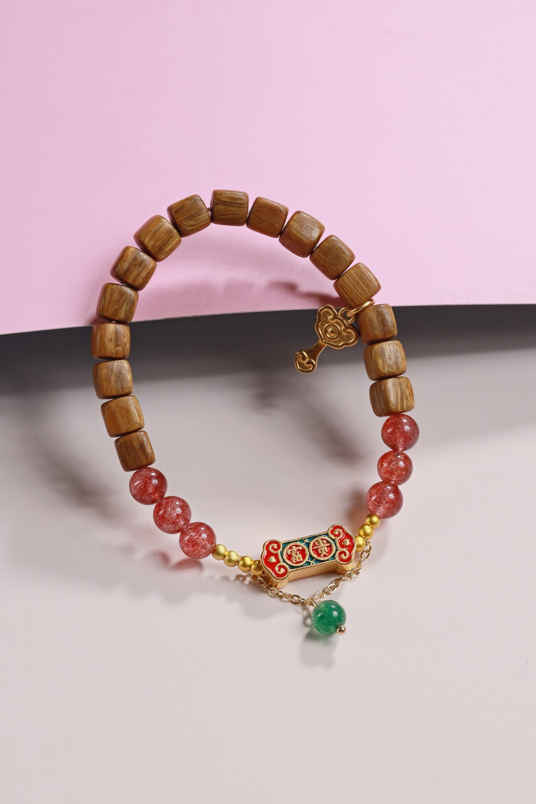 绿檀四方来财珠|粉草莓如意吊坠手链
