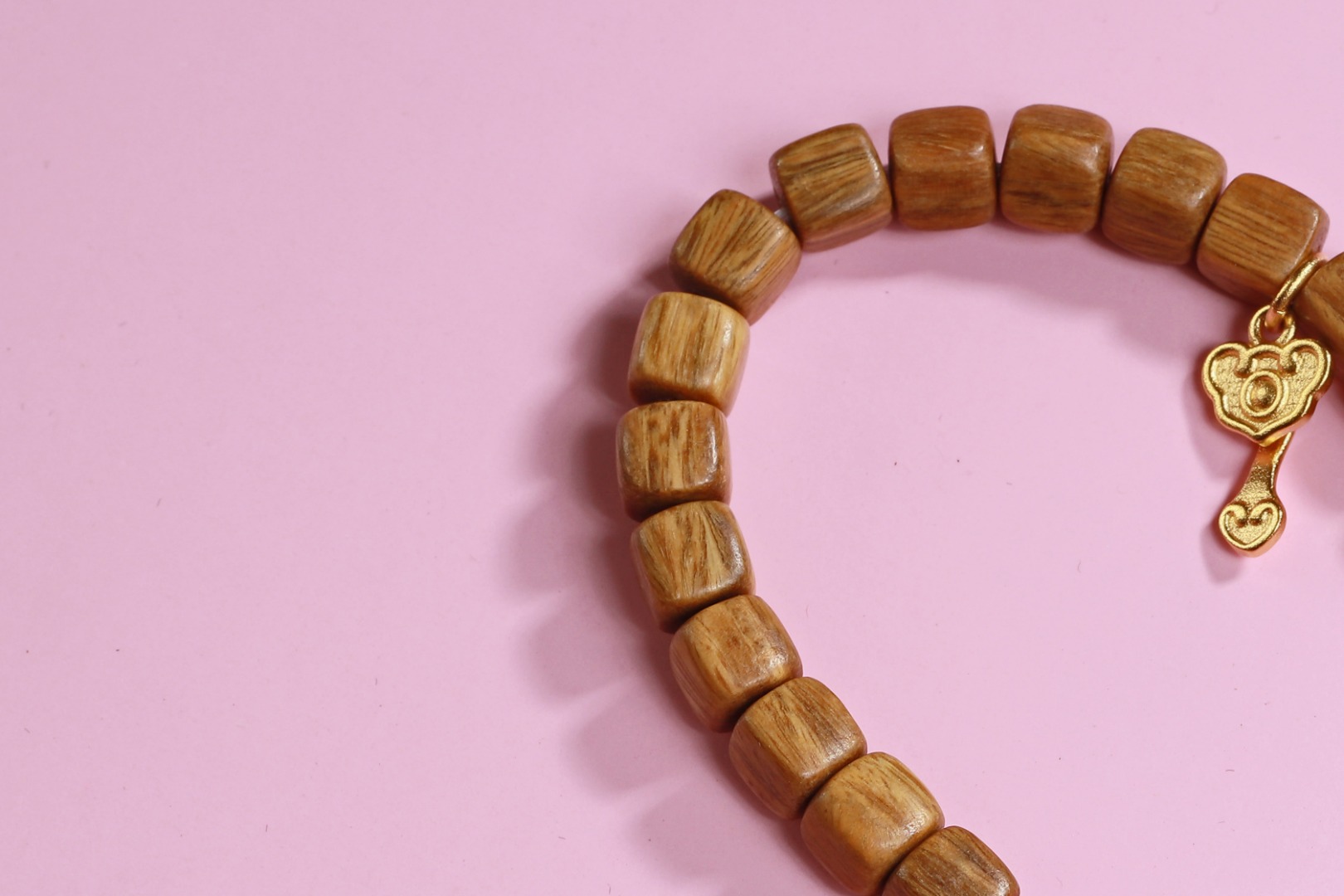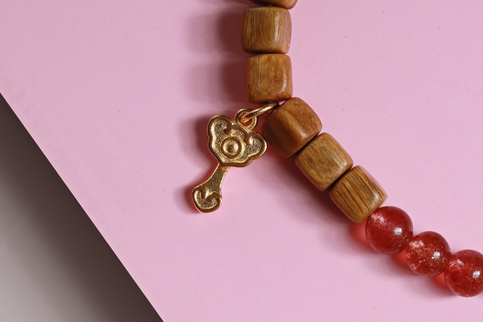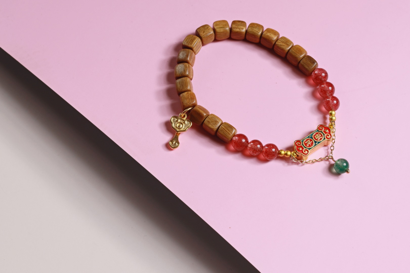 绿檀四方来财珠|粉草莓如意吊坠手链