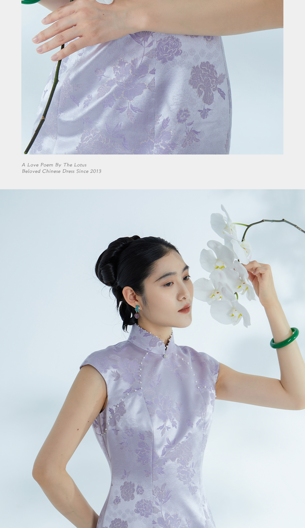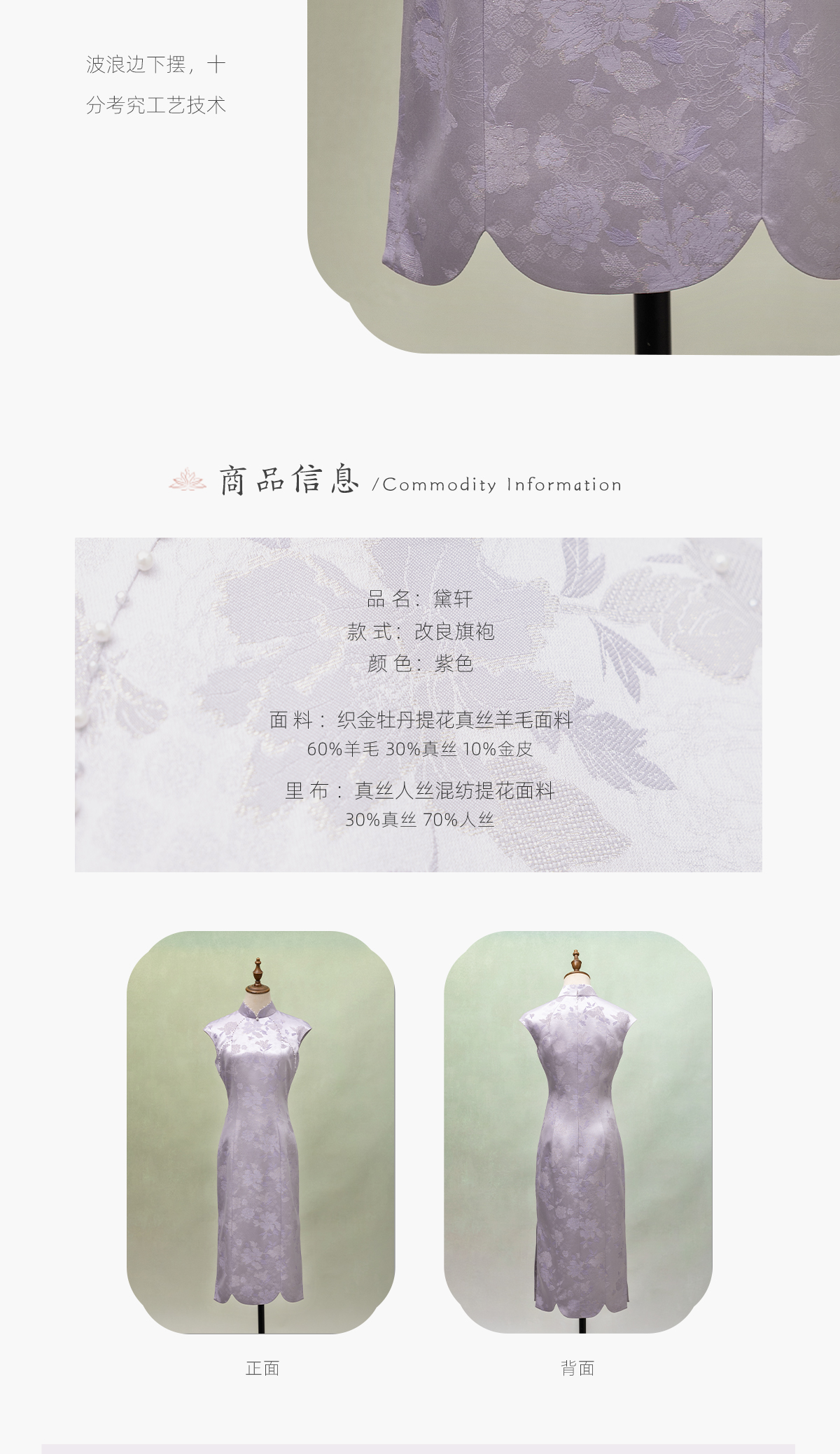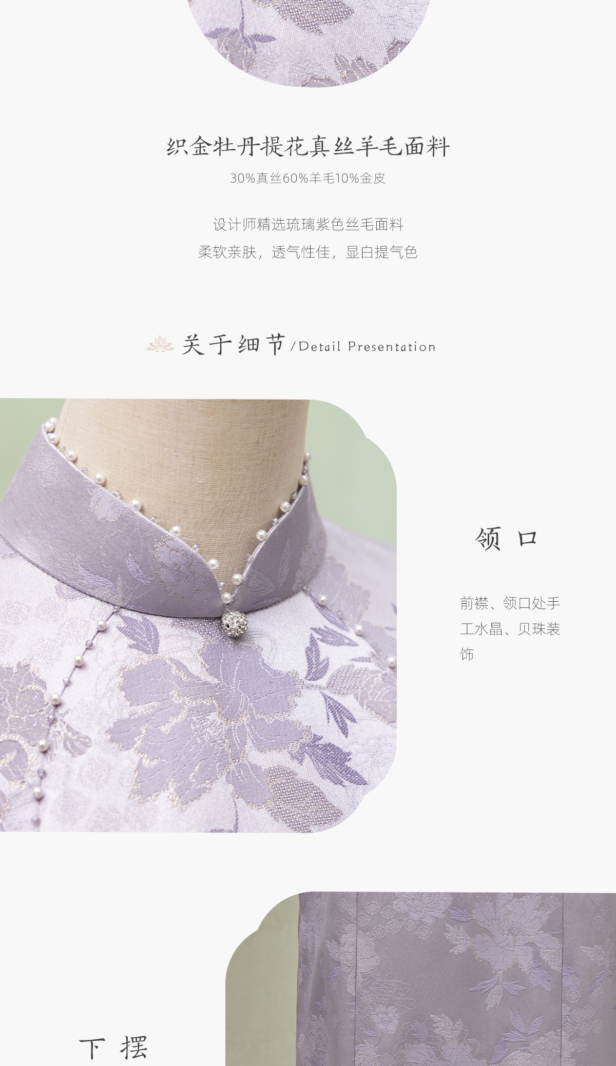 荷言HEYEN 黛轩 真丝羊毛牡丹提花织金紫色旗袍知性优雅风高定系列