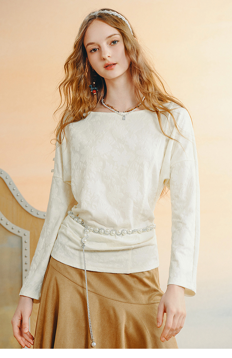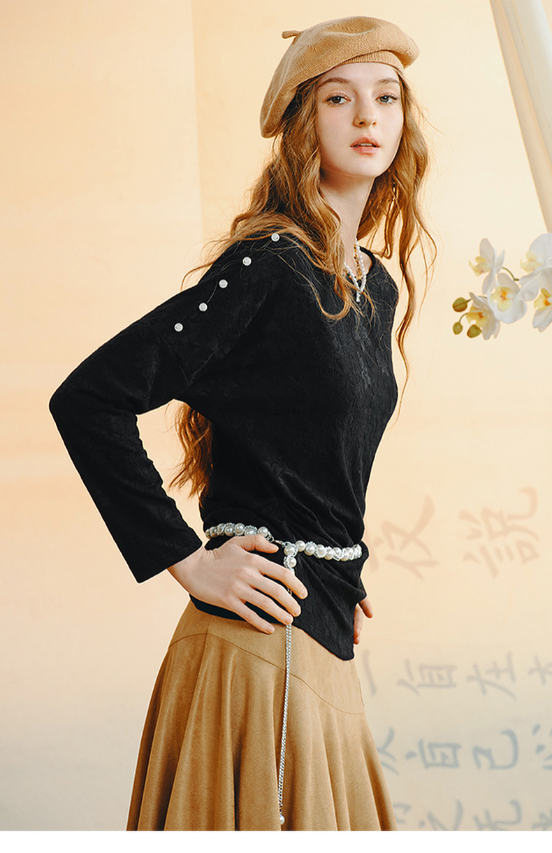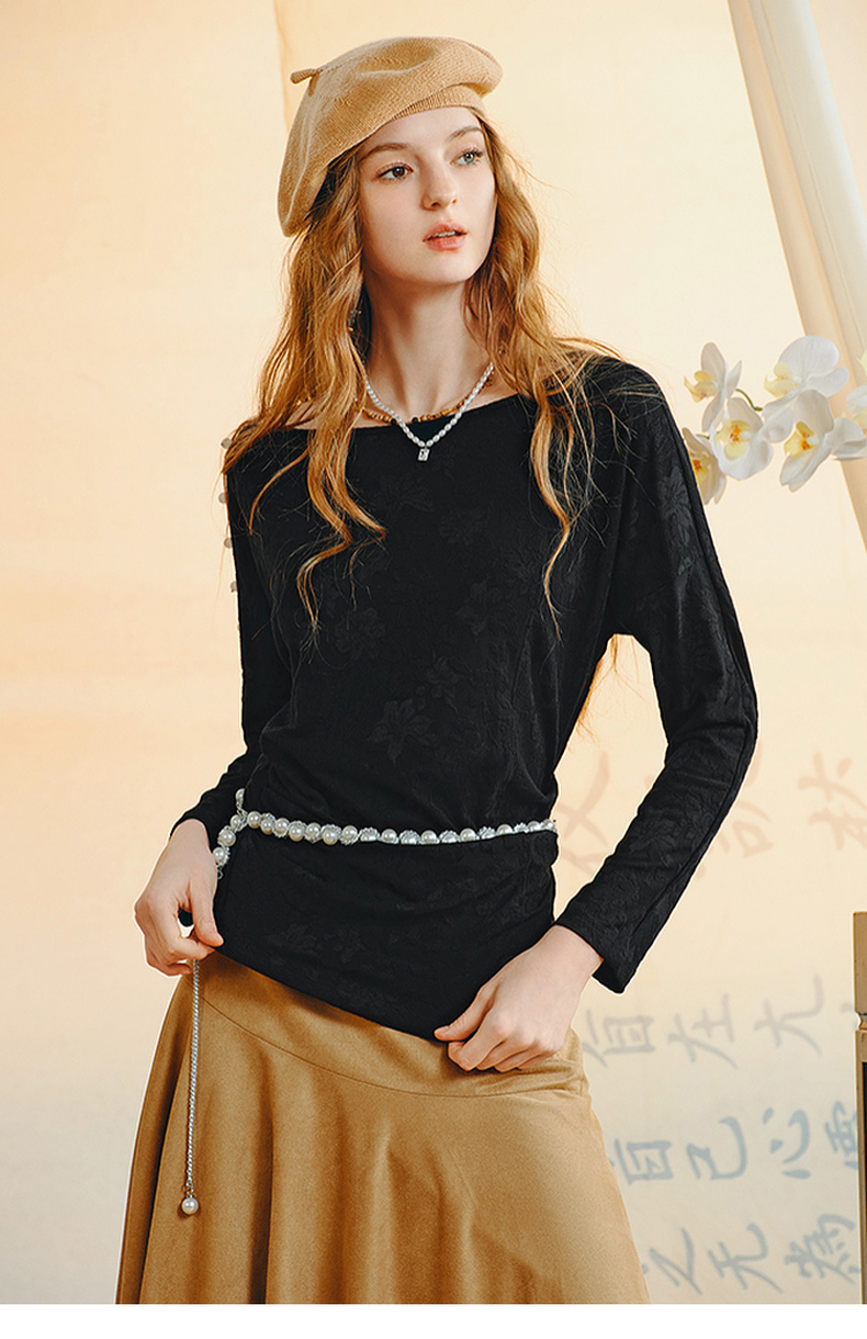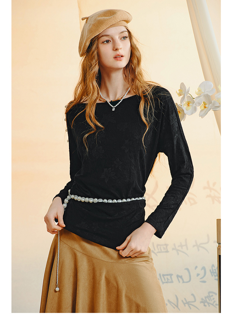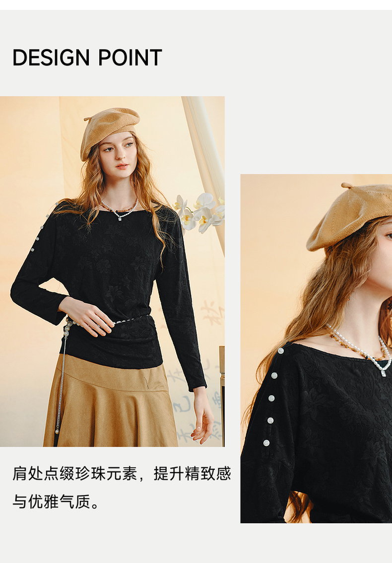 两三事 月涧星霜 2025秋季新款简约珠子装饰一字肩长袖t恤女