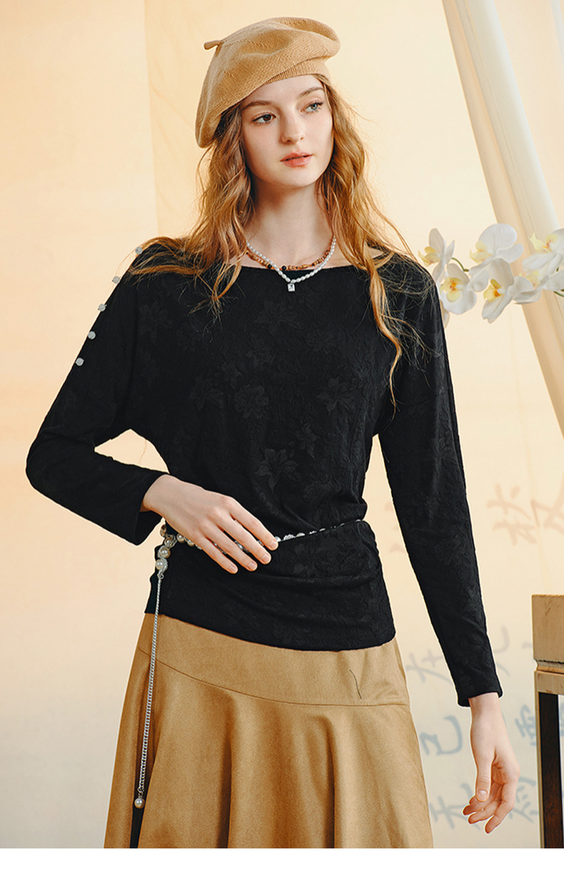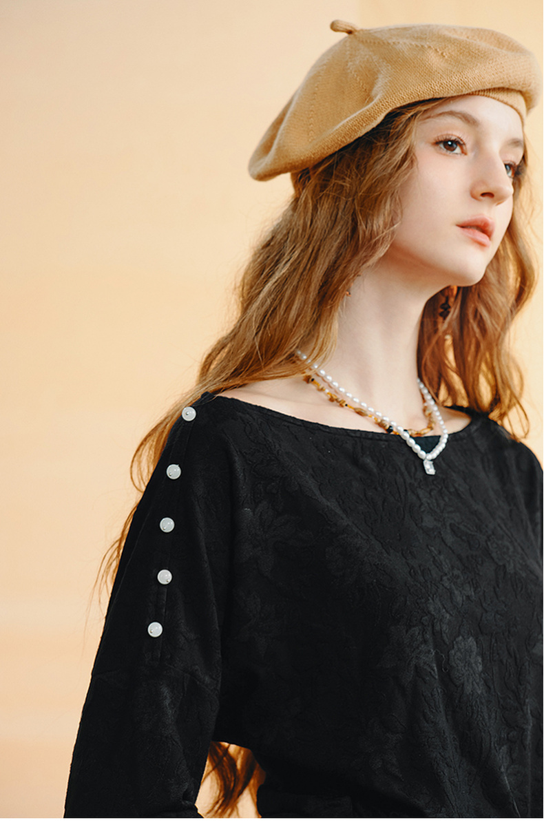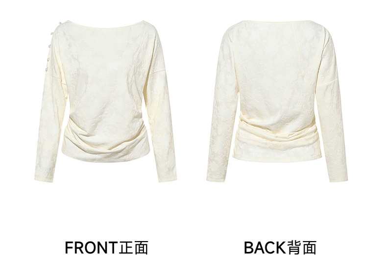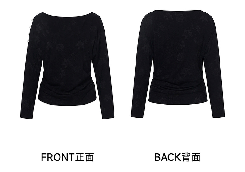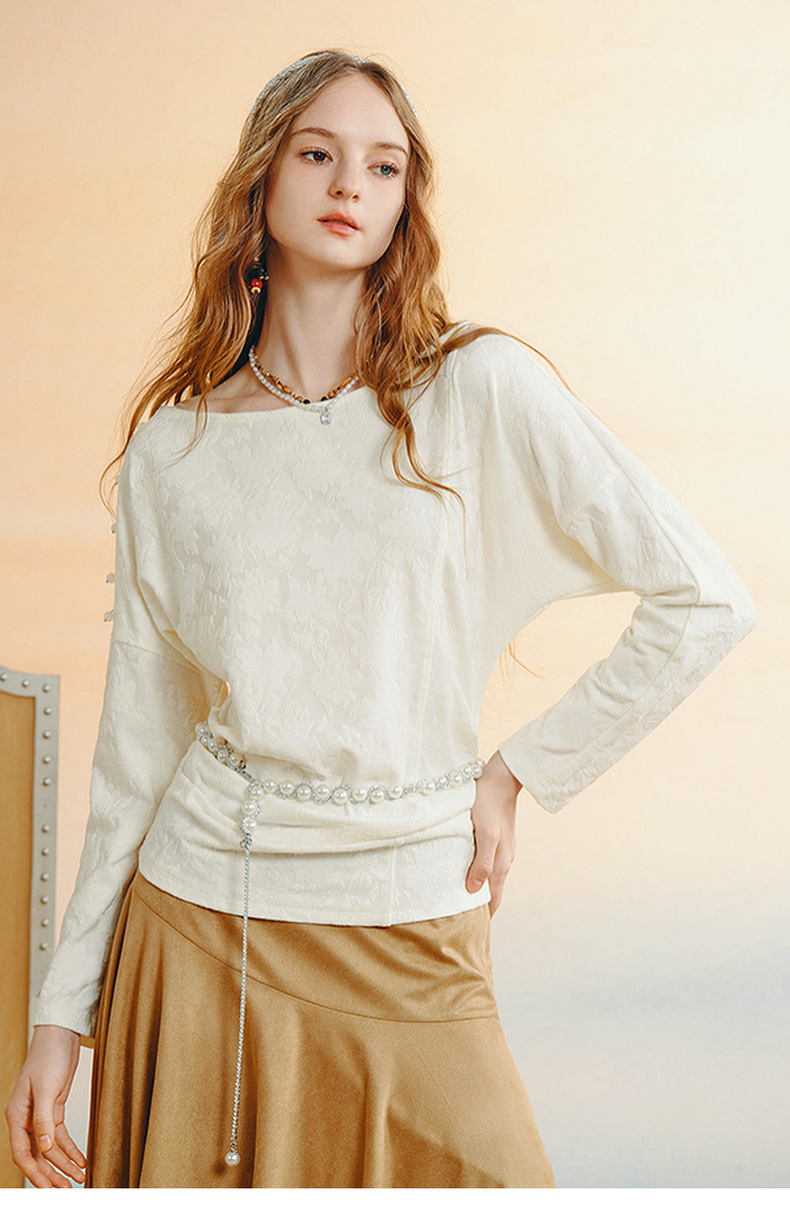 两三事 月涧星霜 2025秋季新款简约珠子装饰一字肩长袖t恤女