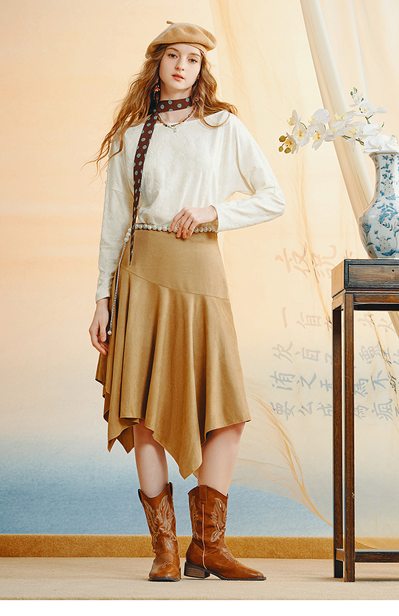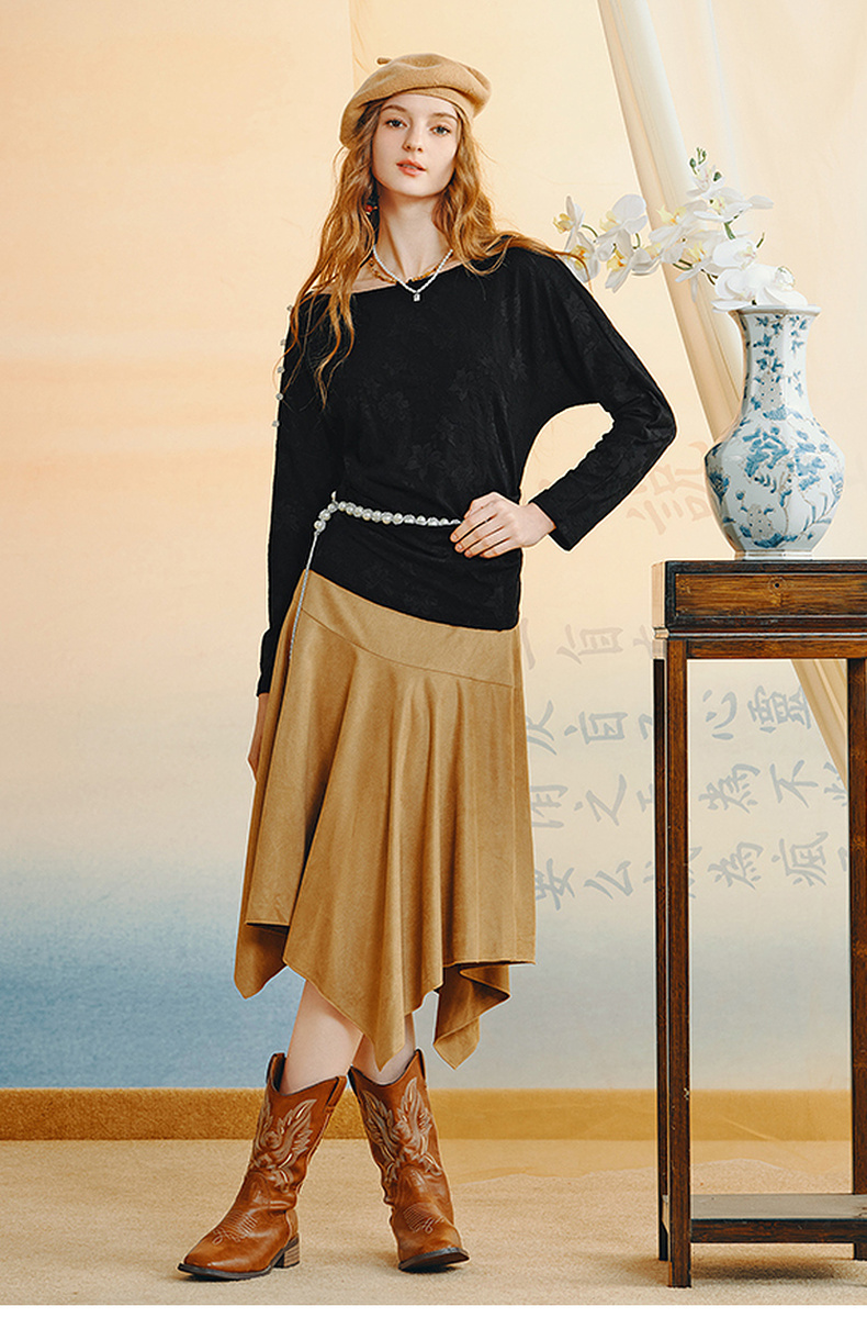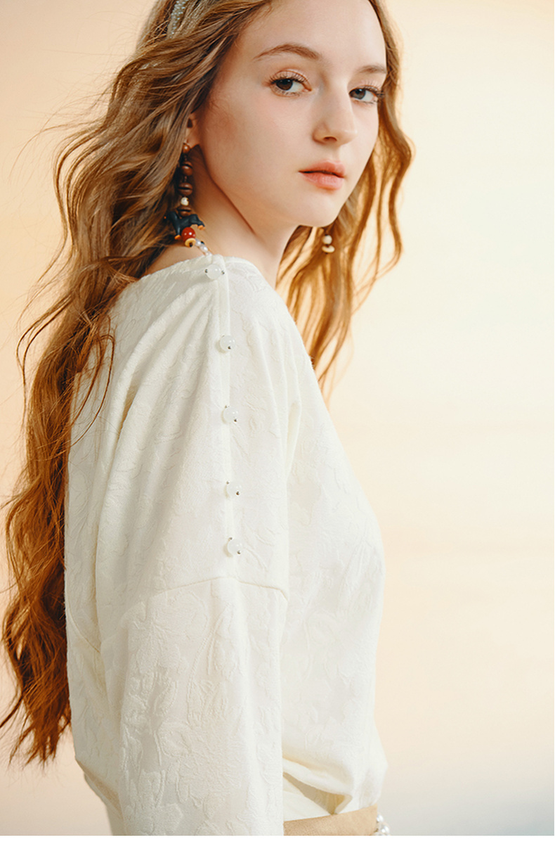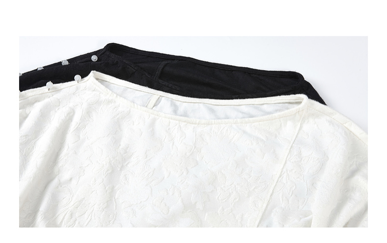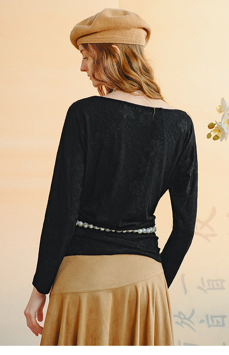 两三事 月涧星霜 2025秋季新款简约珠子装饰一字肩长袖t恤女