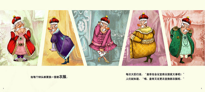 《皇帝的新装》形象传神,皇帝的虚荣傲慢,大臣的心怀鬼胎,骗子的狡猾,孩子的天真无畏一一跃然纸上,让人忍俊不禁。故事的语言也很滑稽,富有戏剧性,对白很符合人物性格,和画面相得益彰。