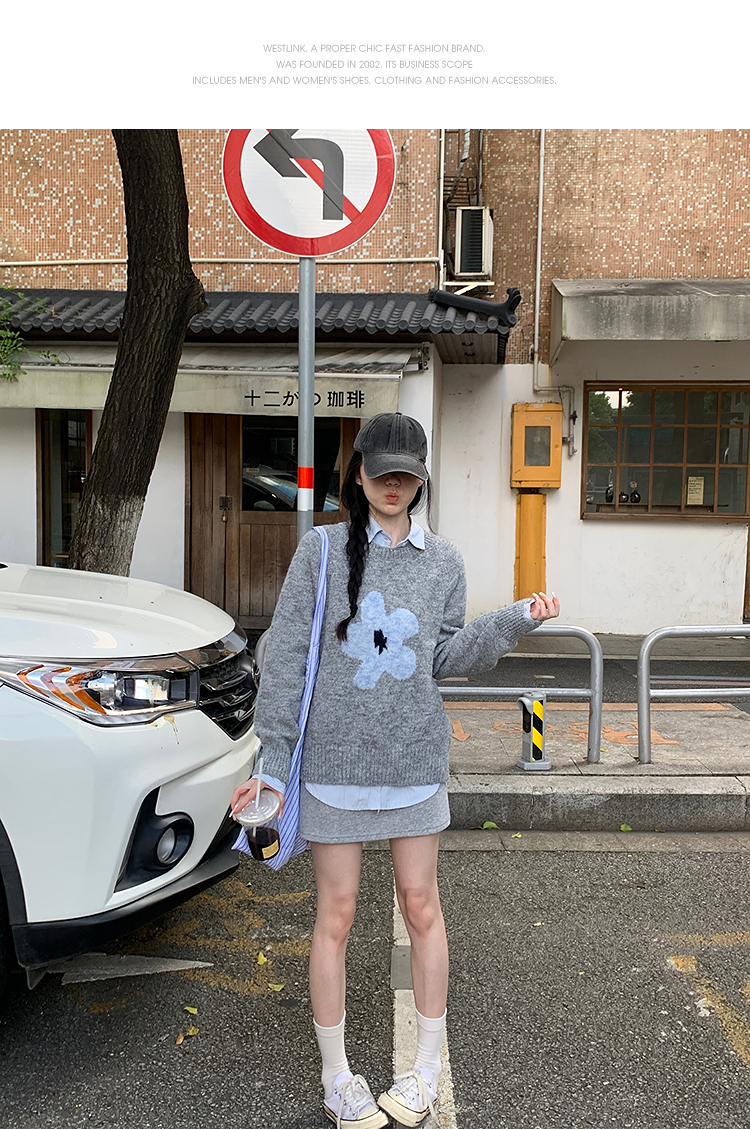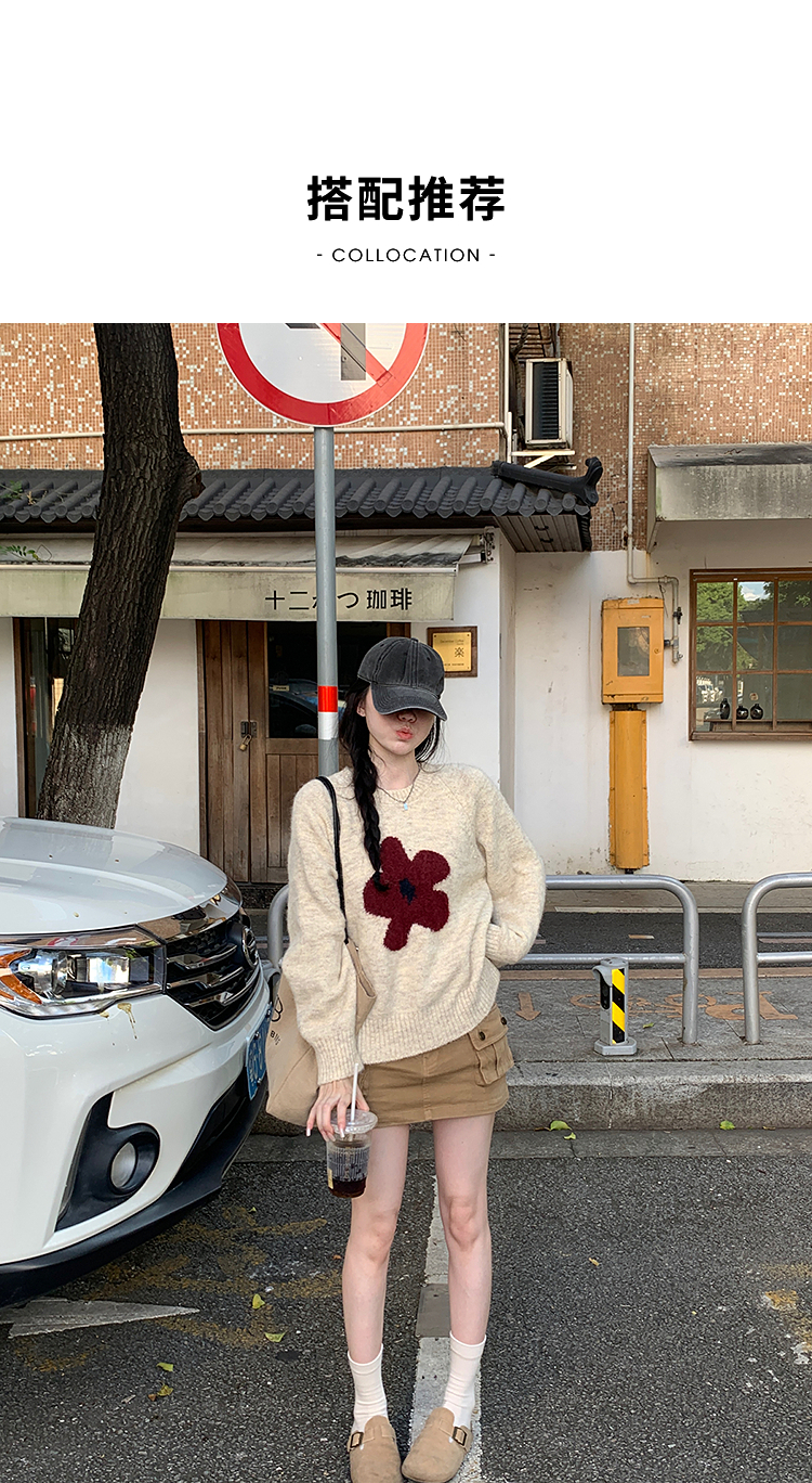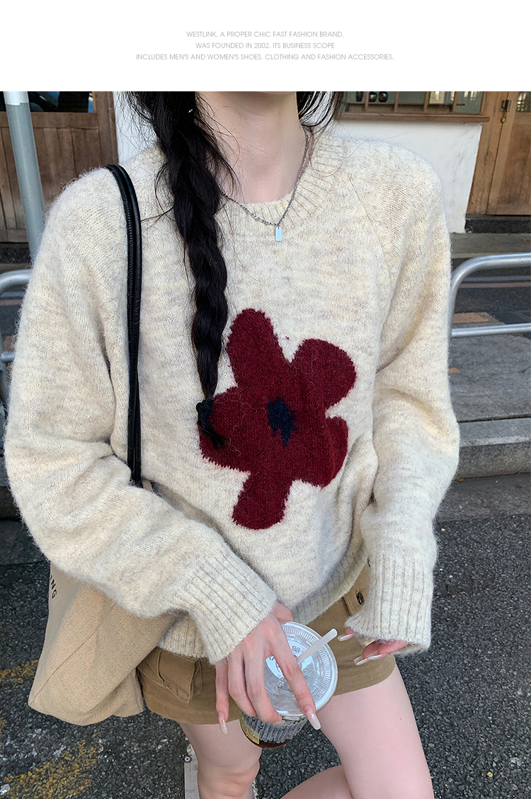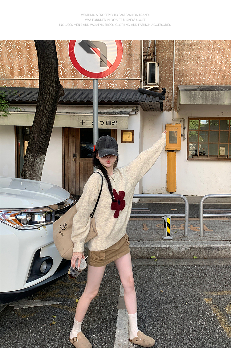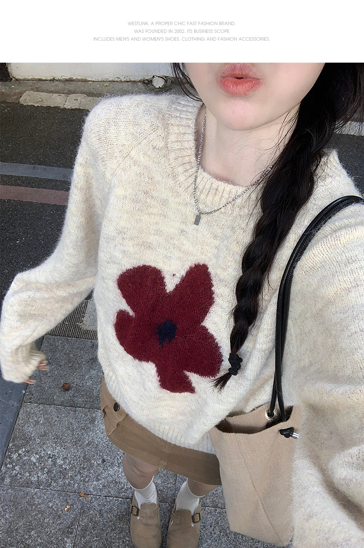 西遇套头毛衣女秋季新款慵懒松弛感花朵宽松圆领长袖针织衫SS051589