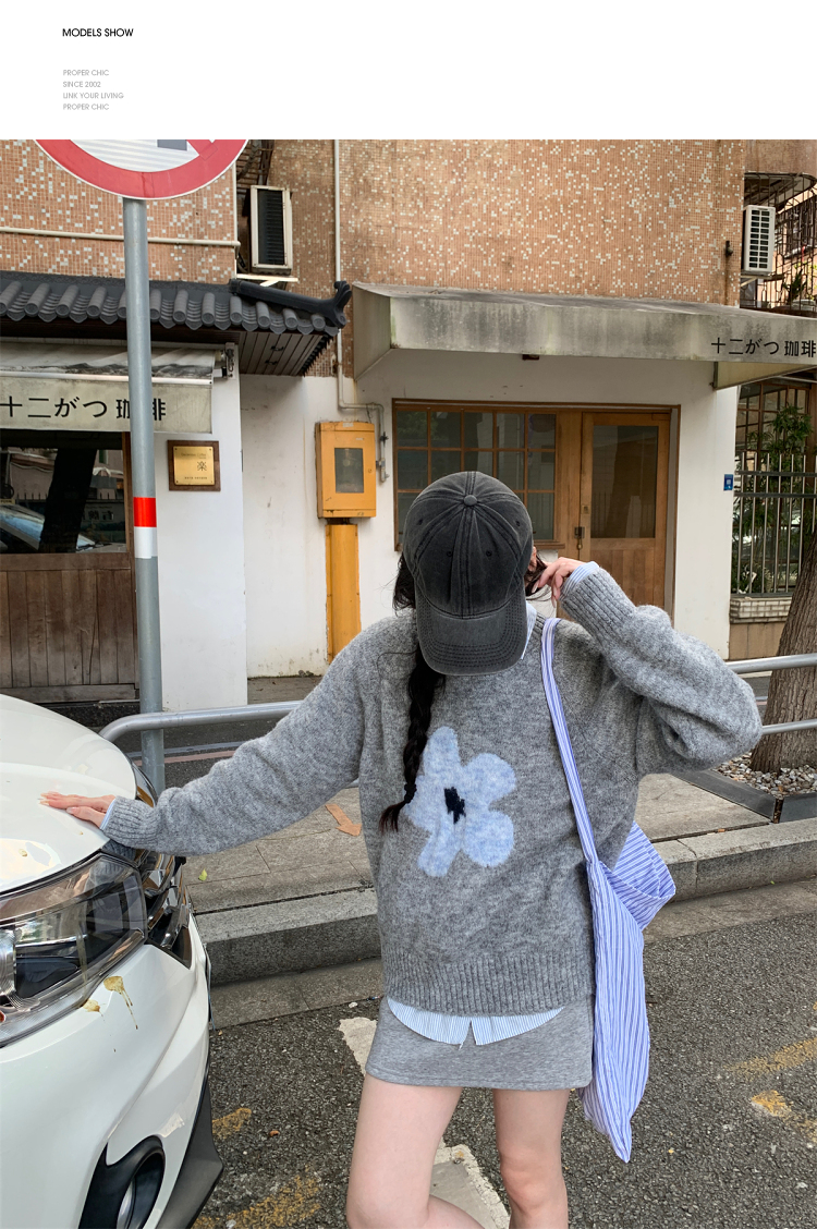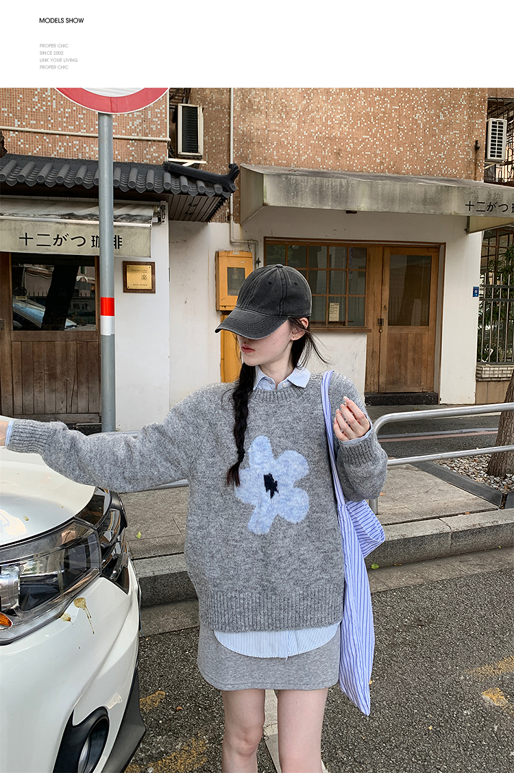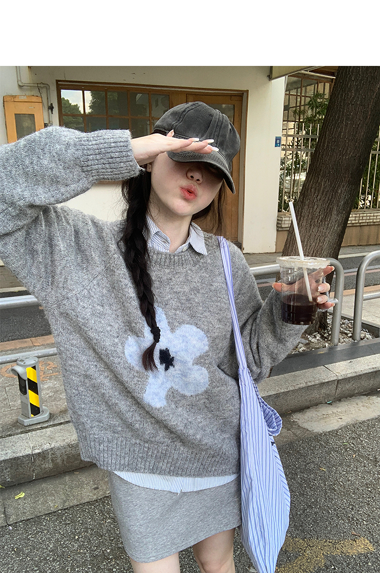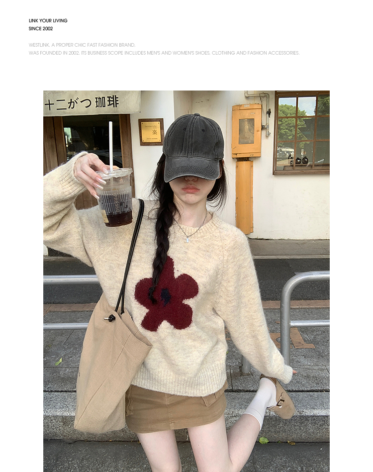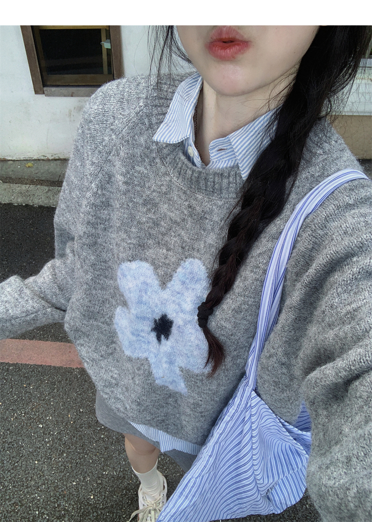 西遇套头毛衣女秋季新款慵懒松弛感花朵宽松圆领长袖针织衫SS051589