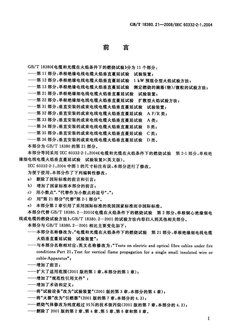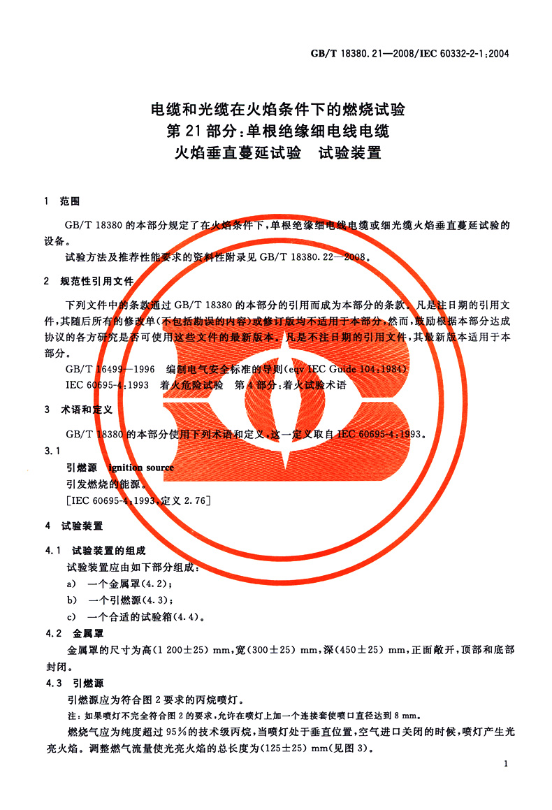 书名:速印不退 GB/T 18380.21-2008电缆和光缆在火焰条件下的燃烧试验 第21部分:单根绝缘细电线电缆火焰垂直蔓延试验 试验装置