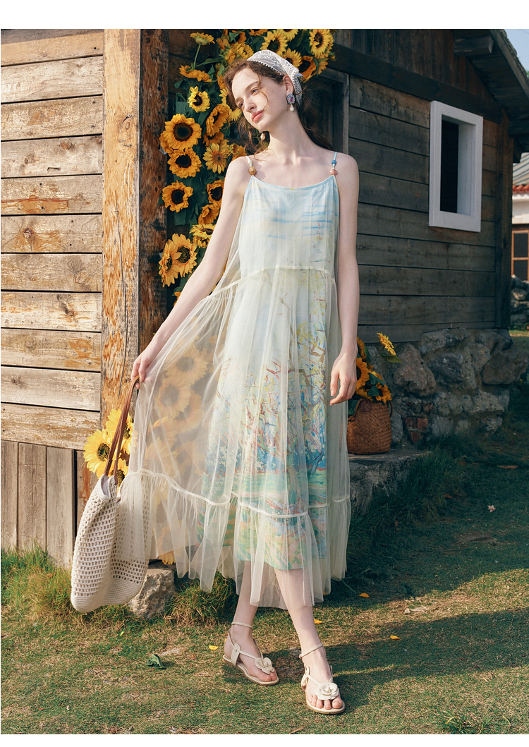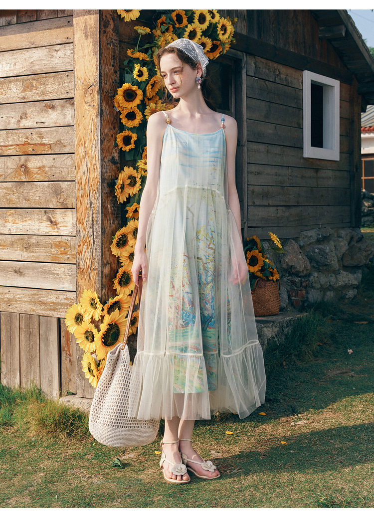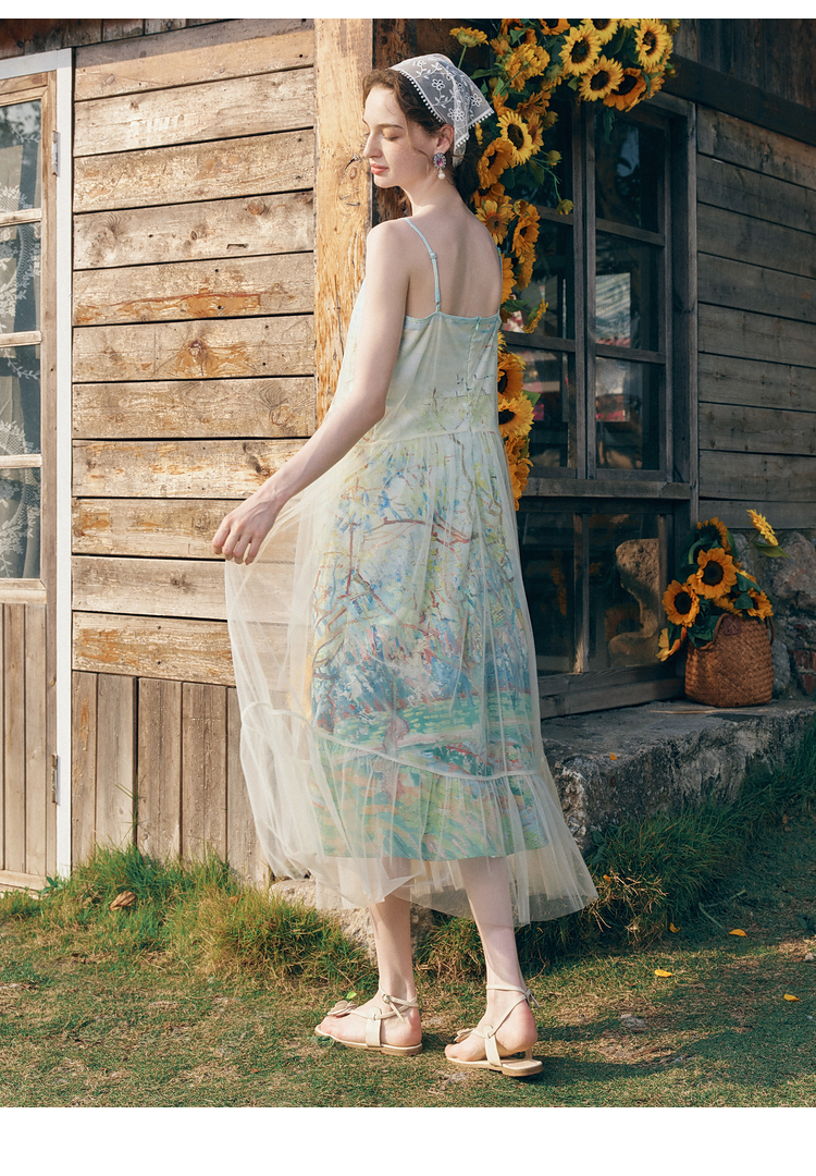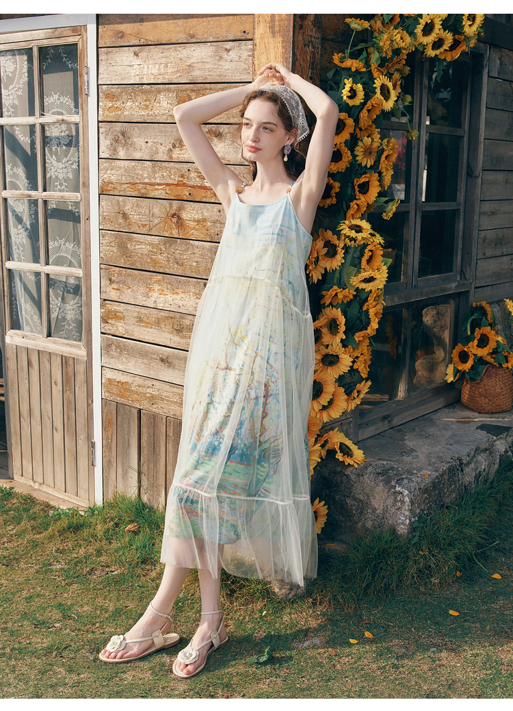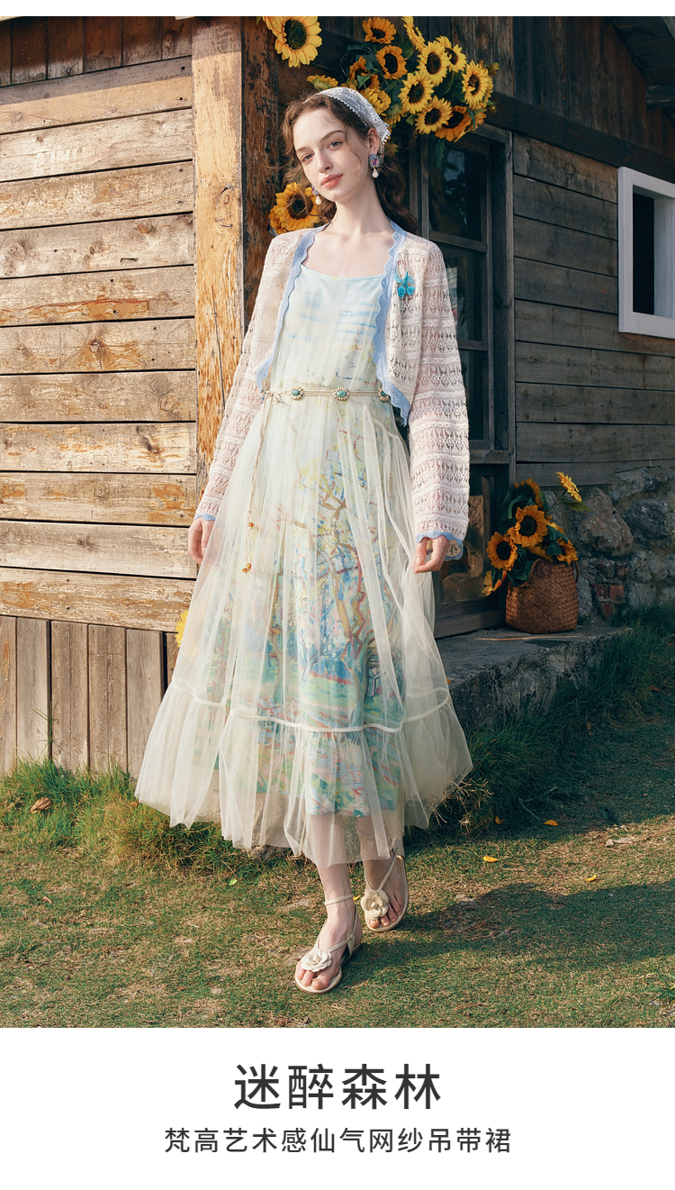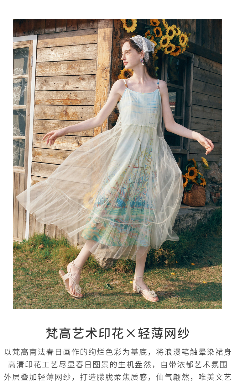 两三事梵高文艺迷醉森林2026春新款复古网纱拼接印花吊带裙连衣裙