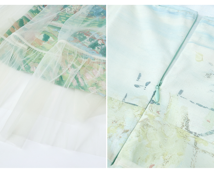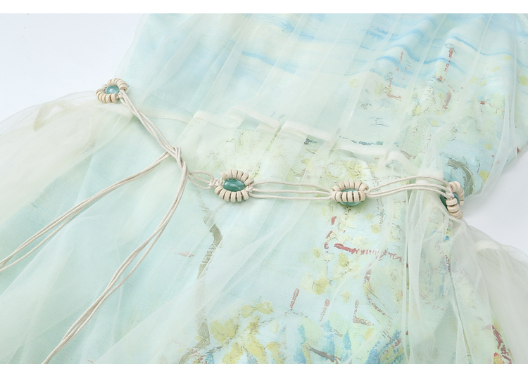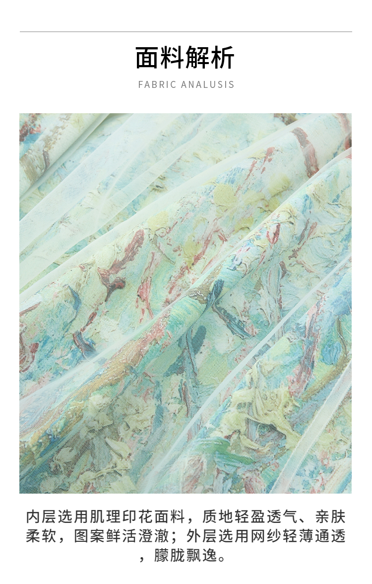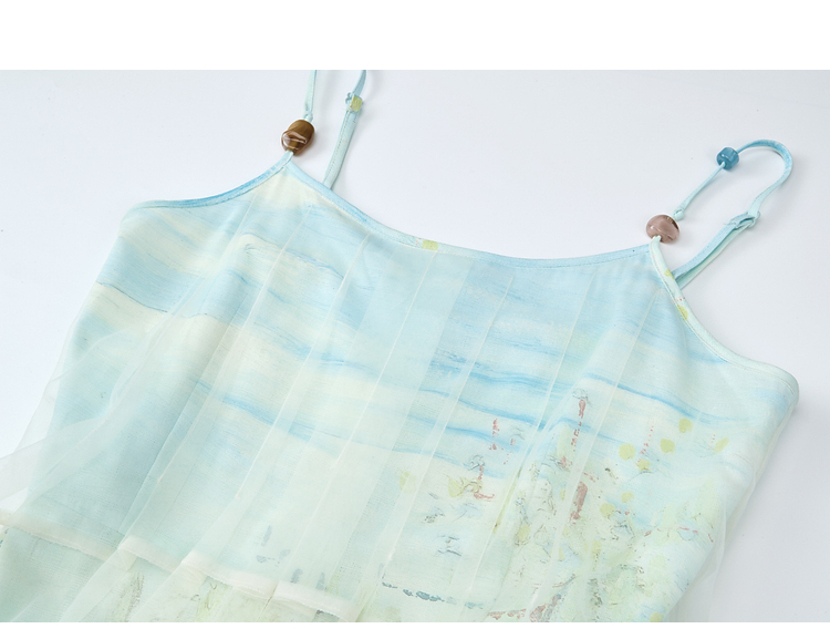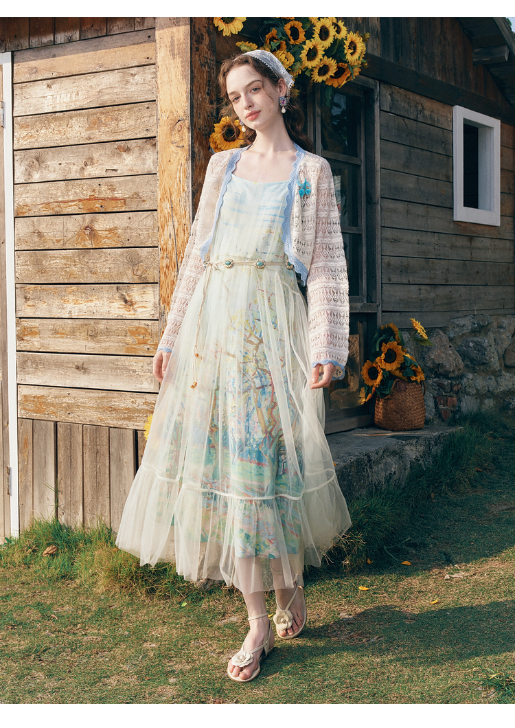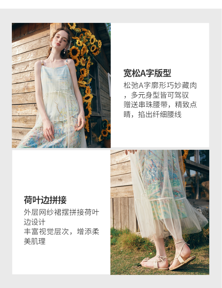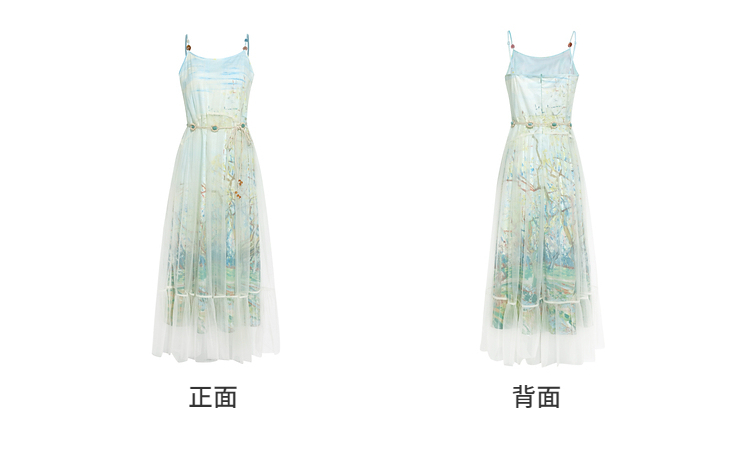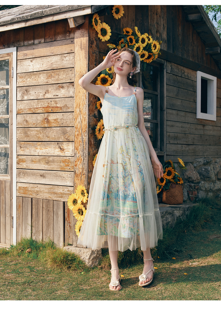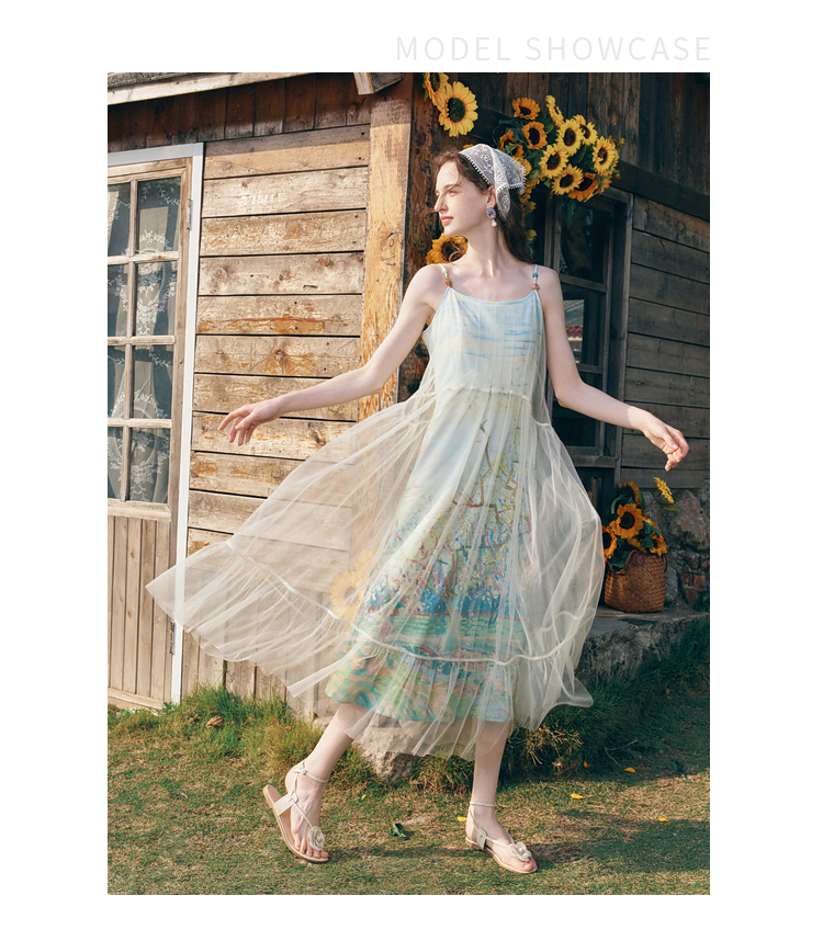 两三事梵高文艺迷醉森林2026春新款复古网纱拼接印花吊带裙连衣裙