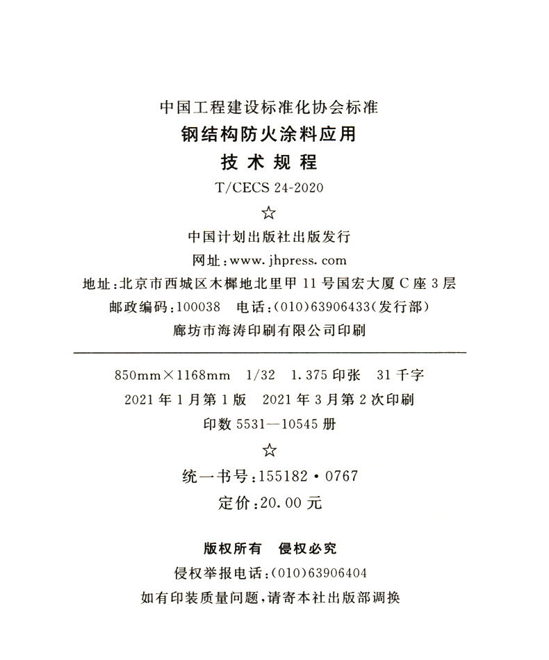 书名:防火涂料标准 T/CECS 24-2020 钢结构防火涂料应用技术规程