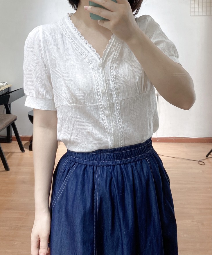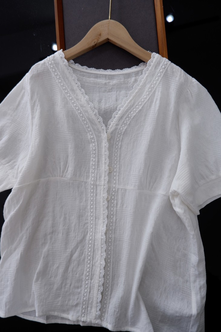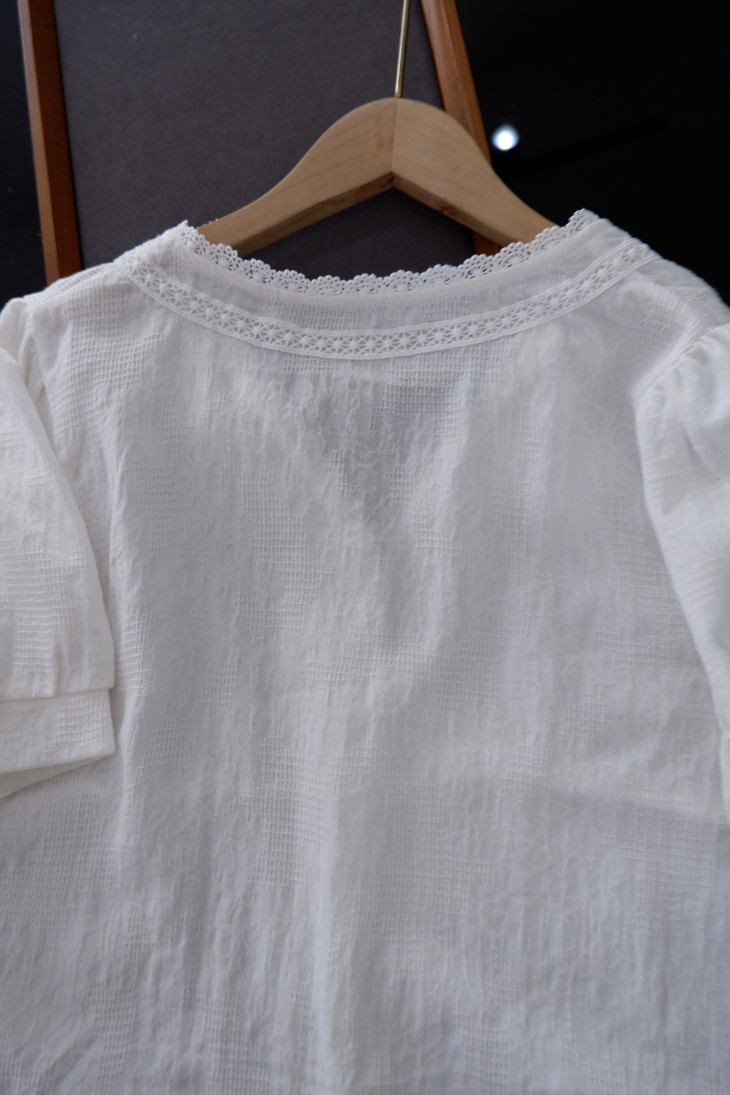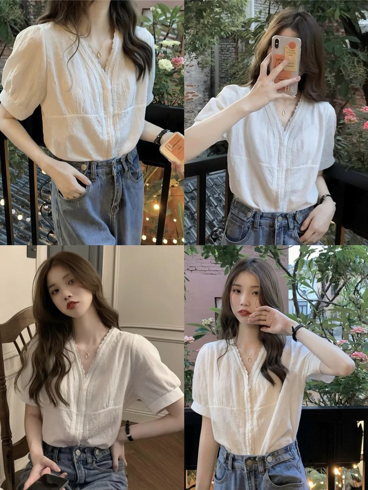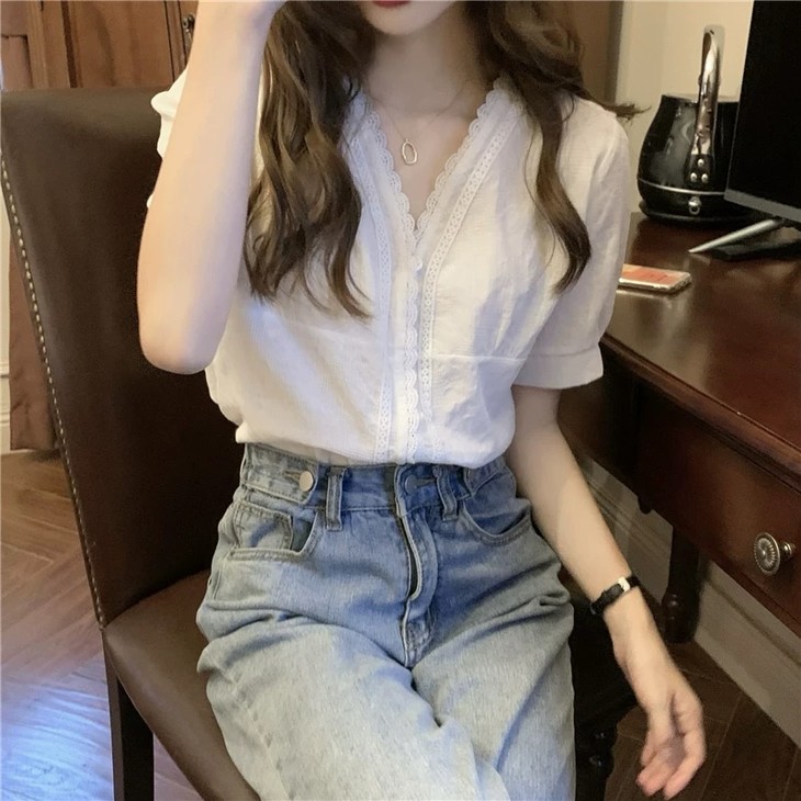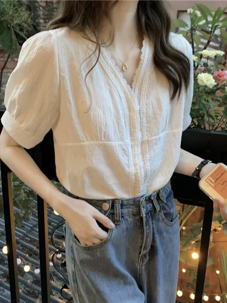 💰85元包邮, 【2387】法式泡泡袖100%棉肌理小众设计感V领短袖衬衫 温柔法式风的一款衬衫上身也太仙气了吧 肌理蕾丝衬衫 ,轻盈有质感