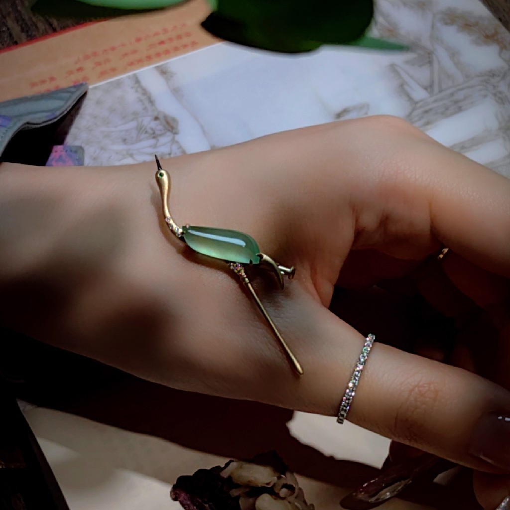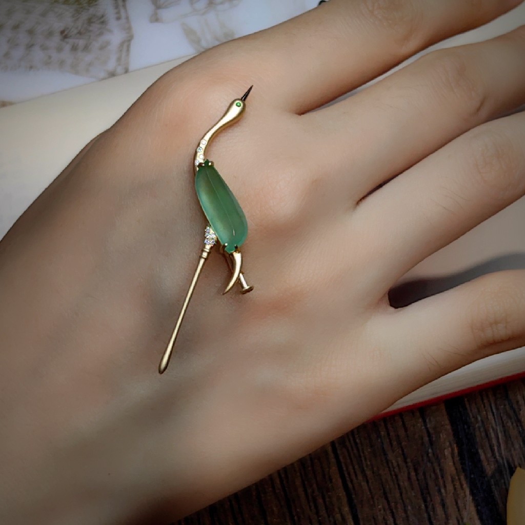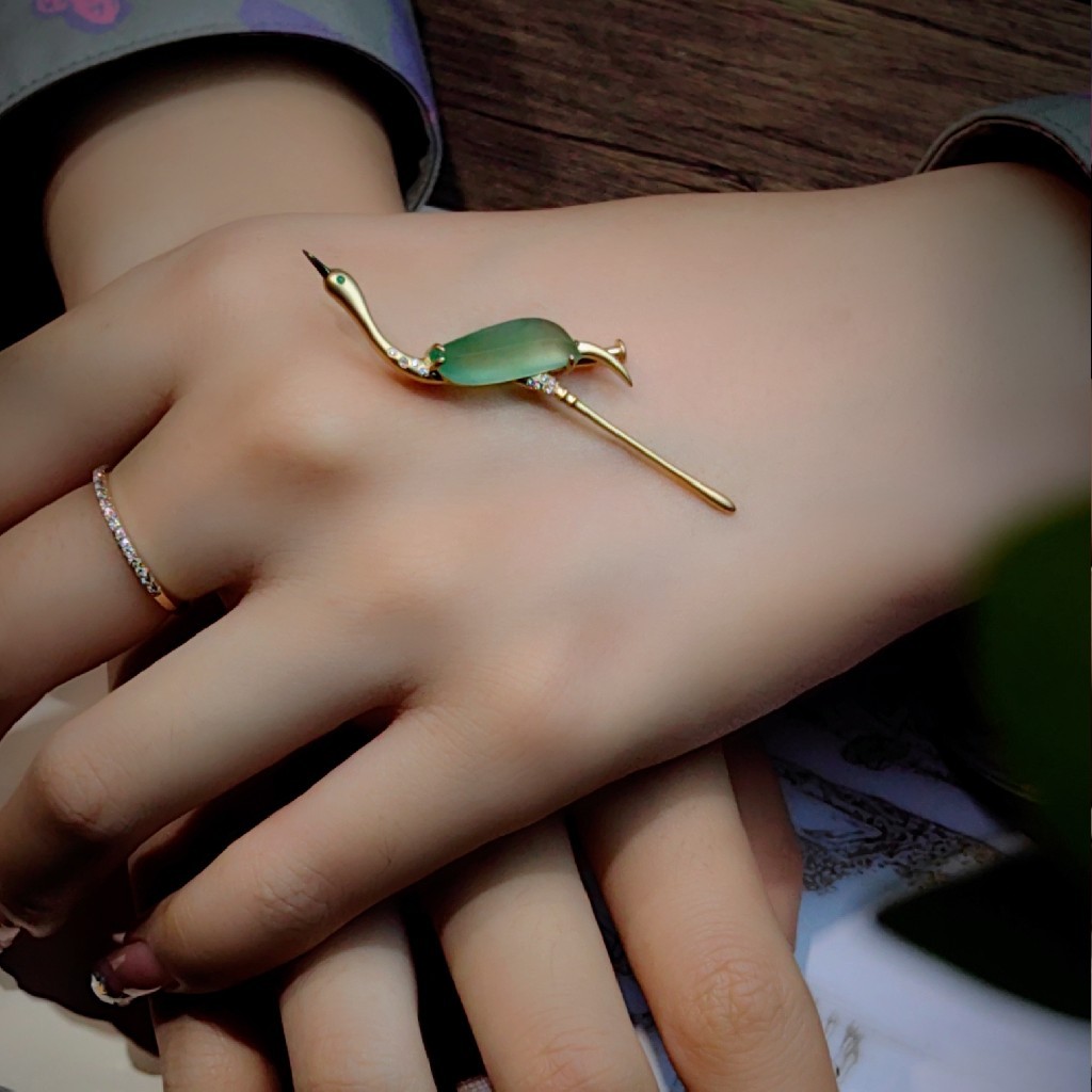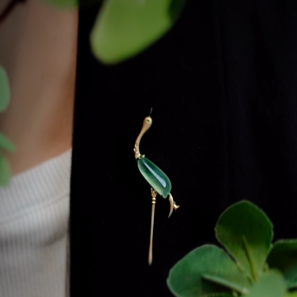戴在胸前,一只优雅仙鹤胸针,企足引颈的姿态,尽显优雅大方。既有复古的传统美好,又加入了现代时尚元素,是难得的的小精品。