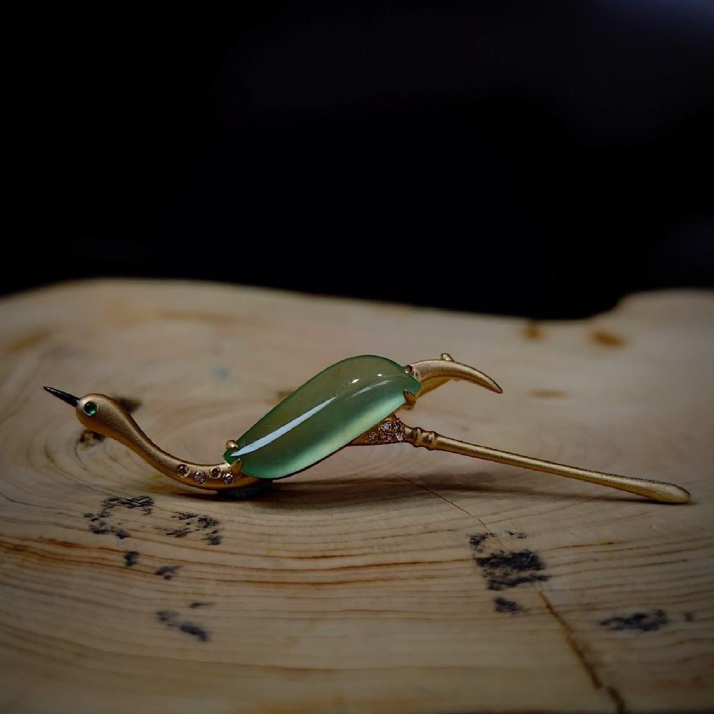 这次机缘巧合,遇到这枚种水非常出色的晴水色异形翡翠戒面,大小刚好用于定制“鹤望”胸针。于是又复刻了一只~小仙鹤。