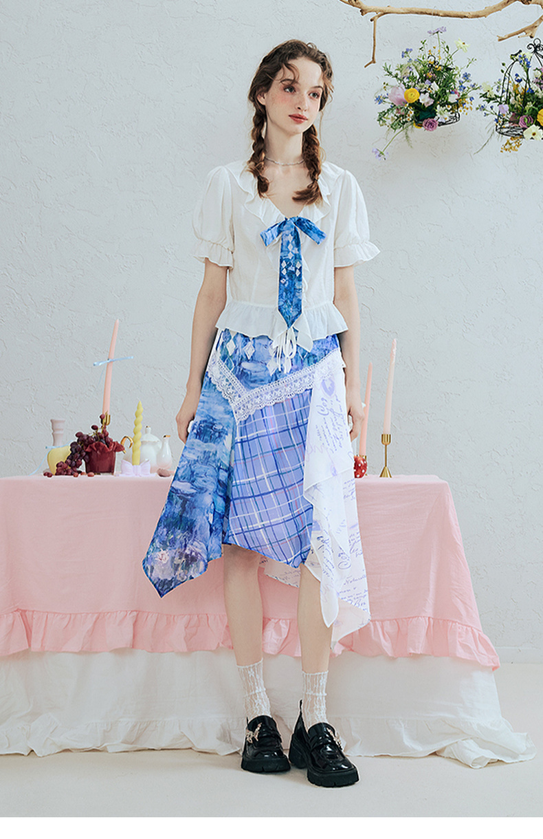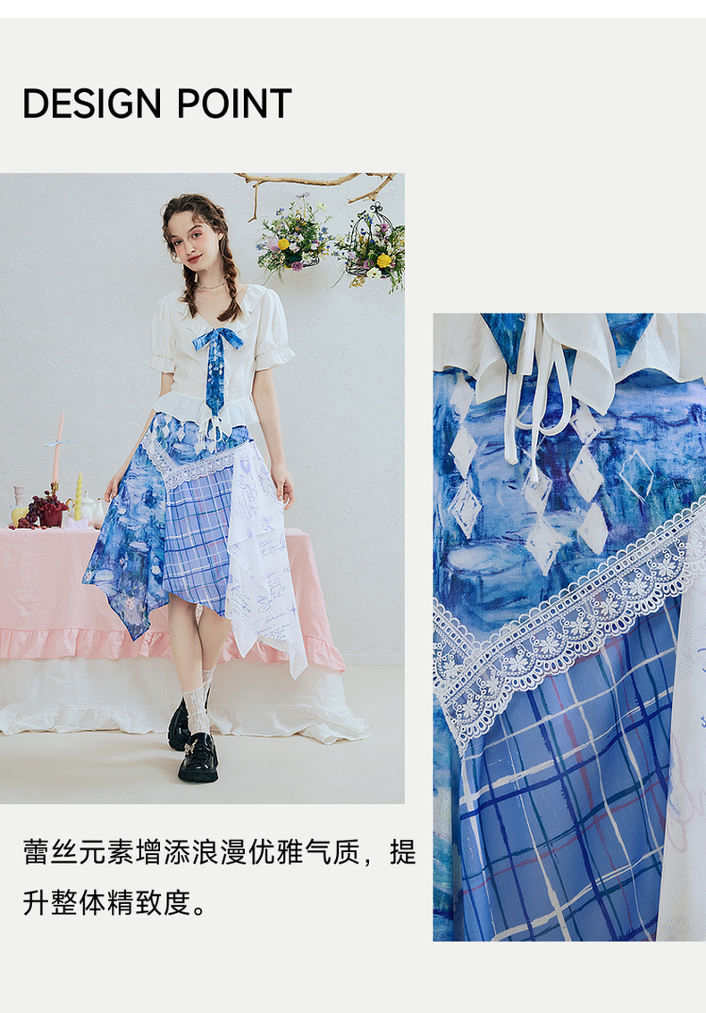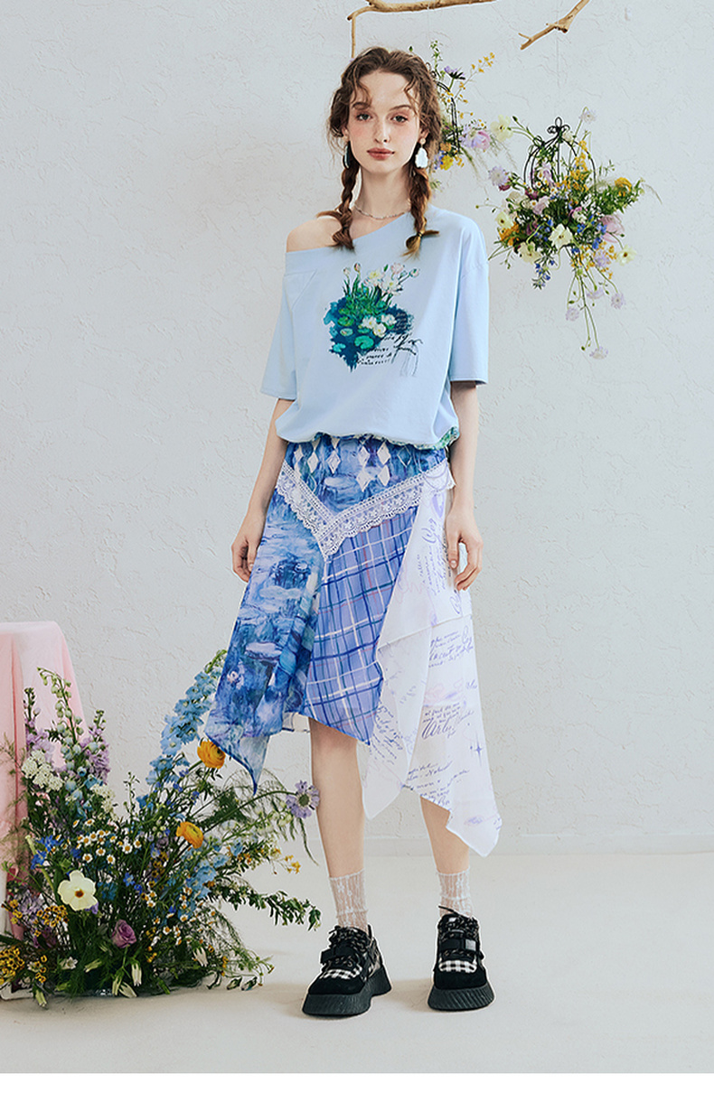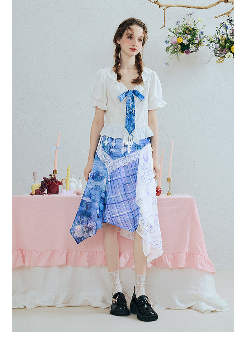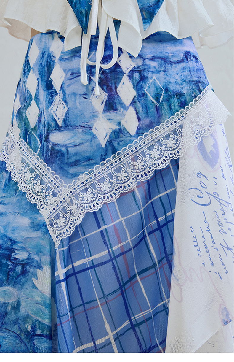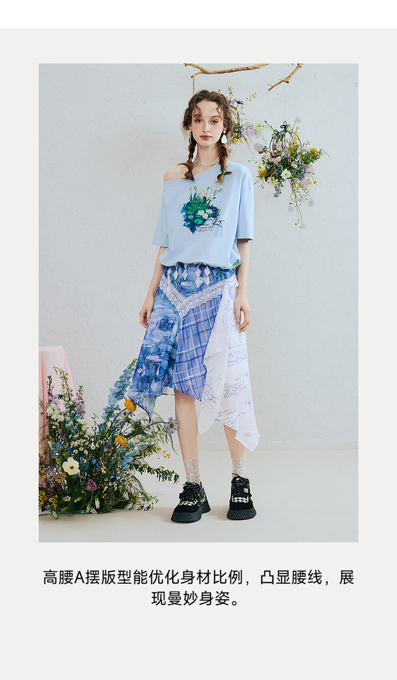 两三事 花田错 2025夏季新款复古格子印花蕾丝拼接不规则半身裙