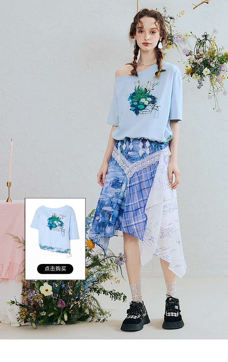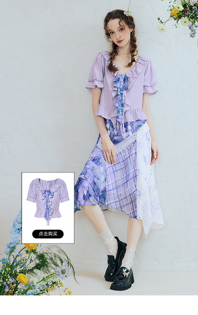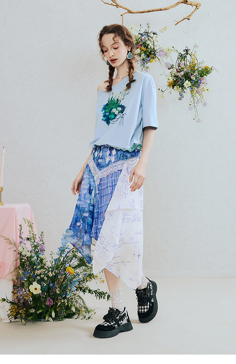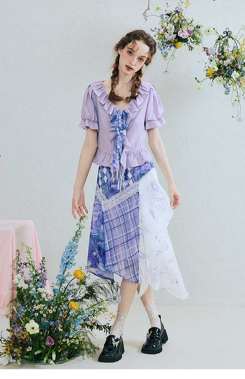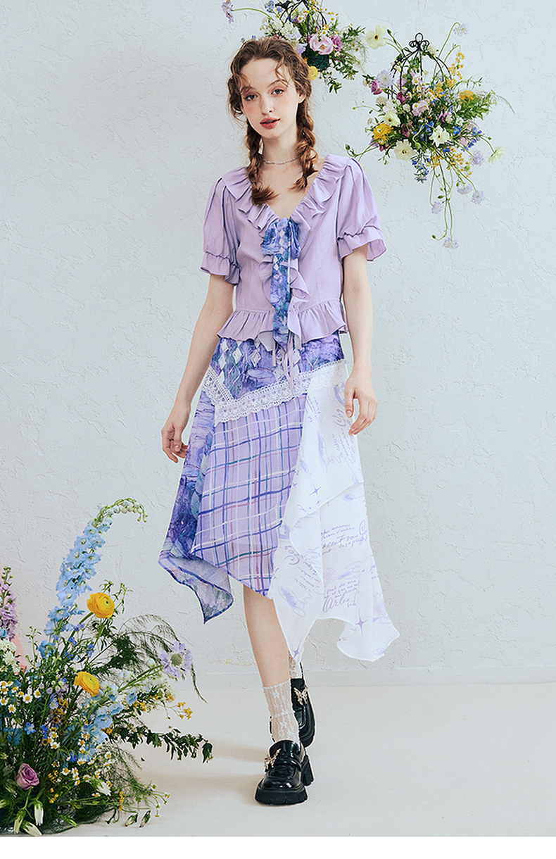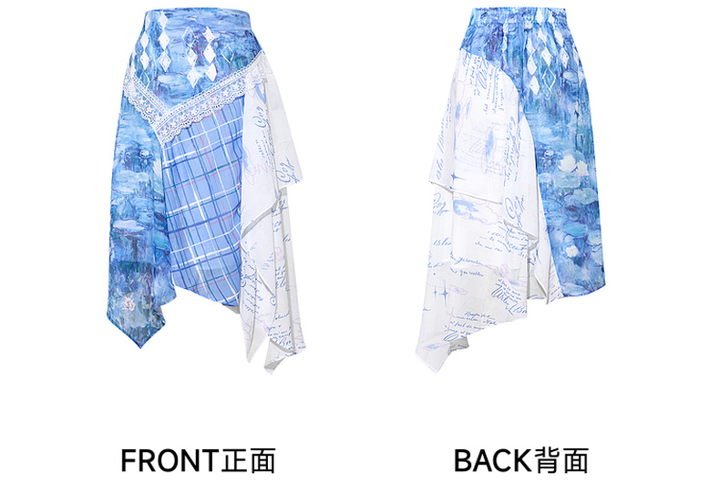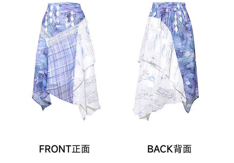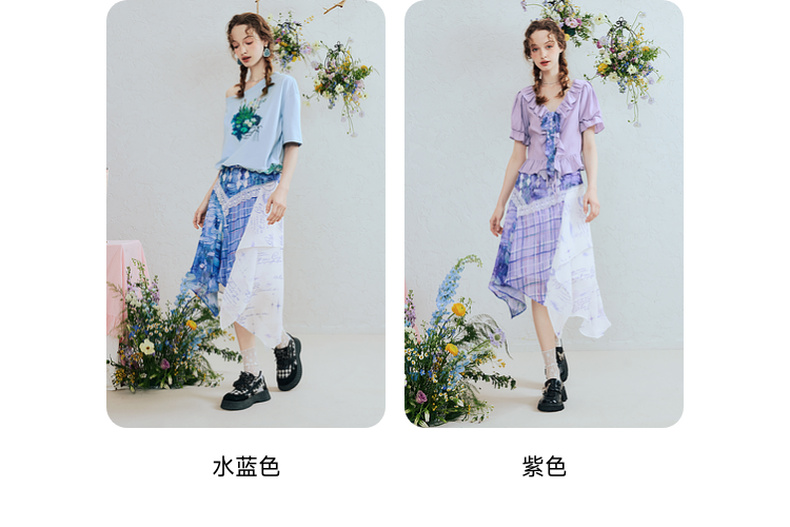 两三事 花田错 2025夏季新款复古格子印花蕾丝拼接不规则半身裙