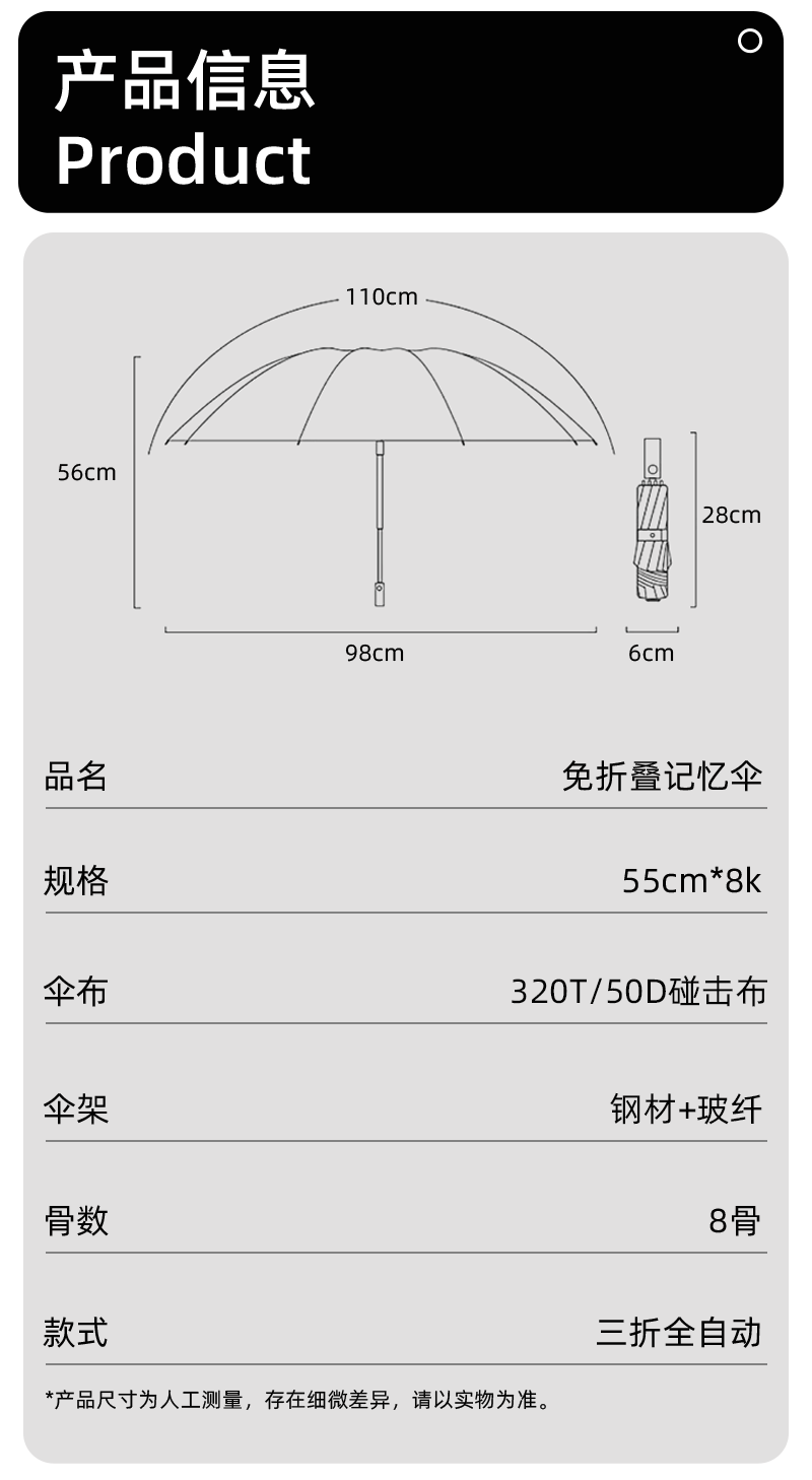【防晒好物丨自动记忆雨伞+mini六折晴雨伞系列】轻量设计黑胶全波段防晒,有效阻隔有害光线,加固伞骨抗风且不易生锈,伞身轻巧便捷,加宽束带方便收纳,配色设计简约高级时尚,多色可选